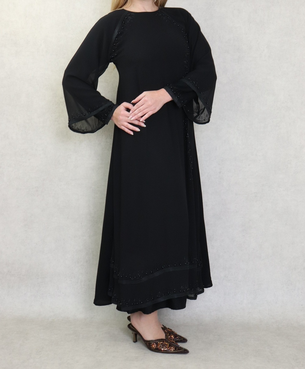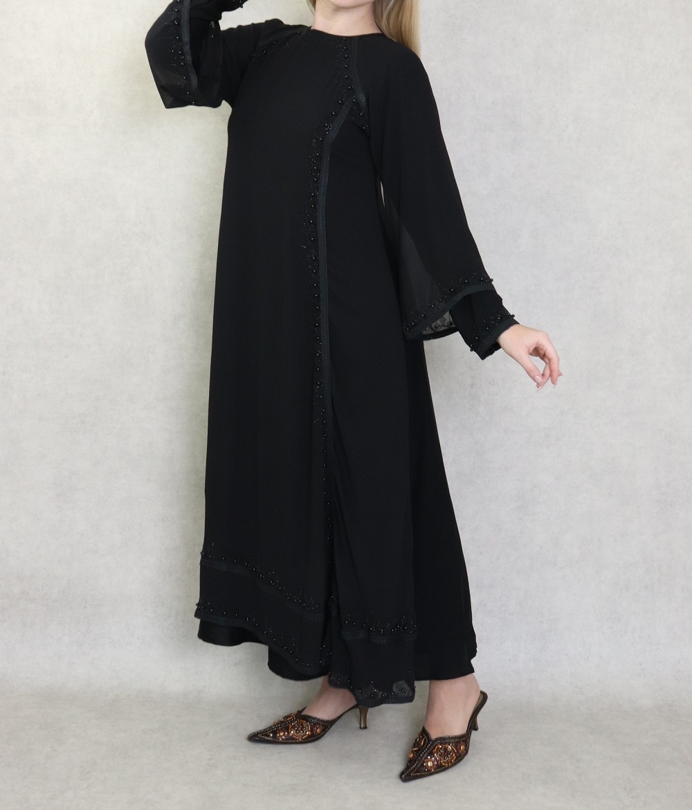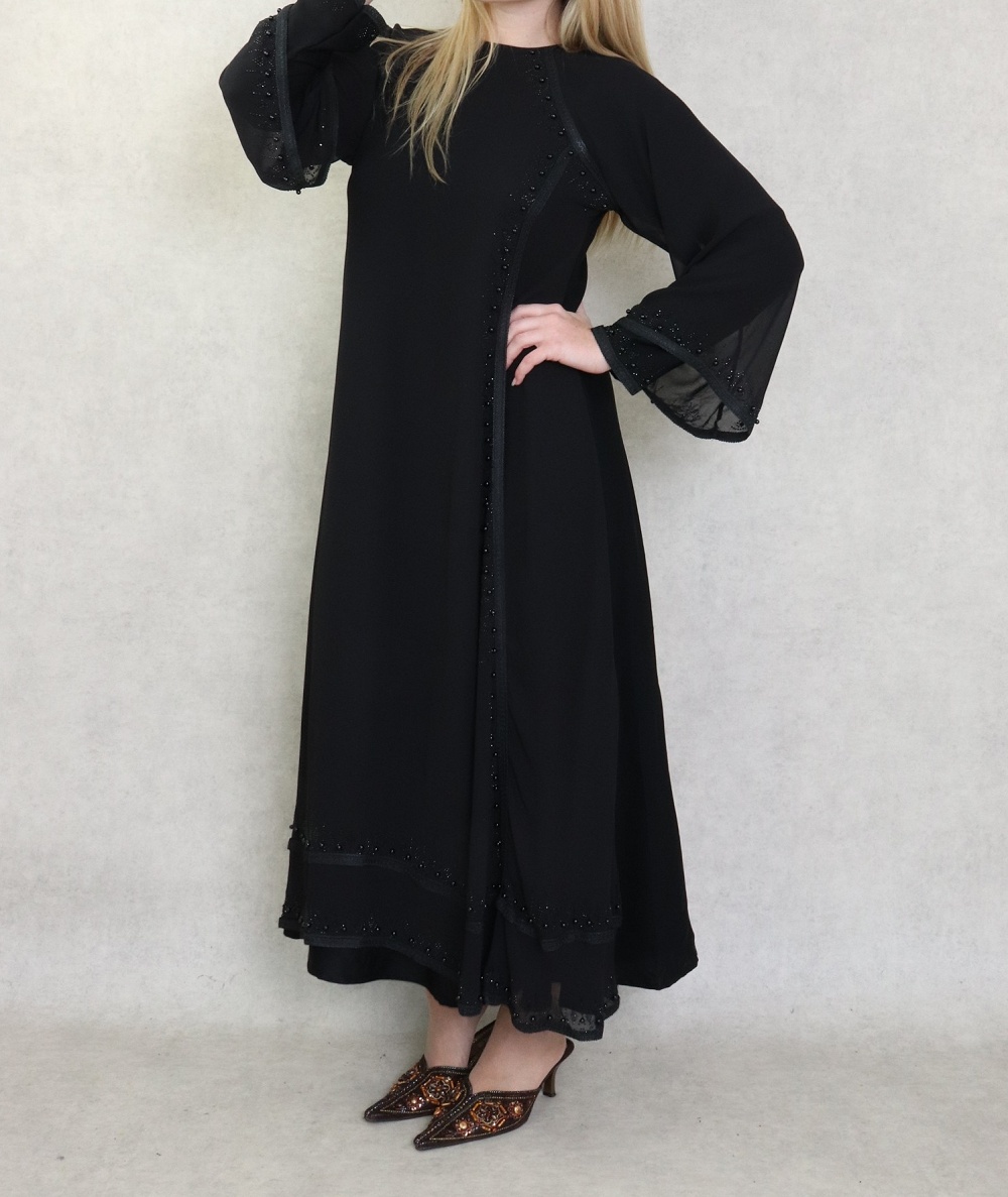 Robe Abaya Dubaï noire de qualité avec nombreuses perles noires et strass - REF. 38118 (45.00 €)