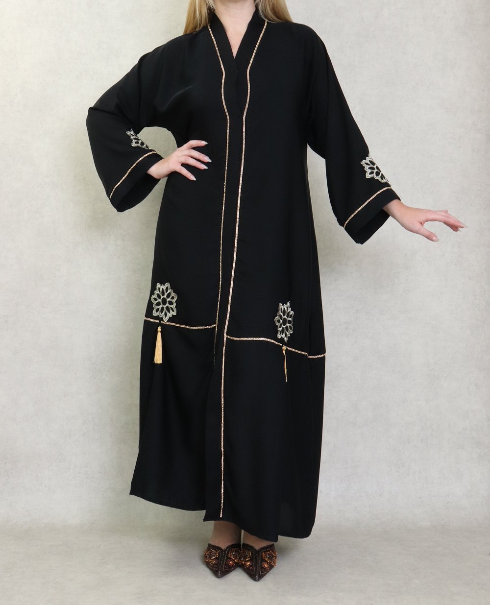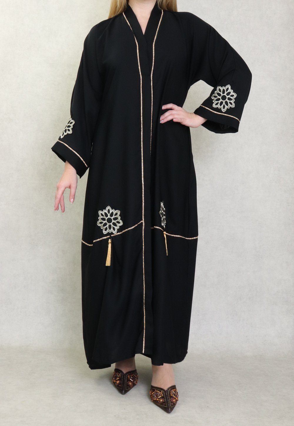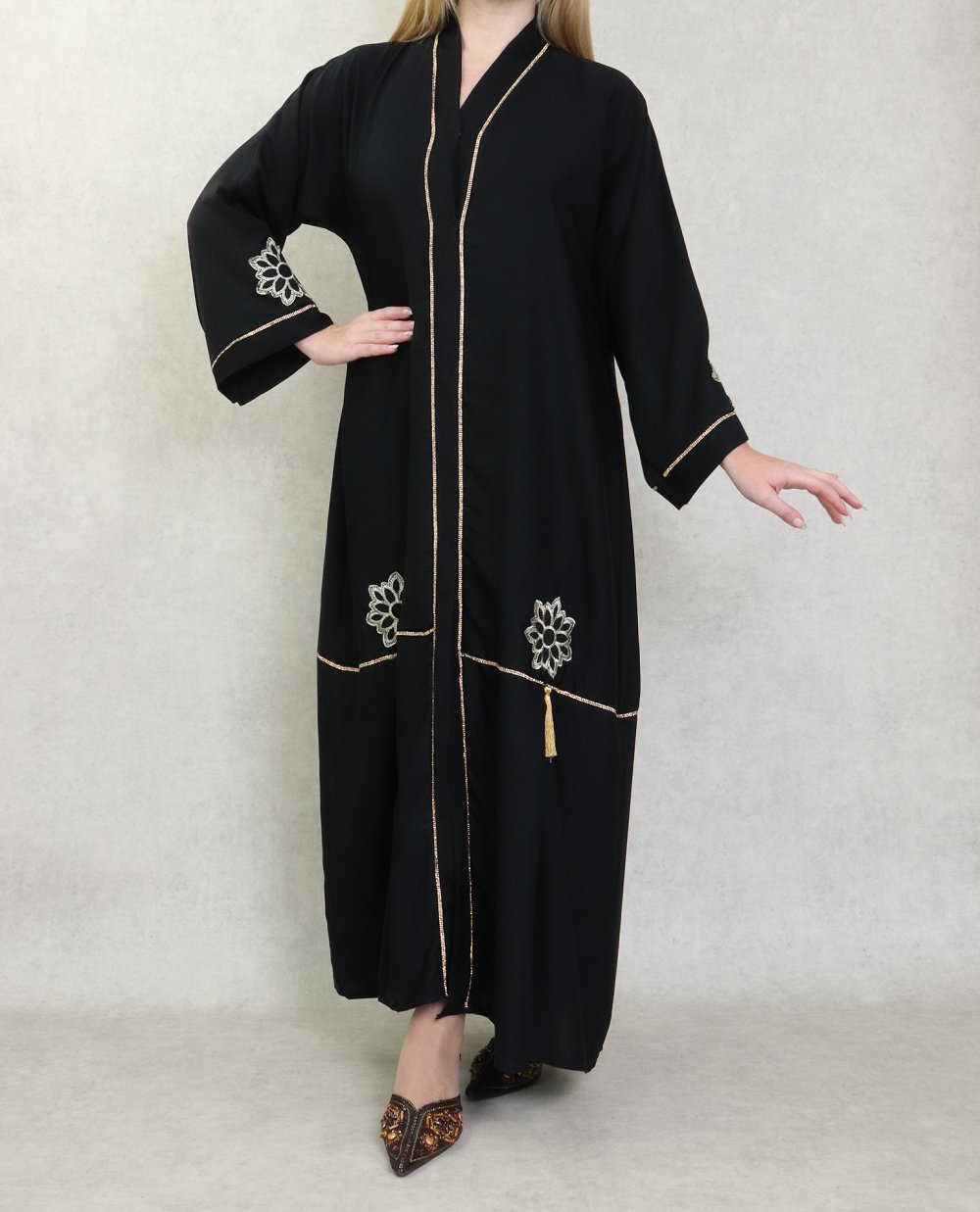 Robe Abaya Dubaï de qualité avec motifs strass dorés sur le devant et les manches - Couleur noir - REF. 38179 (39.90 €)