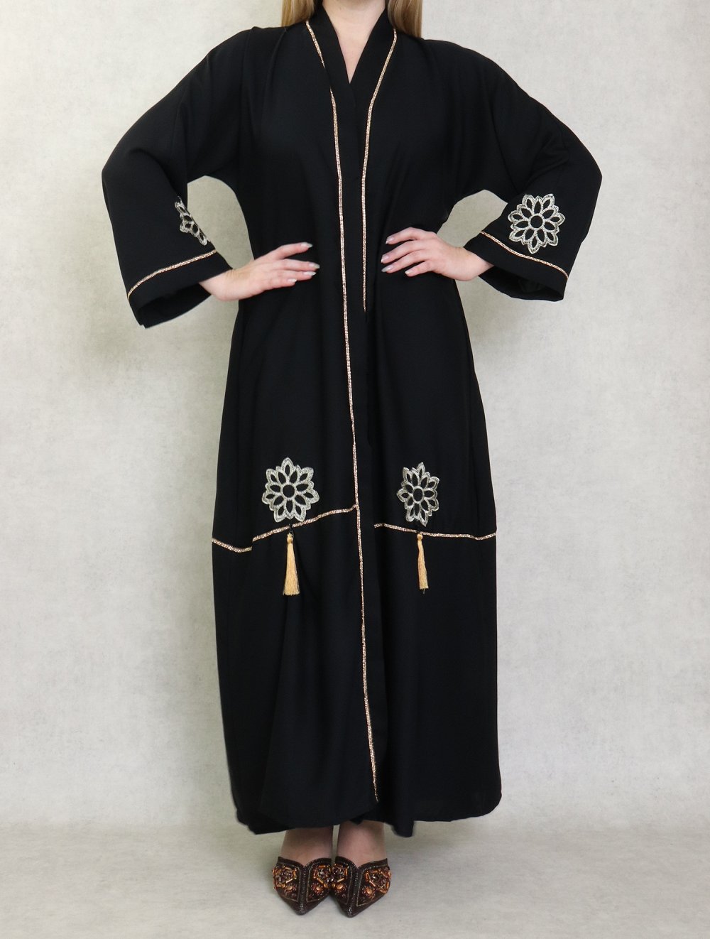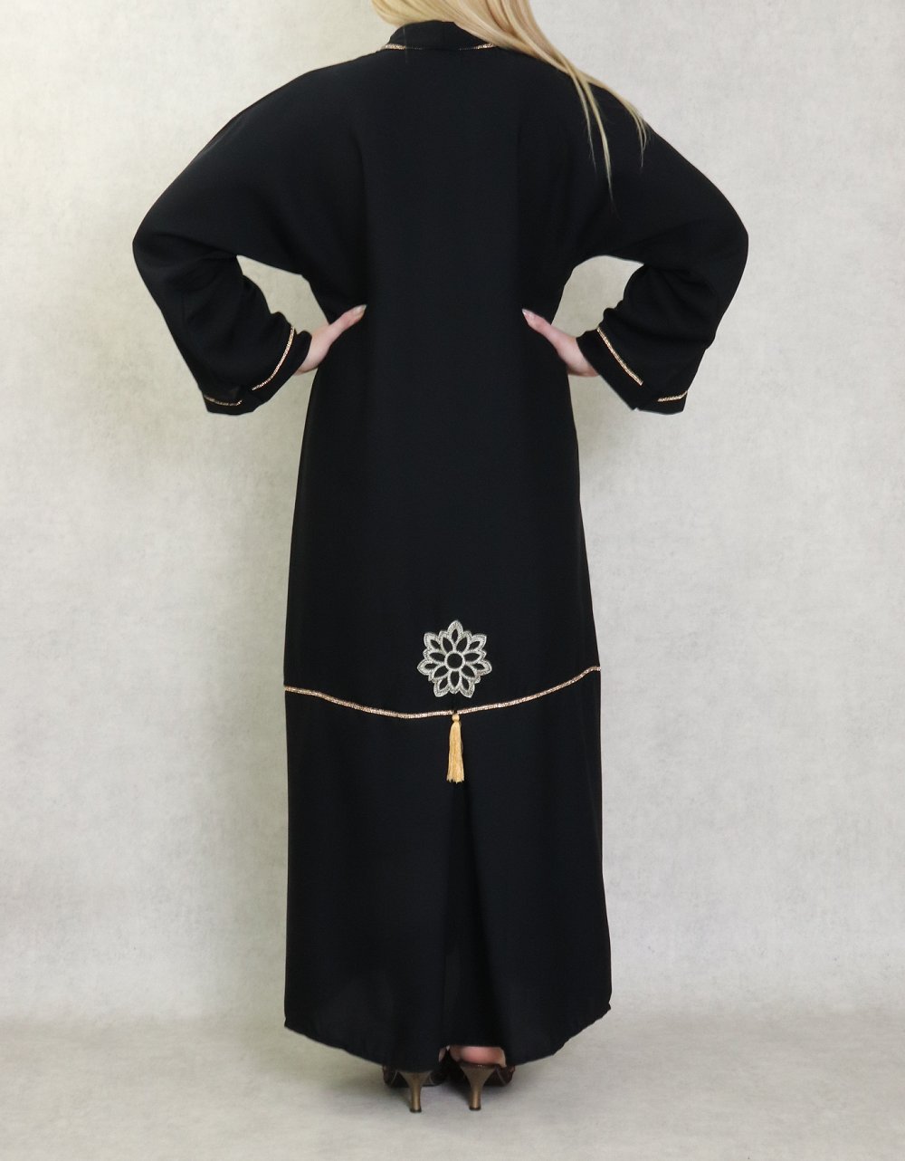 Robe de soirée Abaya Dubaï de qualité avec pompons, strass dorés et broderies - Couleur noir - REF. 38178 (45.00 €)
