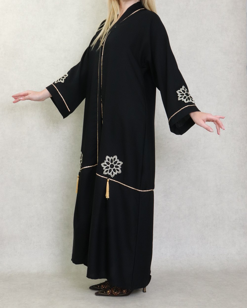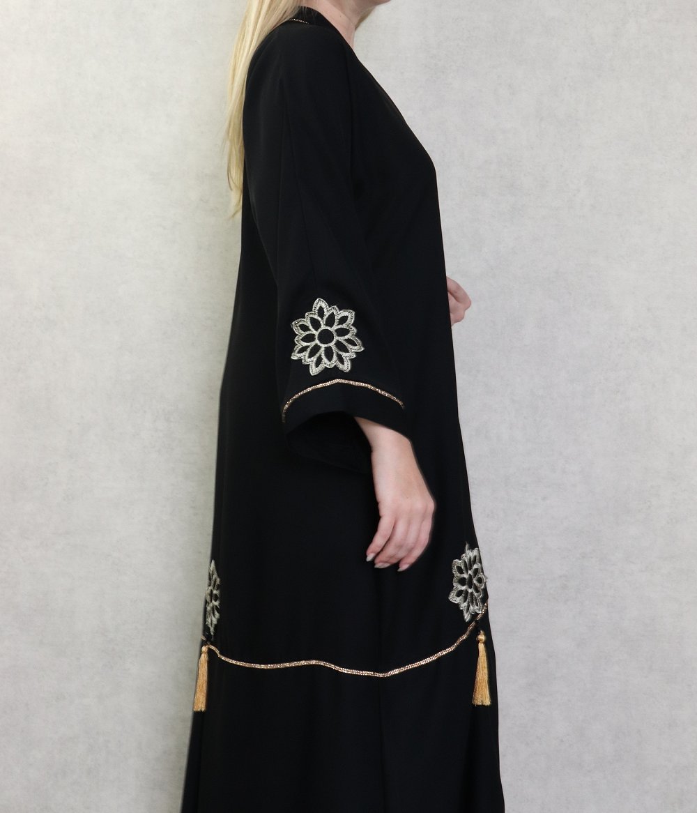 Robe Abaya Dubaï noire de qualité avec broderie et strass dorés et ceinture interne - REF. 38193 (39.90 €)