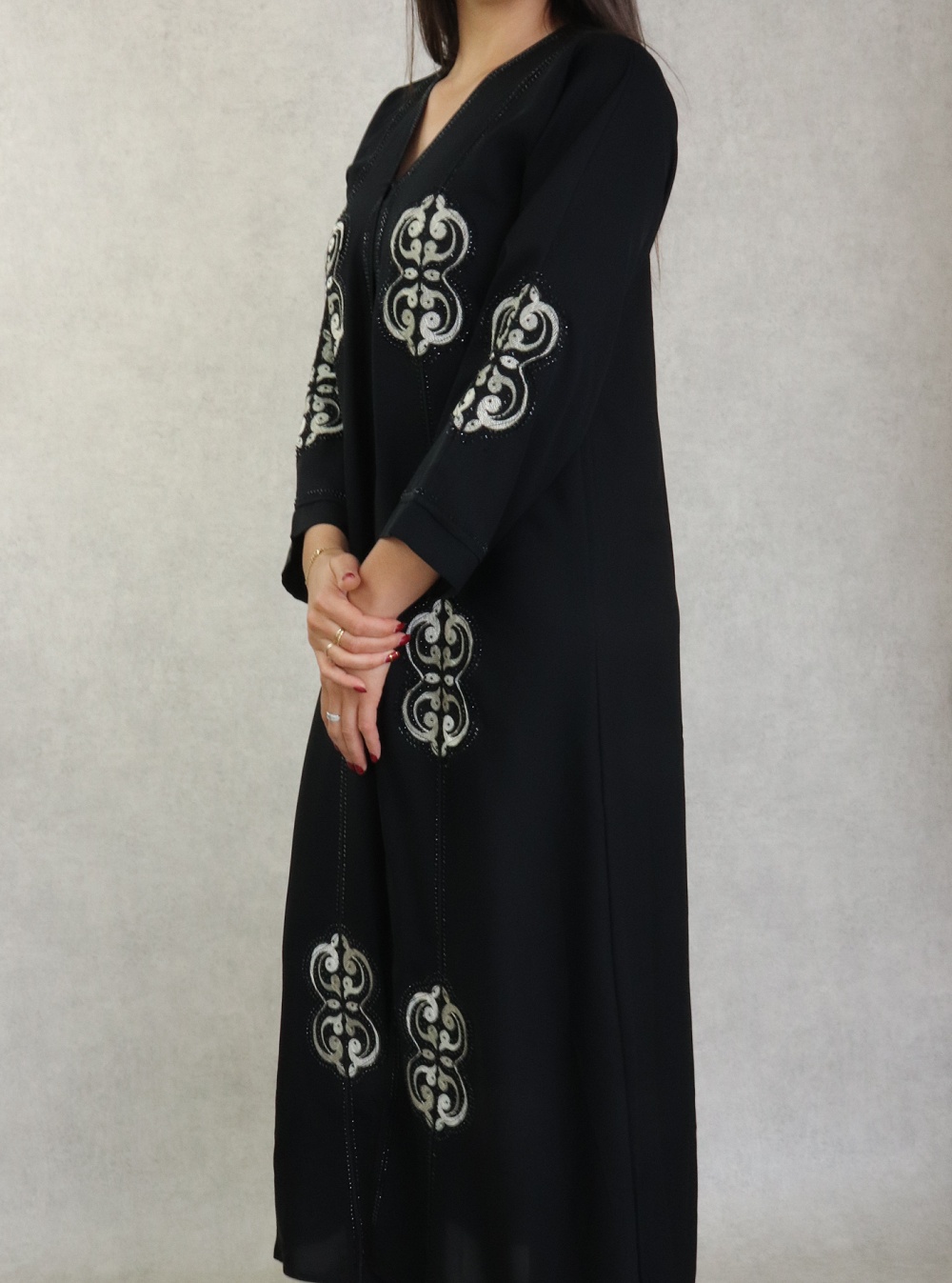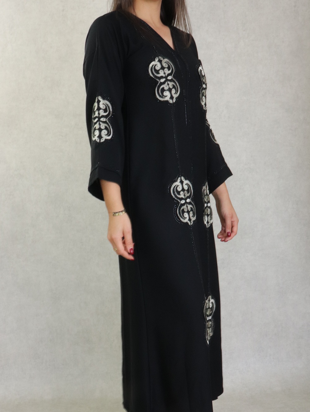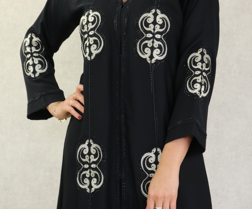 Robe de soirée Abaya Dubaï noire de qualité avec broderie perles et strass argentés - REF. 38190 (49.00 €)