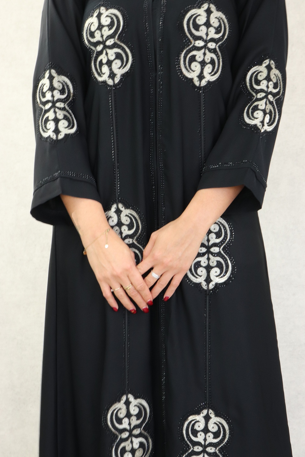 Robe Abaya Dubaï noire de qualité avec bande brodée et strass et perles argentées - REF. 38189 (45.00 €)