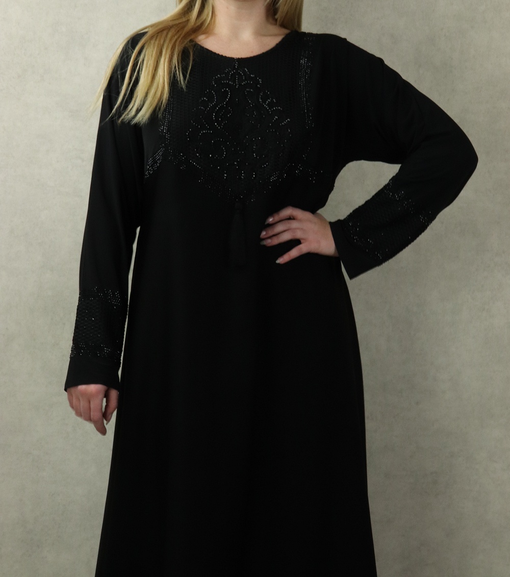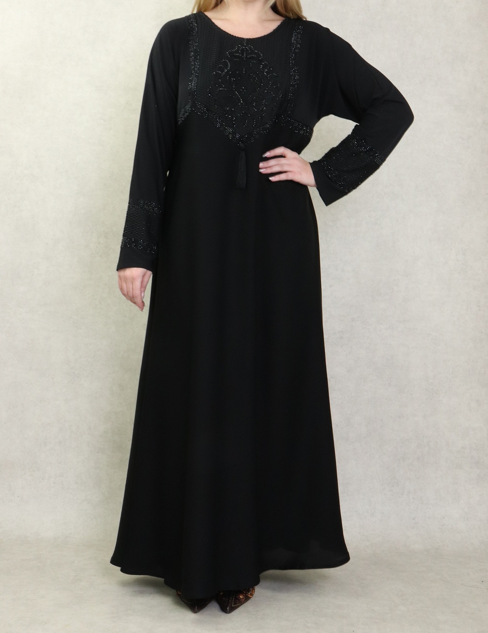 Robe Abaya Dubaï noire de qualité avec nombreuses perles noires et strass - REF. 38118 (45.00 €)