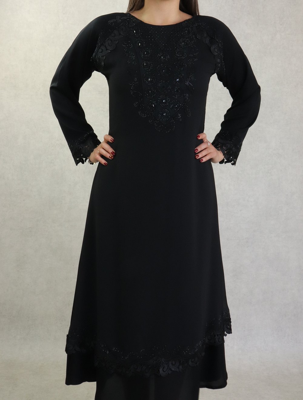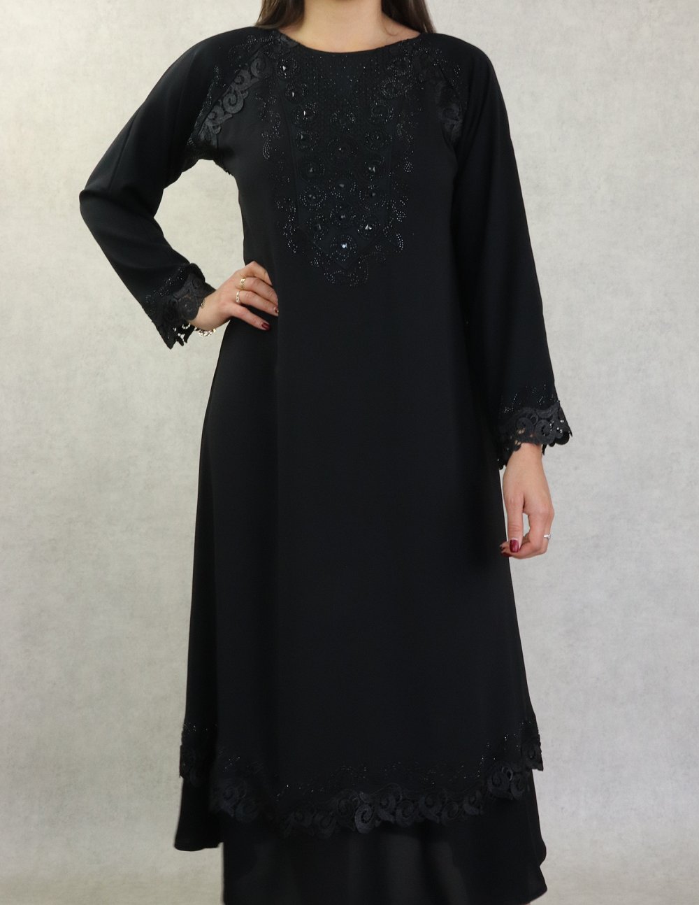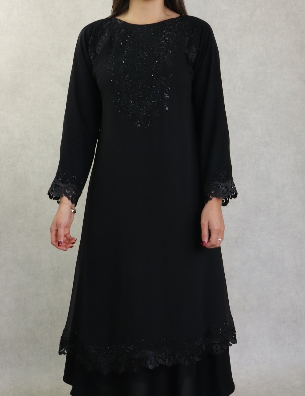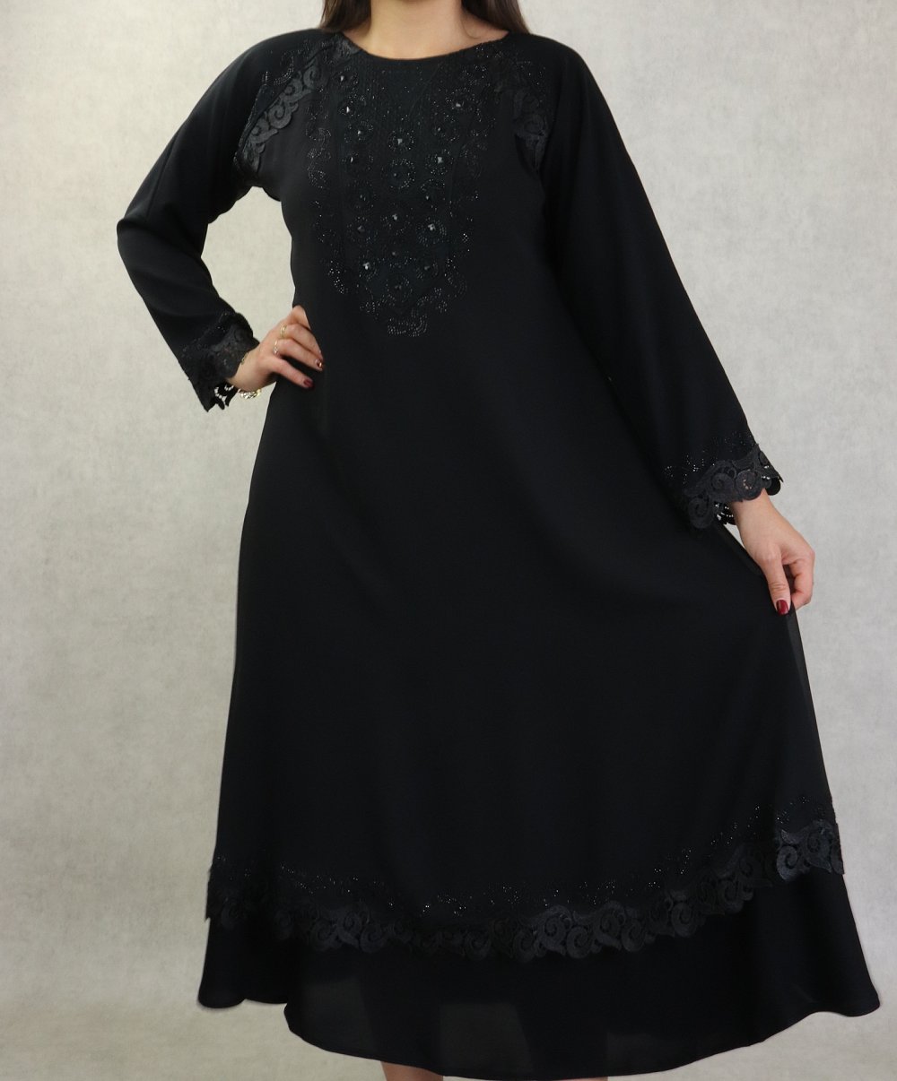 Robe Abaya Dubaï noire de qualité strass et dentelle noires - REF. 38197 (45.00 €)