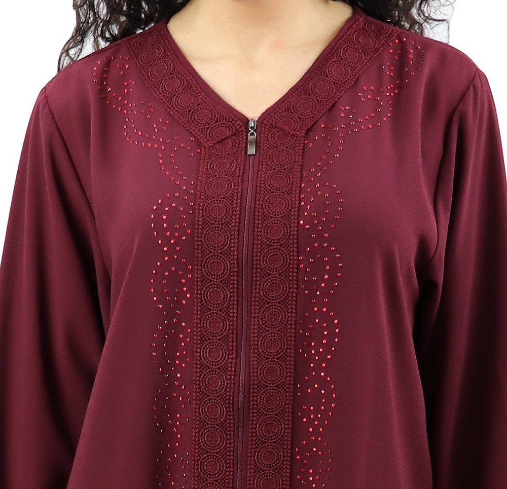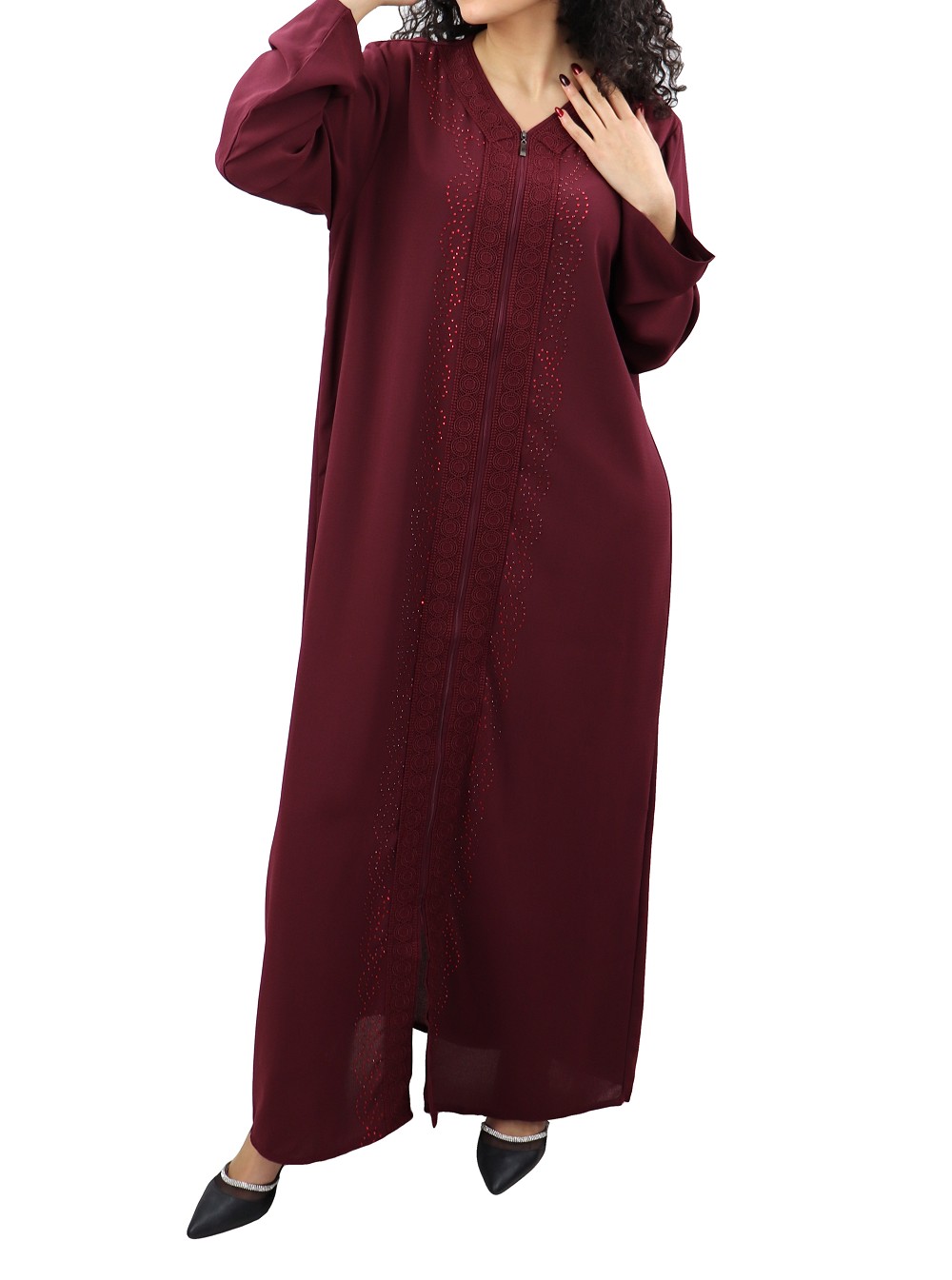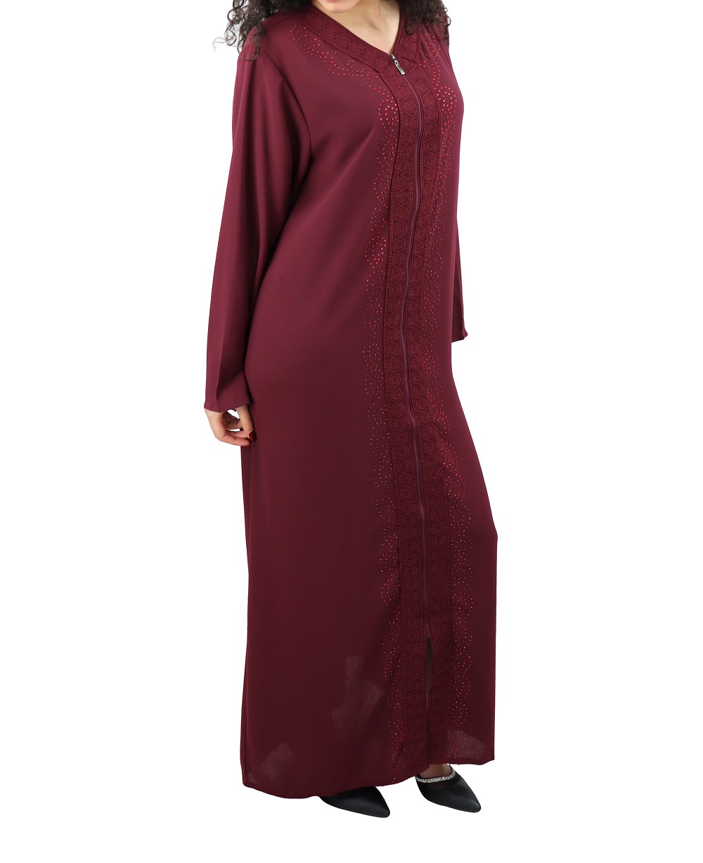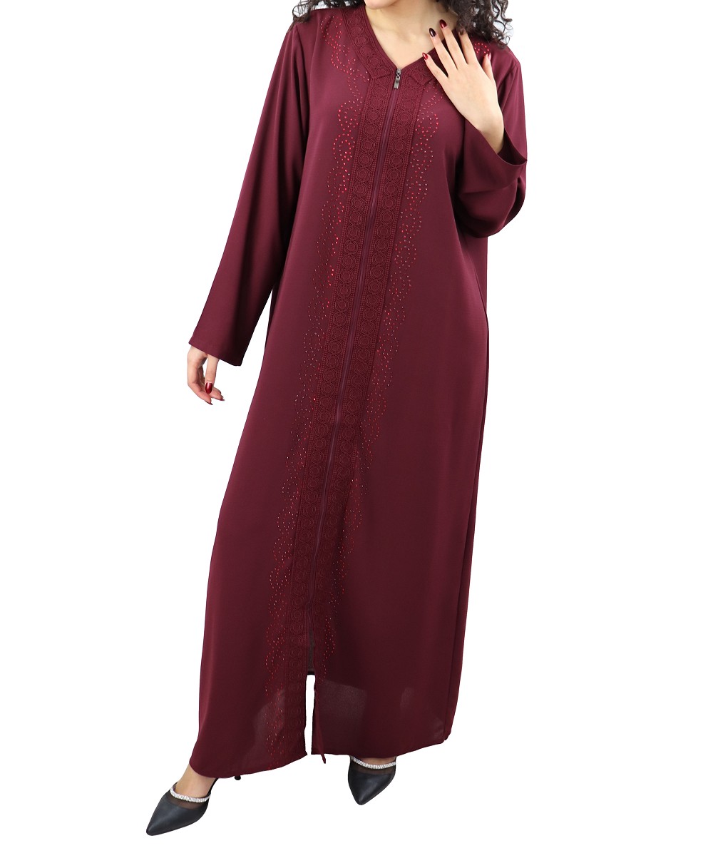 Robe / Abaya Longue a ouverture zip avec broderies et strass pour femme - Couleur Prune