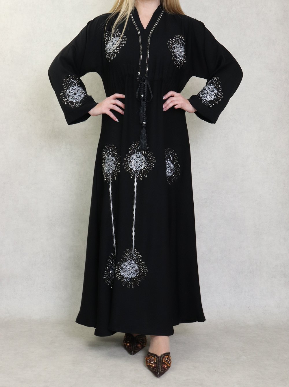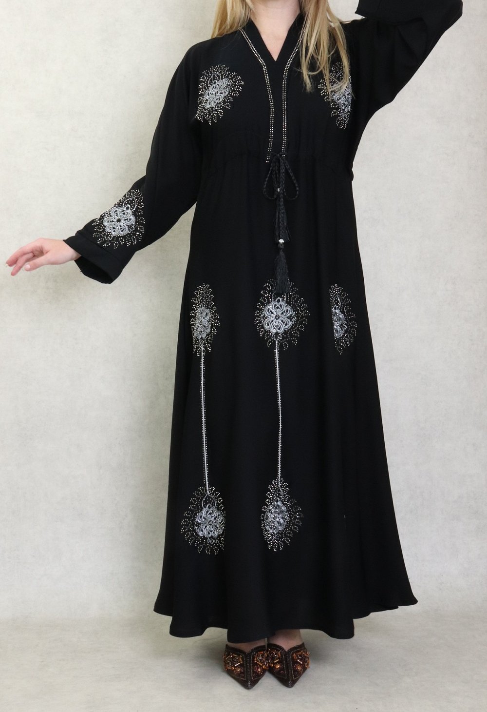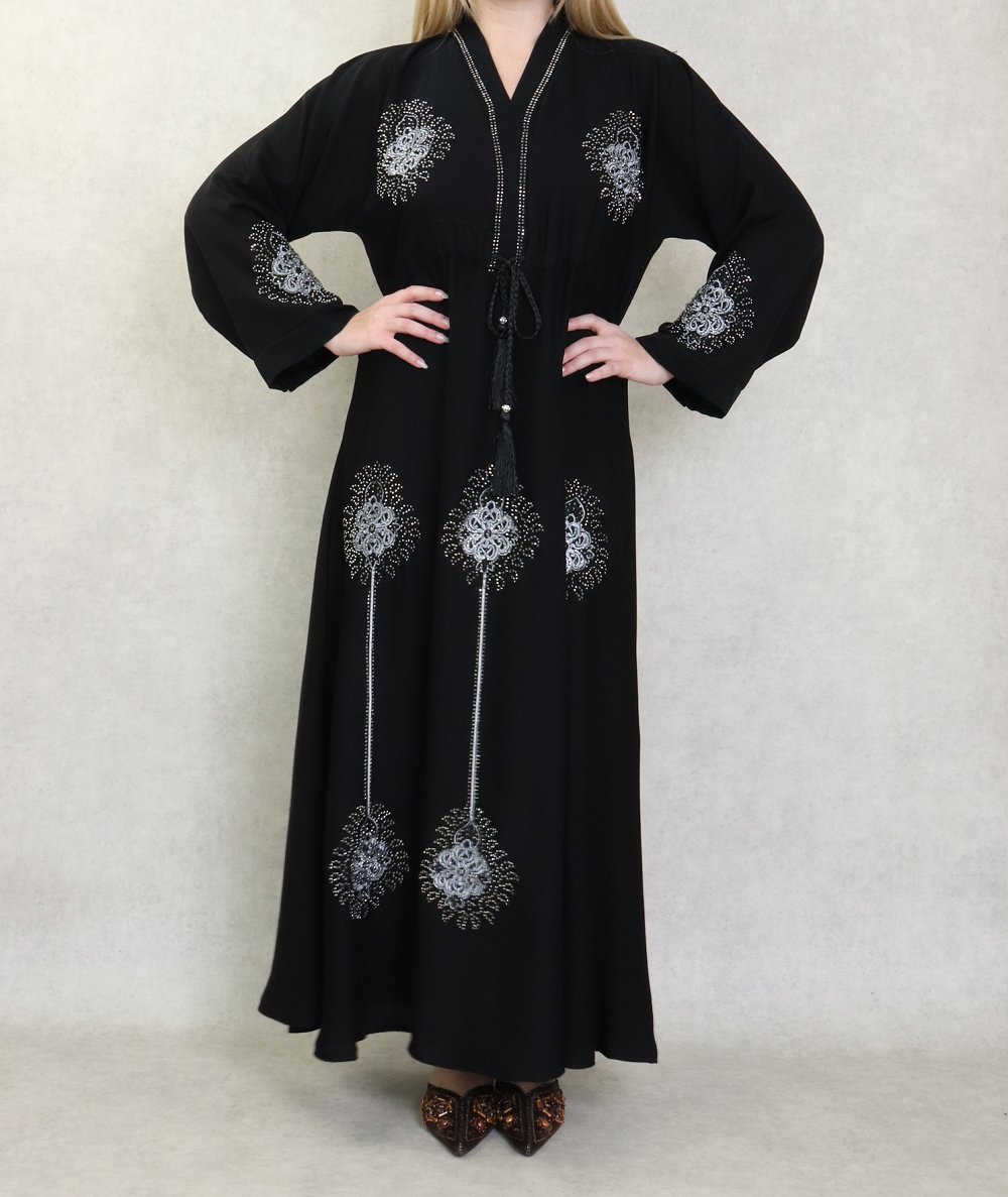 Robe Abaya Dubaï noire de qualité avec broderie et strass argenté et ceinture interne - REF. 38194 (45.00 €)