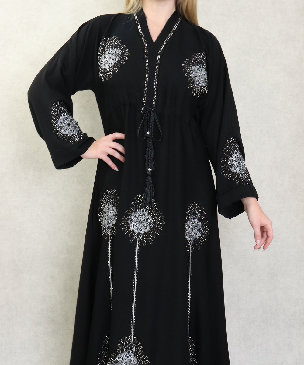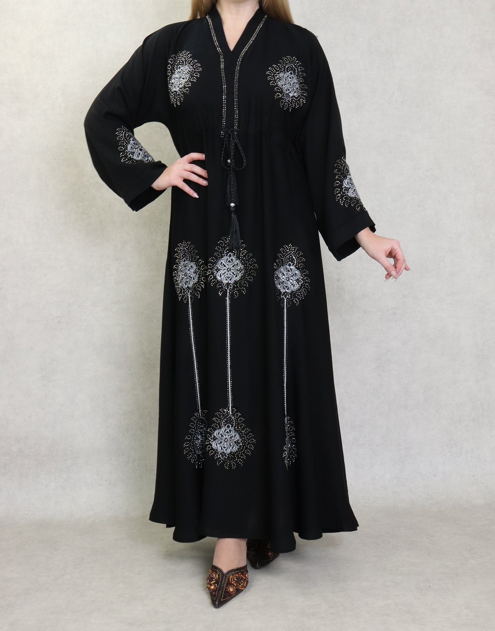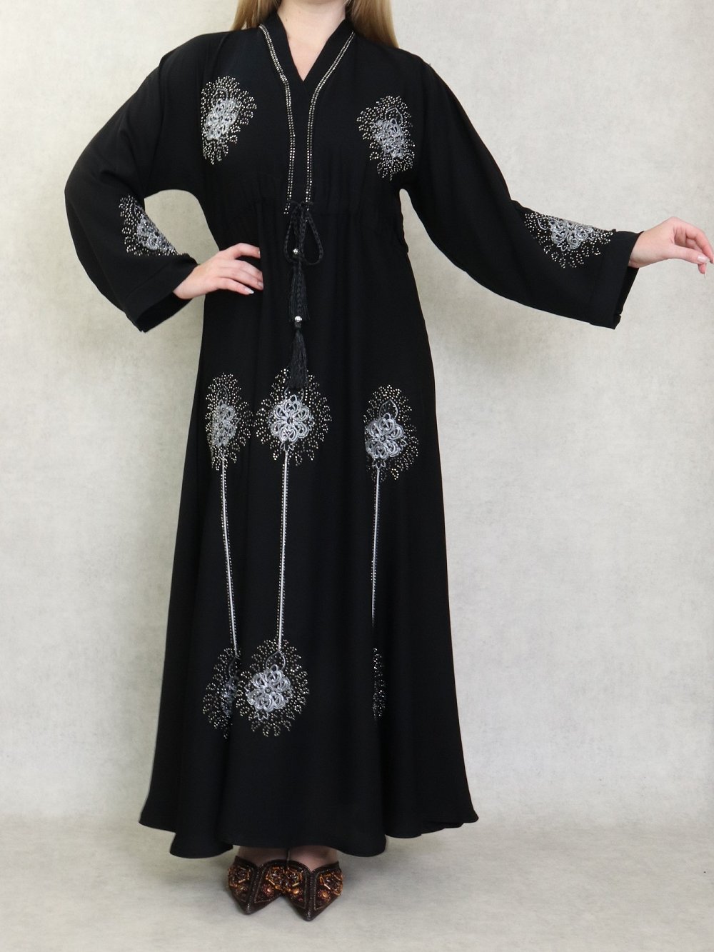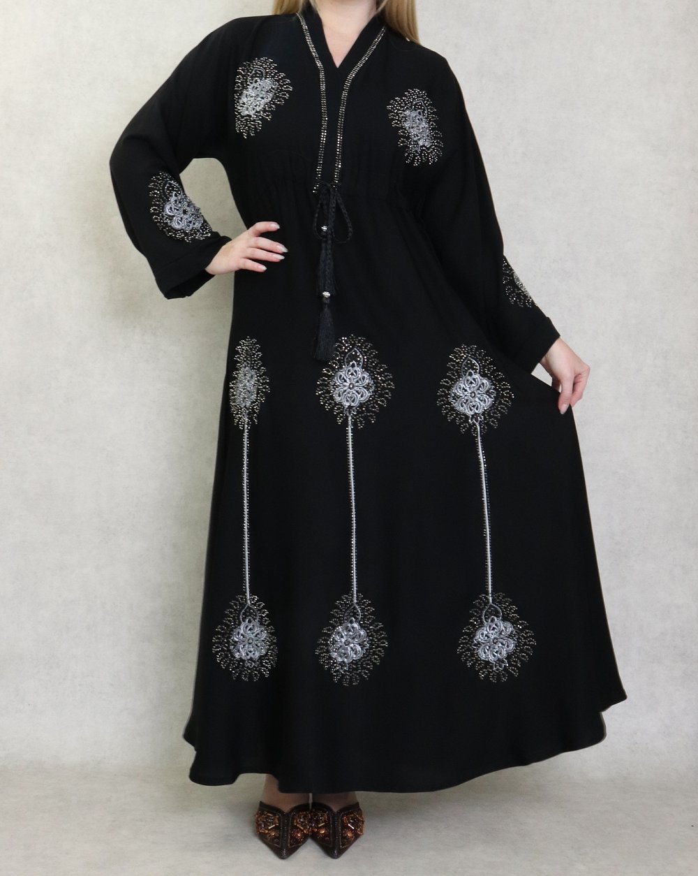 Robe Abaya Dubaï noire de qualité avec broderie et strass argenté et ceinture interne - REF. 38194 (45.00 €)