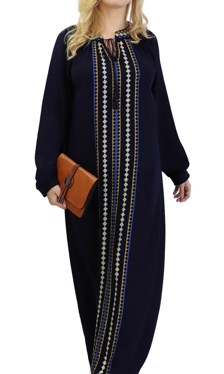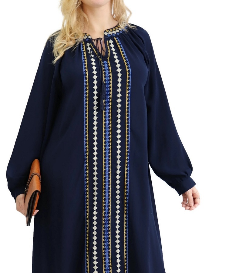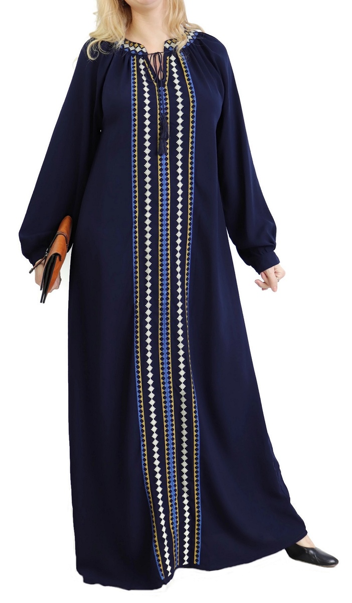 Robe longue, col Mao à nouer brodé ainsi que sur toute la longueur, manches bouffantes. Cette robe par sa broderie originale vous apportera un supplément d'élégance.