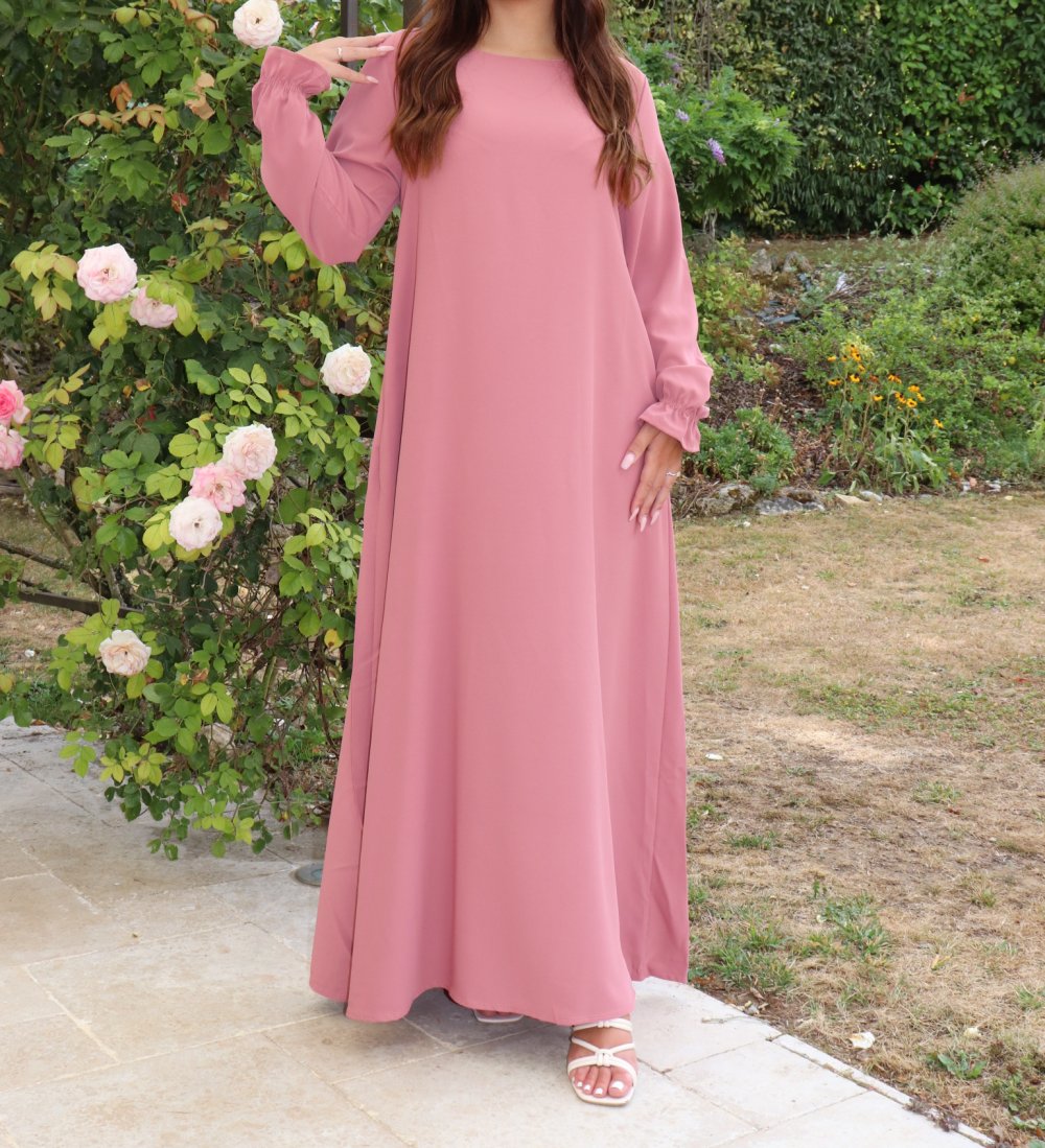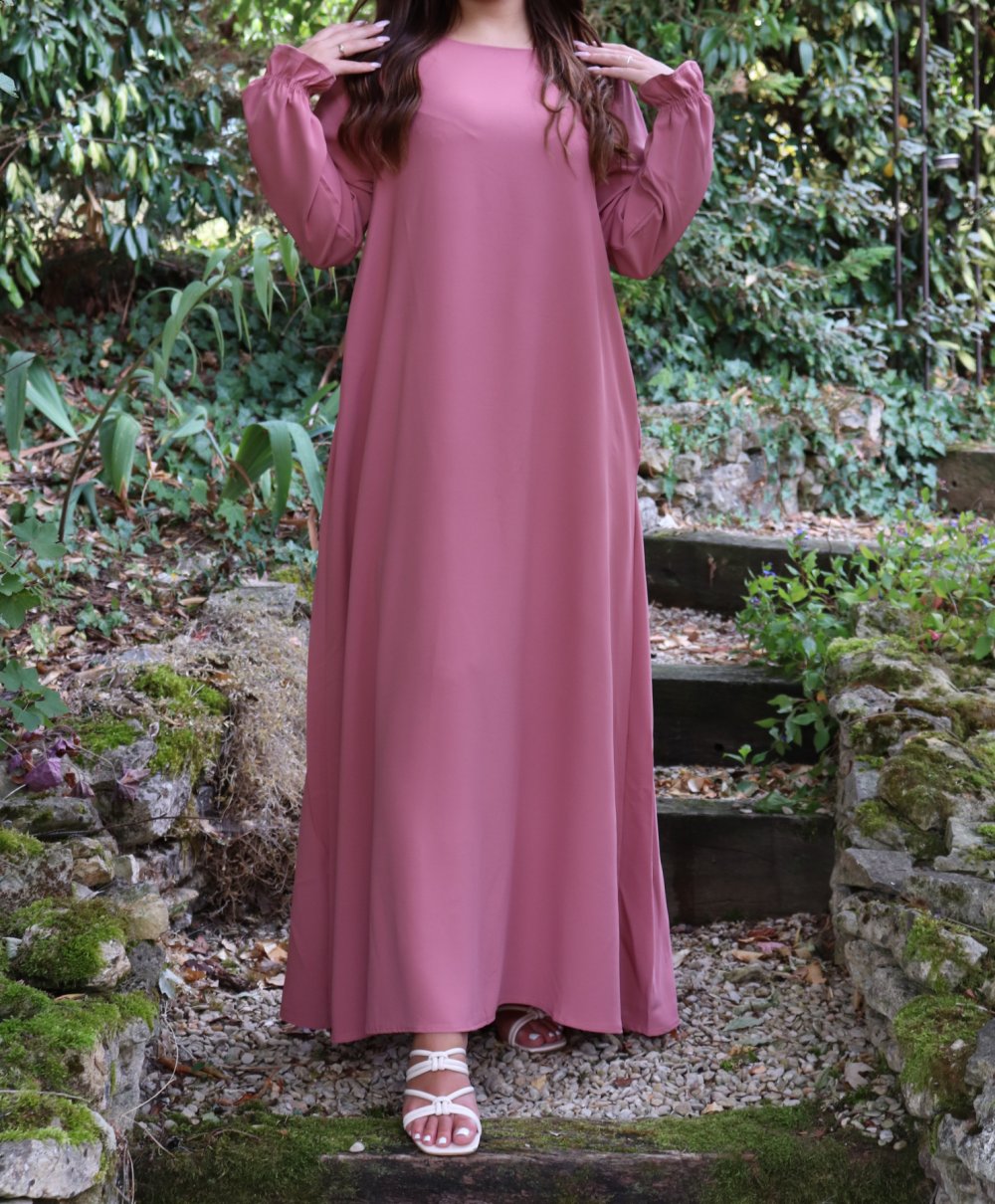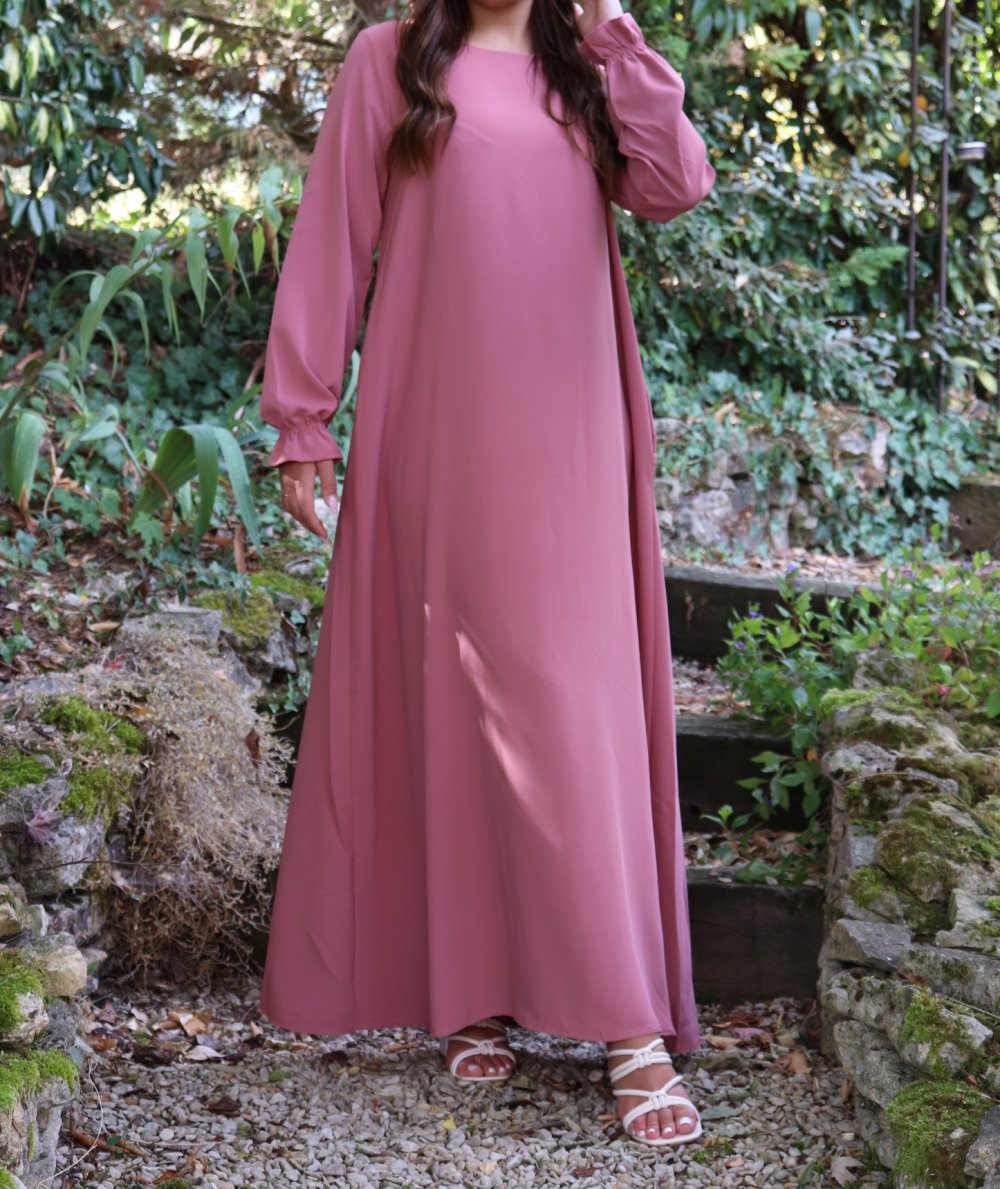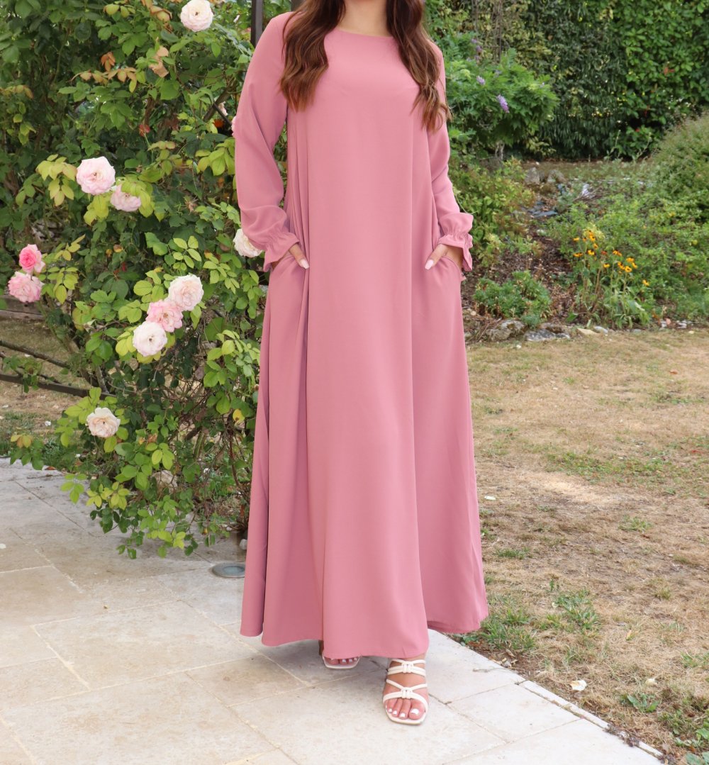 Jolie robe Abaya longue, col rond, coupe évasée, deux poches latérales, tissu nidah noir opaque. Beau tombé et très agréable à porter. Intemporel, elle se porte en toutes saisons, en toutes occasions.