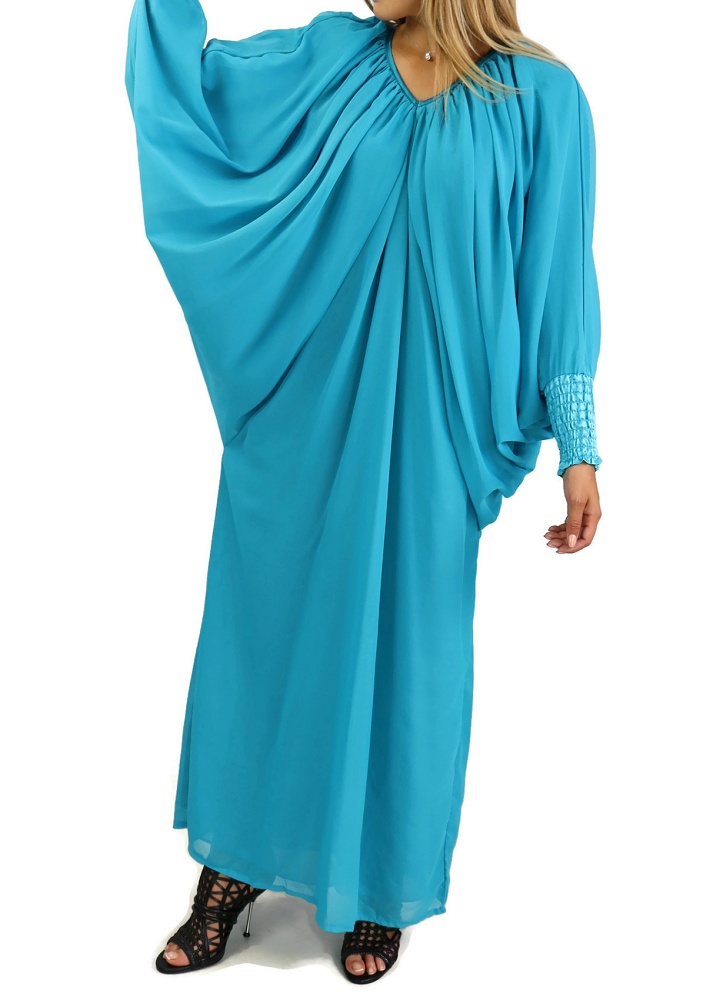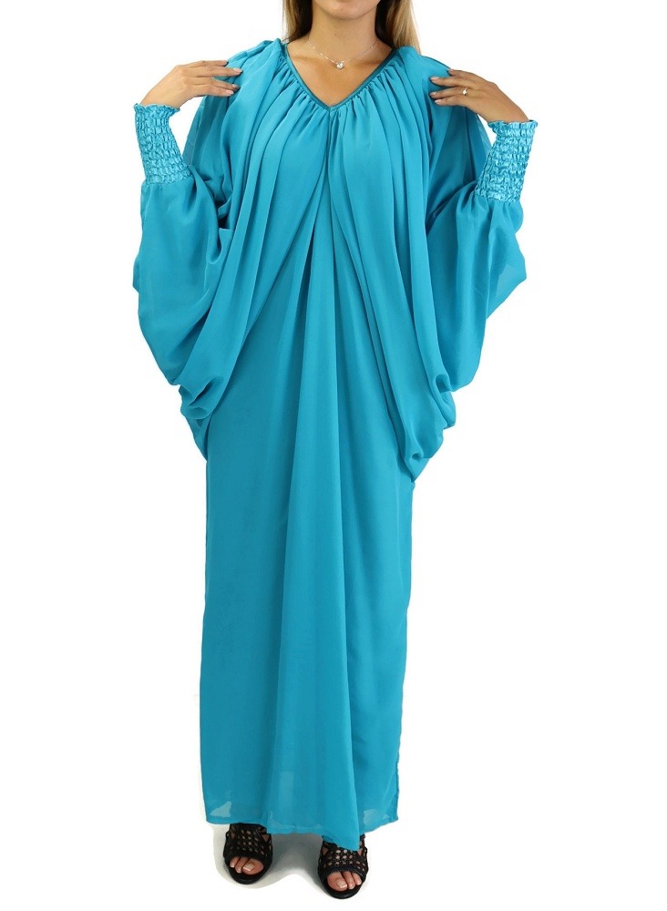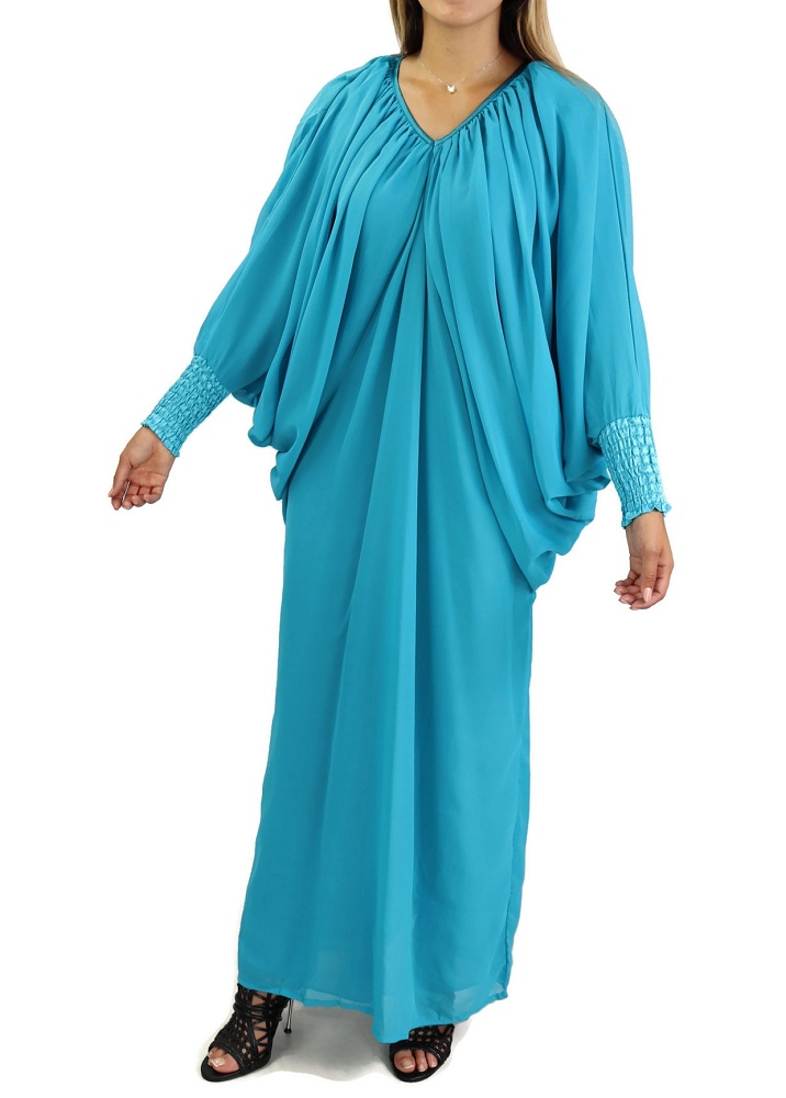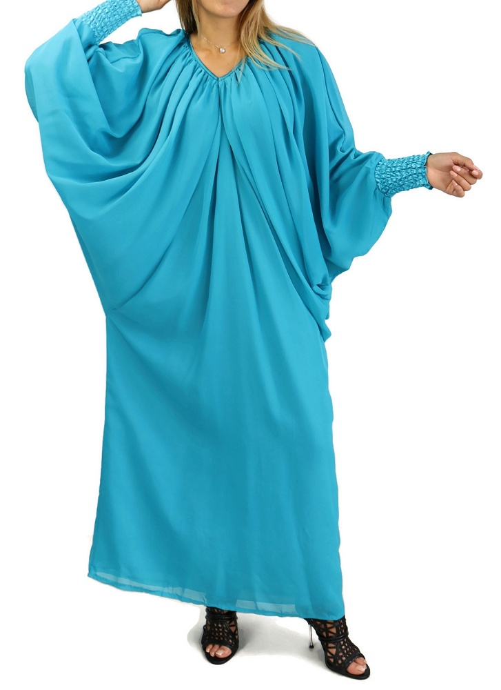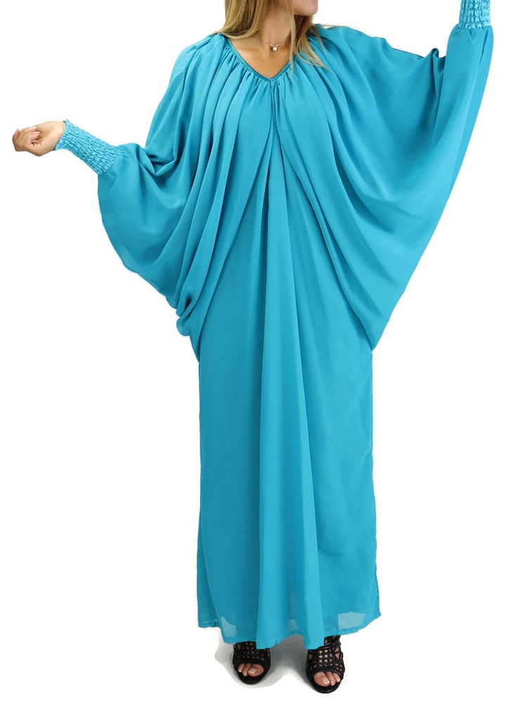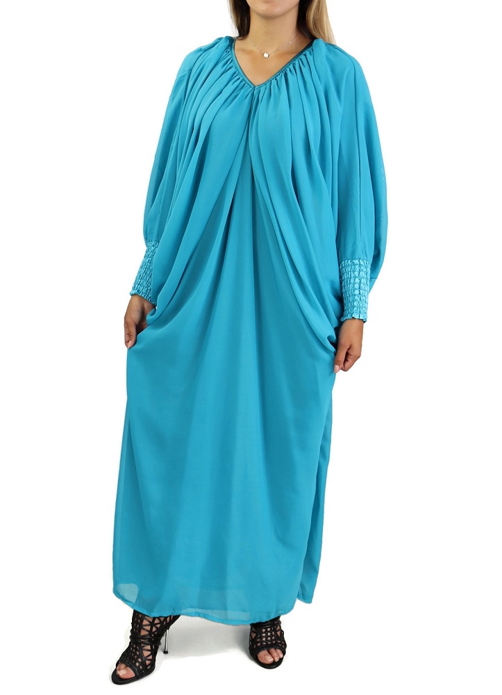 Robe confortable et habillée . Col en V satiné, manches amples resserrées aux poignets par une bande élastique froncée et satinée. Tissu léger style "organza" accompagné d'une doublure. Coupe papillon en haut et droite au niveau des hanches.