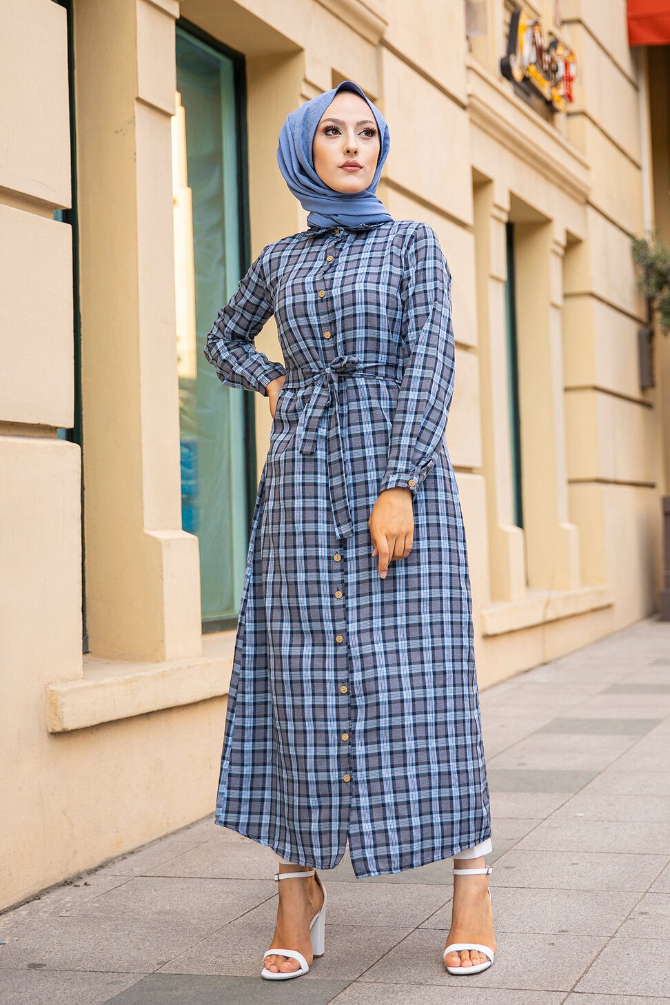 Robe-Chemise boutonnee ecossaise longue avec ceinture assortie pour femme (Vetement Modest Fashion) - Couleur bleu clair