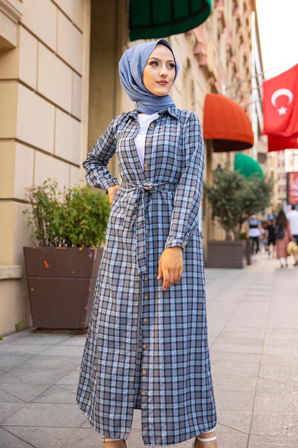 Robe-Chemise boutonnée écossaise longue avec ceinture assortie pour femme (Vetement Modest Fashion) - Couleur bleu clair Vetement & Accessoire