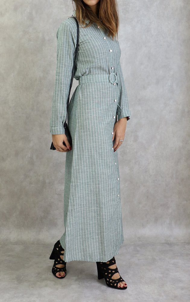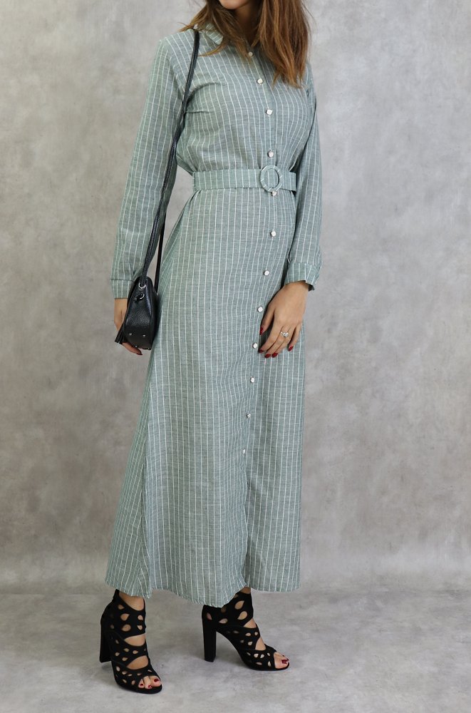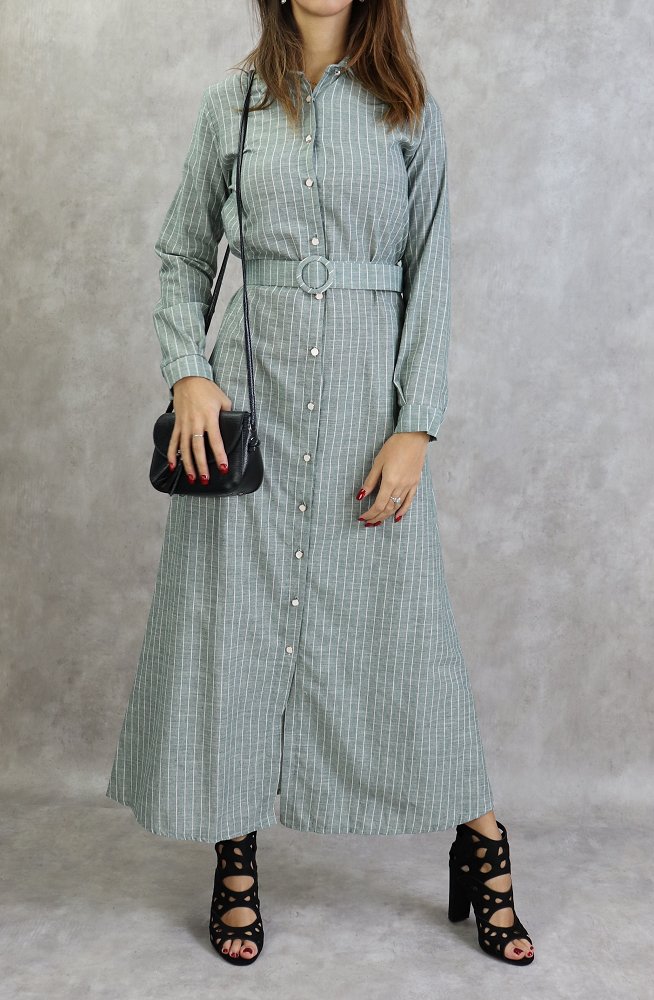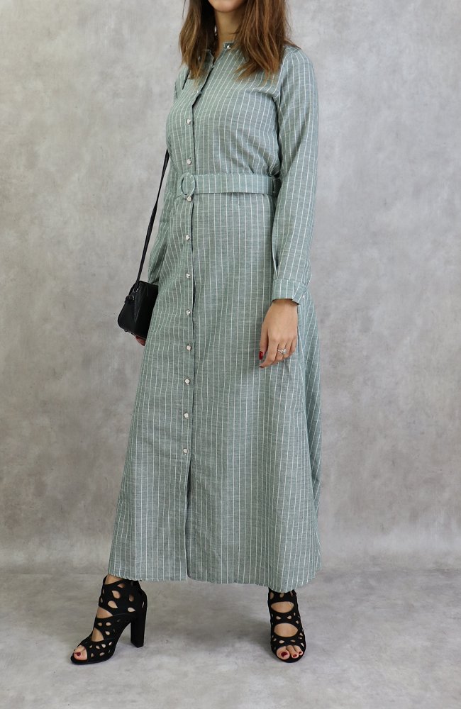 Robe-Chemise en coton à fines rayures blanches de couleur vert kaki avec ceinture assortie Vetement & Accessoire