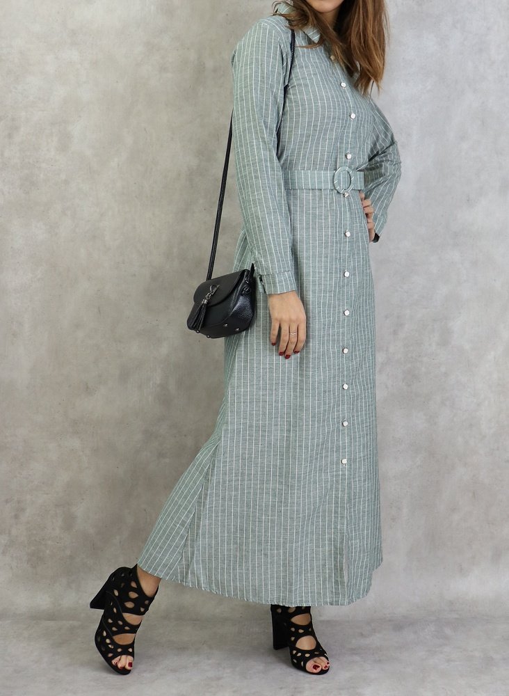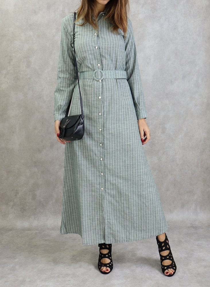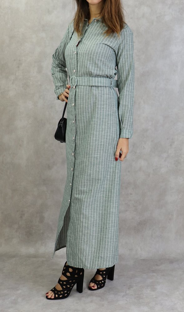 Robe-Chemise en coton a fines rayures blanches de couleur vert kaki avec ceinture assortie