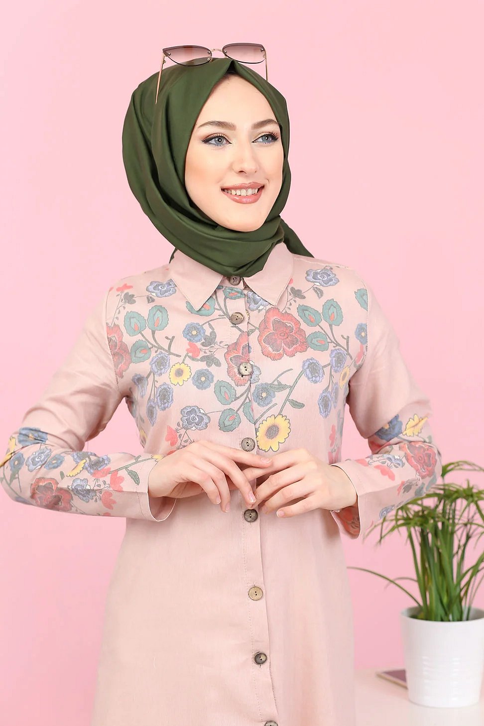 Robe-manteau boutonnée avec grandes poches et capuche (Vêtement mastour pour hijab) - Couleur kaki - REF. 36373 (29.90 €)