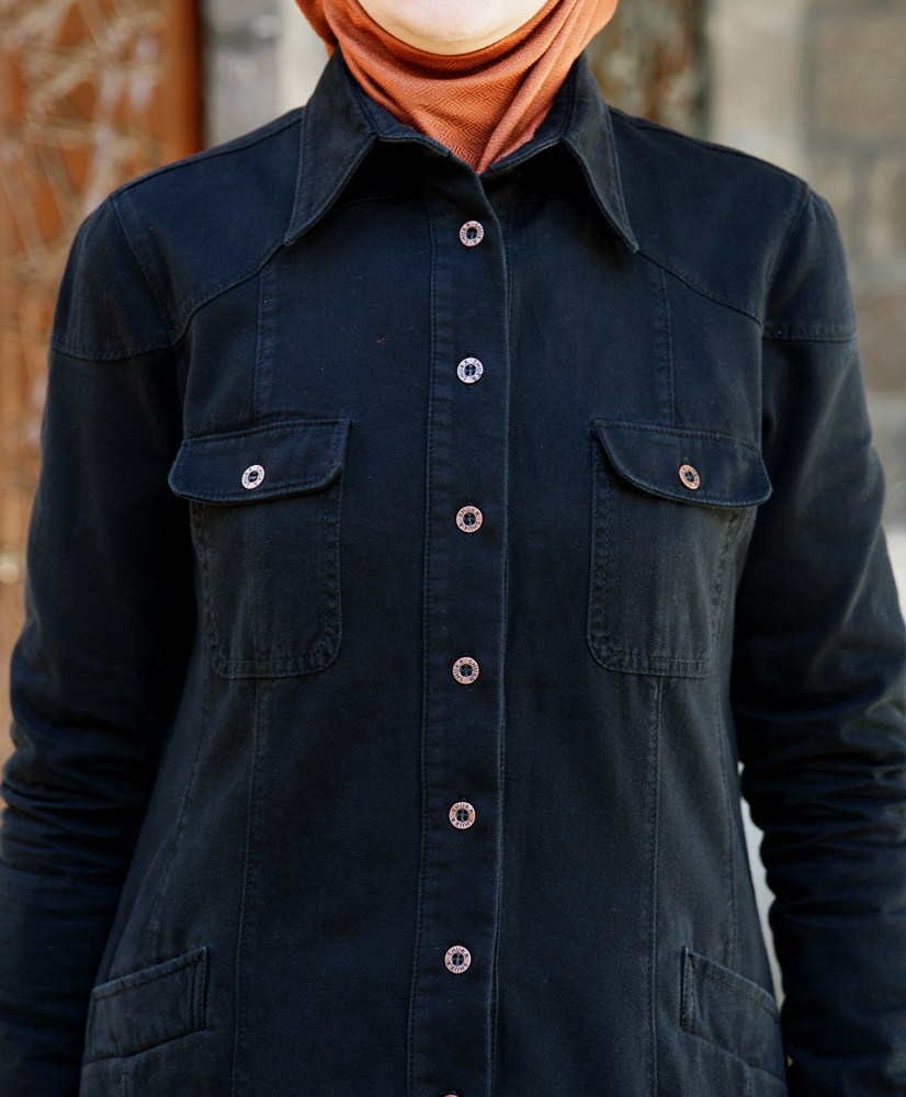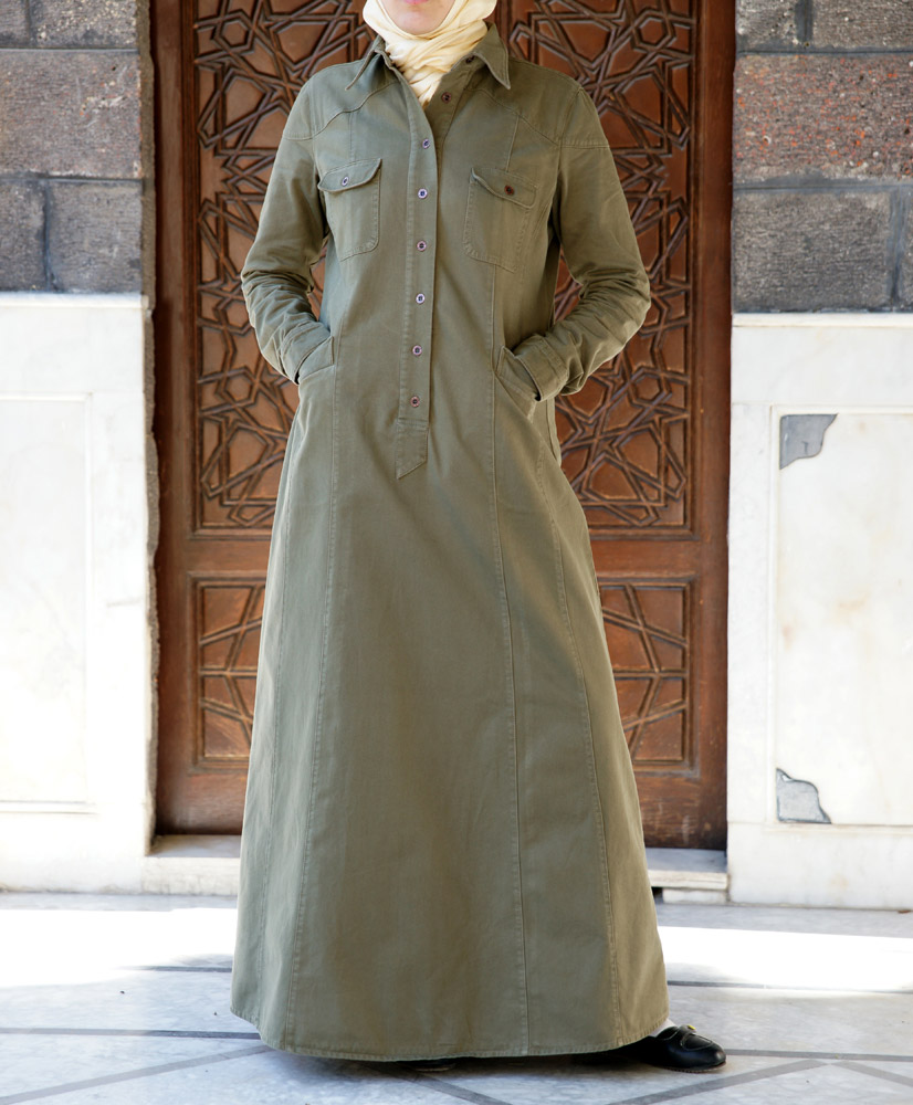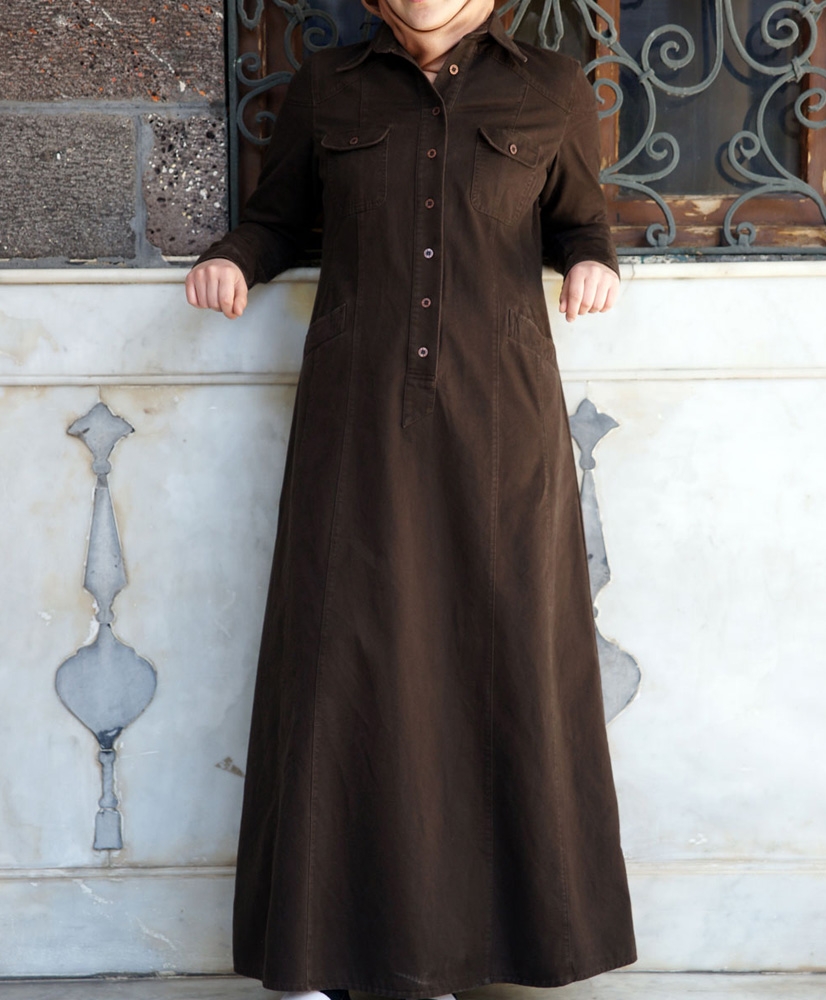 Description: full length; pointed collar; metal button neck opening and cuffs; 2 chest pockets and 2 hip pockets with metal buttons; shoulder and top sleeve yokes. Imported.