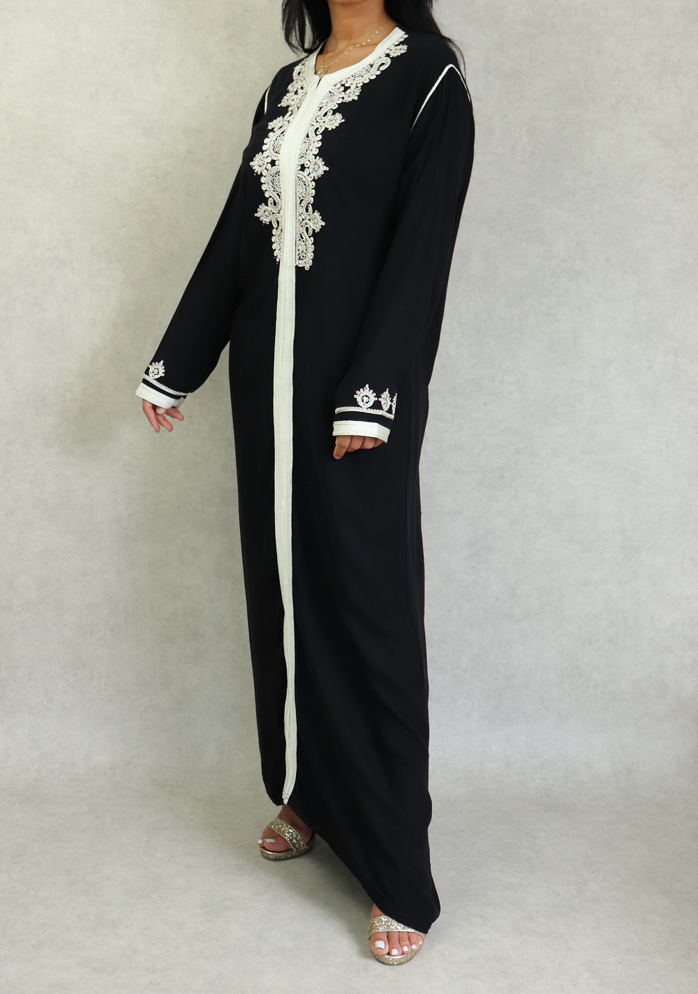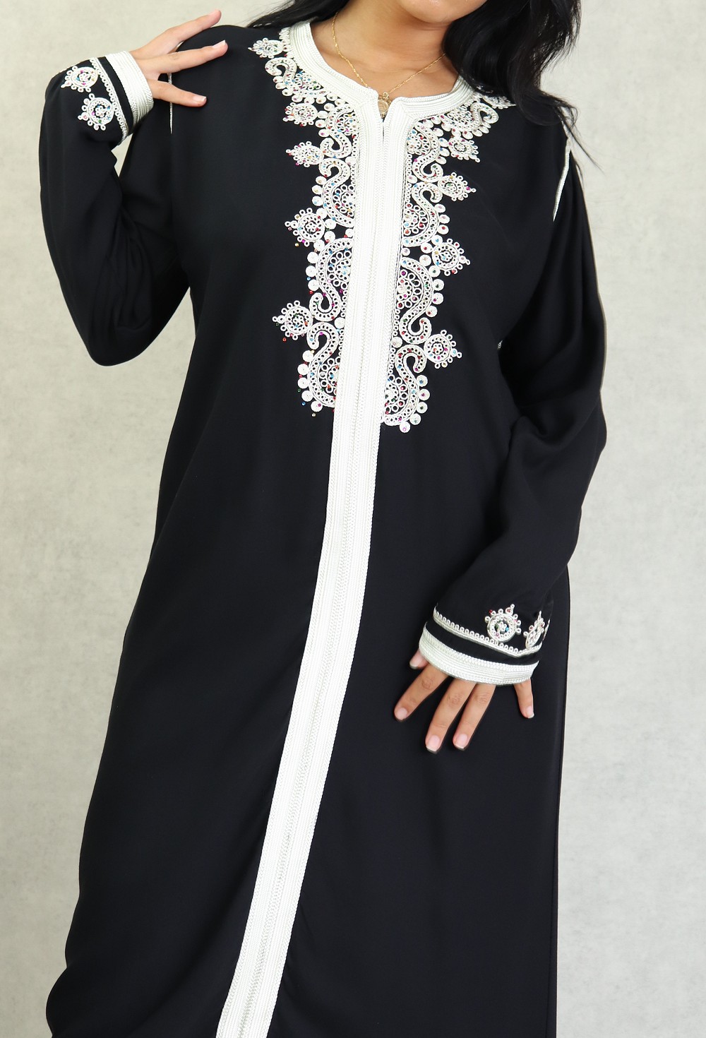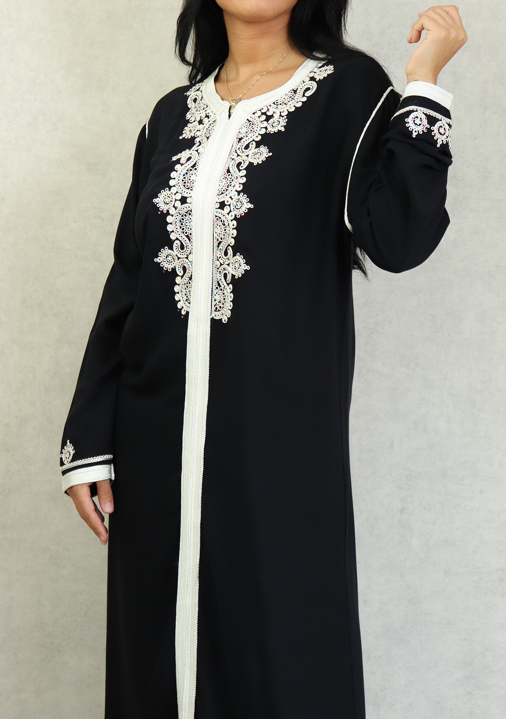 Robe Marocaine longue avec strass multi-couleur et nombreuses broderies sur le buste et toute la longueur ; style caftan. Tissu doux de type coton/soie. Le double avantage de ce modèle est d'être confortable et élégant à la fois.
