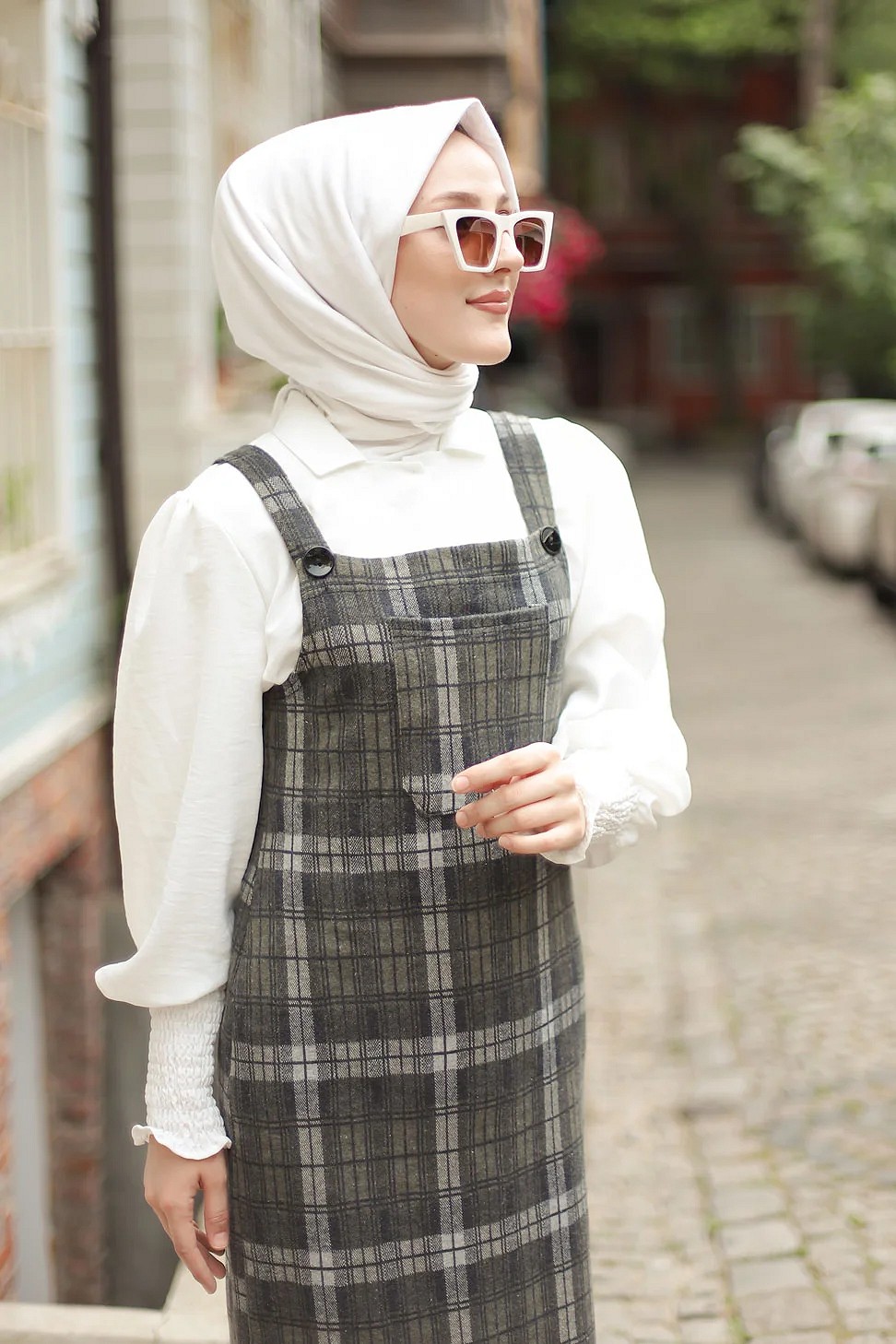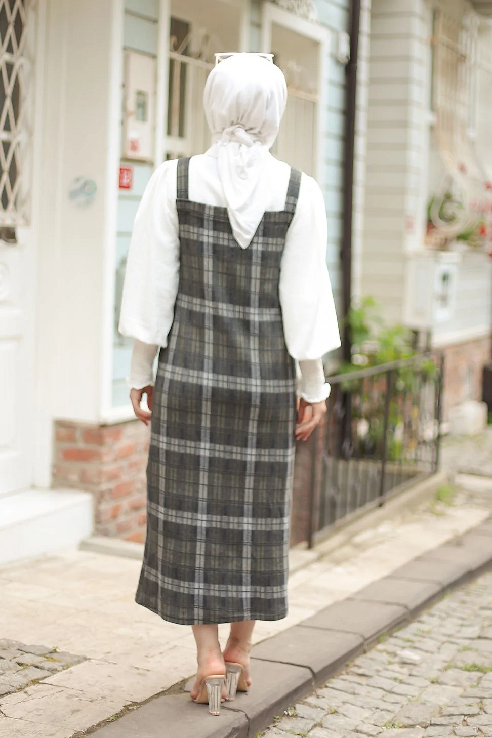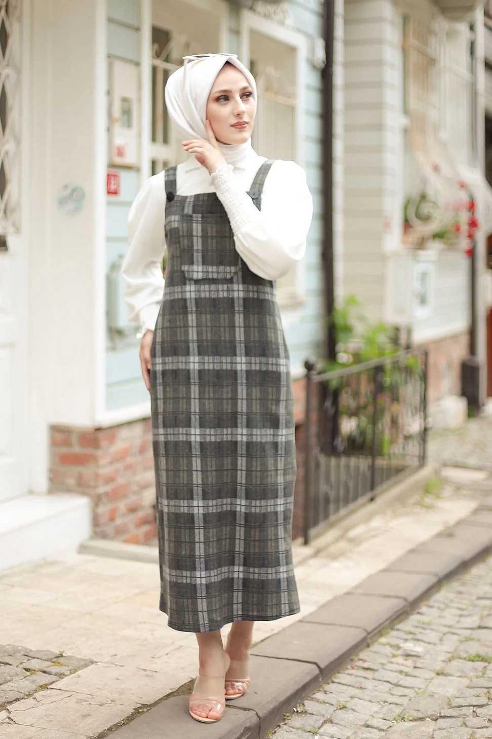 Robe Salopette à carreaux (Tenue Hijab habillée pour femme voilée) - Couleur gris anthracite et kaki Vetement & Accessoire