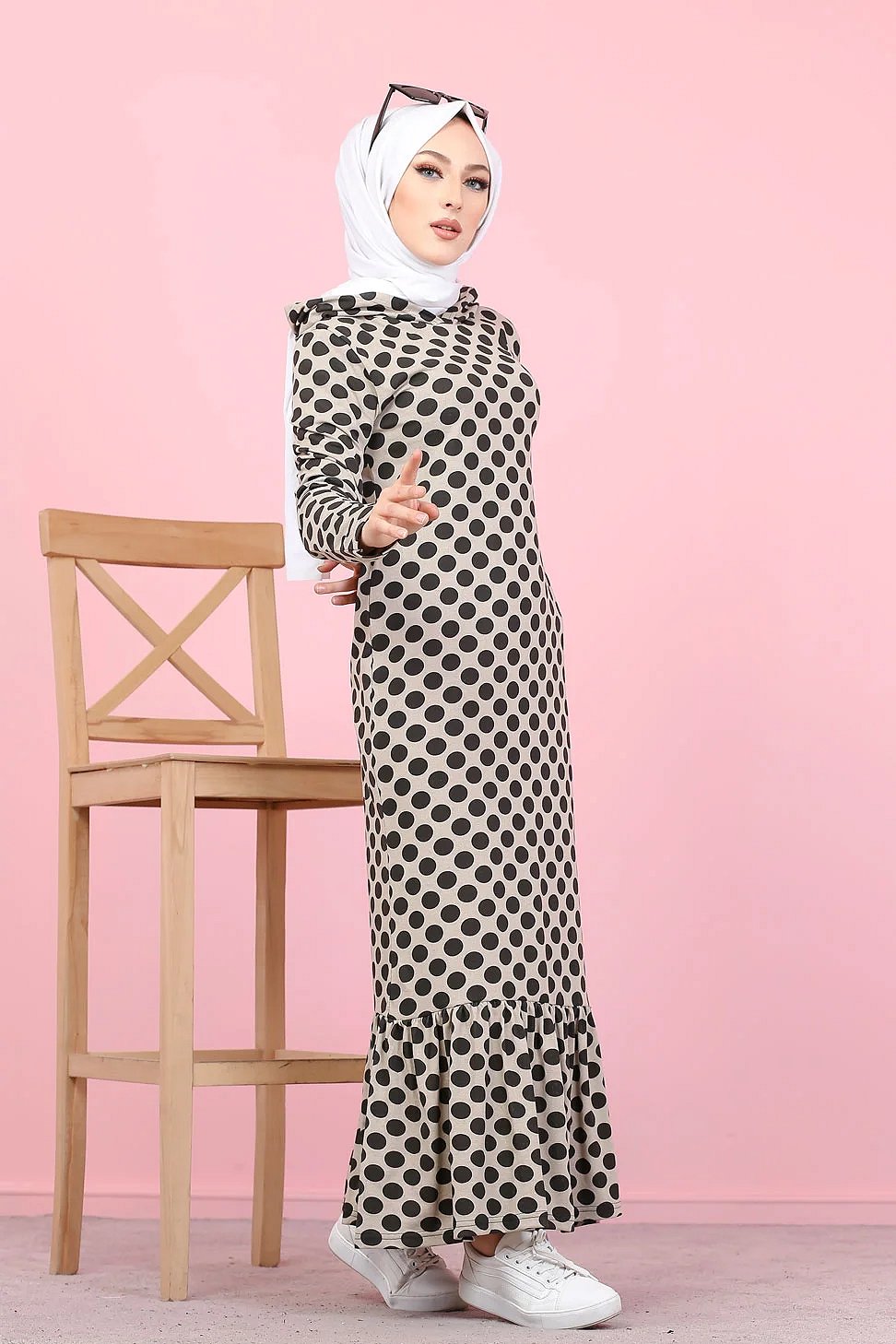 Robe longue, col à capuche, coupe droite finition volant. Ce modèle à pois reste tendance et indémodable.