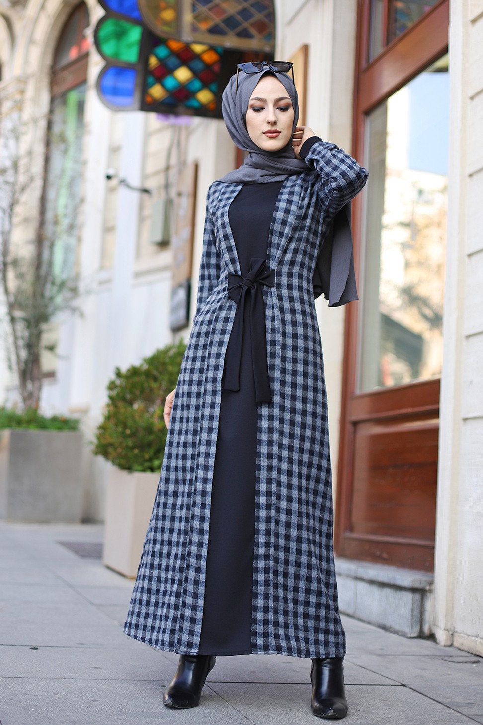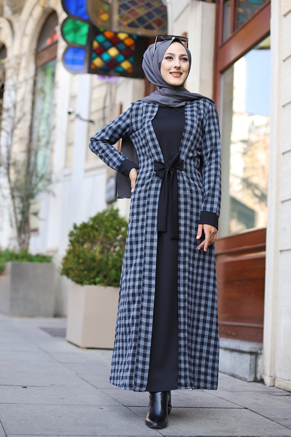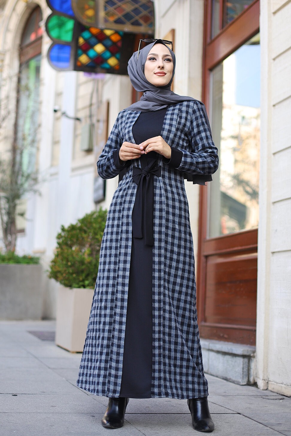 Robe à carreaux type "Kabaya" (Kimono avec Abaya cousue en une seule pièce) - Couleur noir et anthracite Vetement & Accessoire