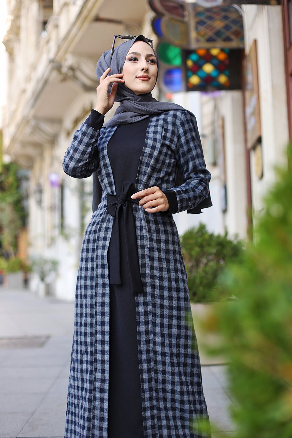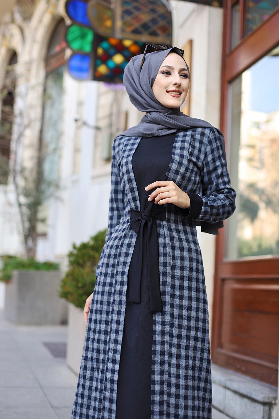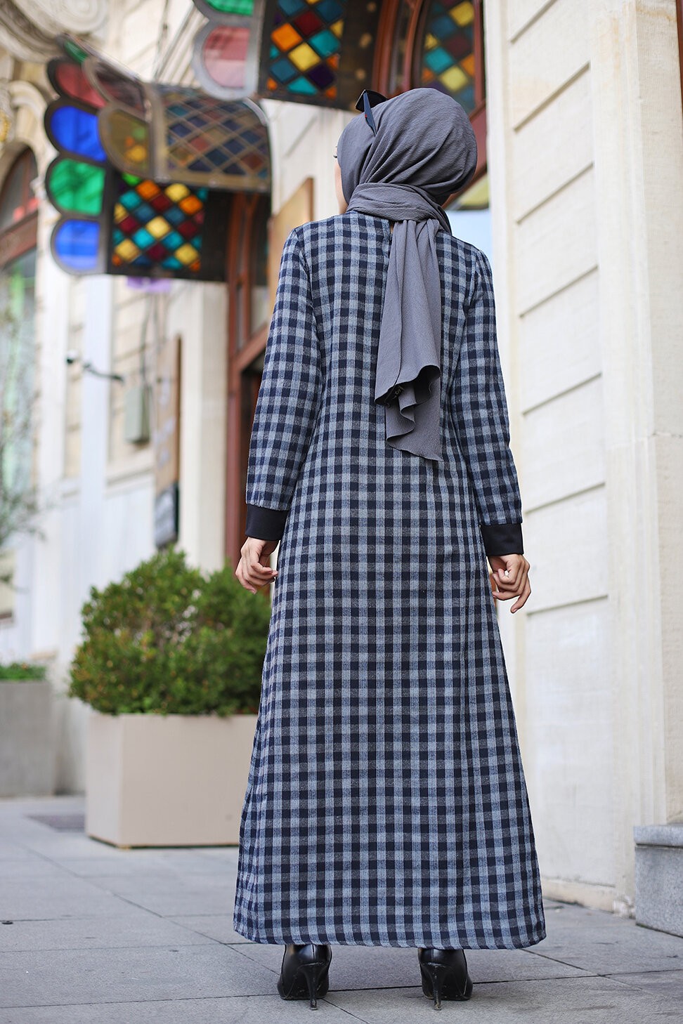 Robe à carreaux type "Kabaya" (Kimono avec Abaya cousue en une seule pièce) - Couleur noir et anthracite Vetement & Accessoire