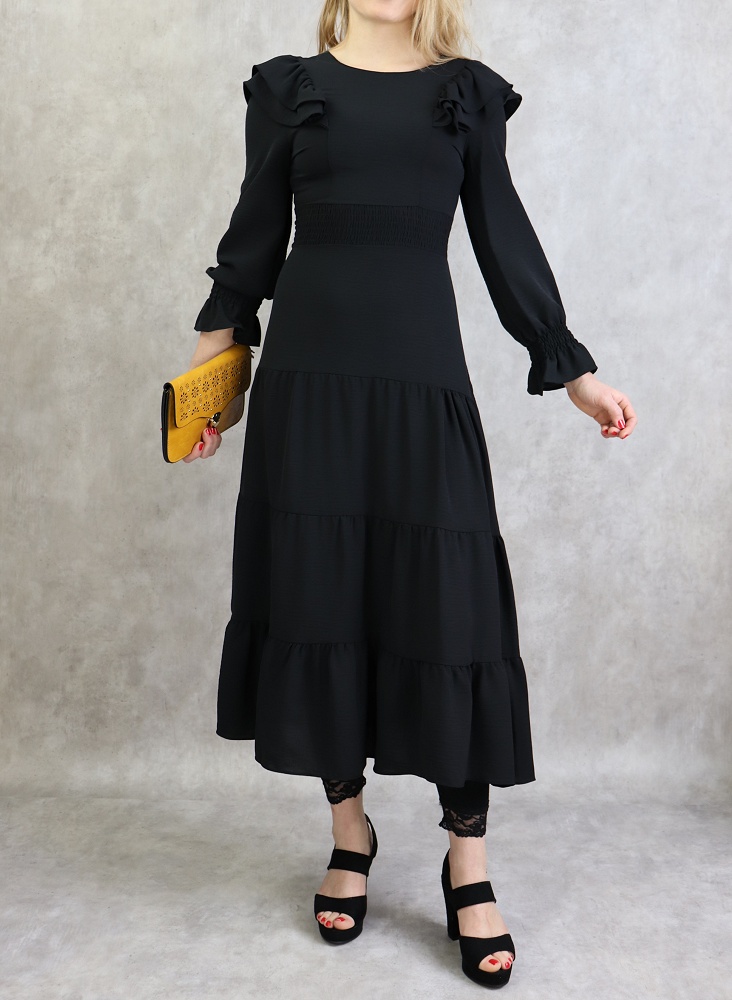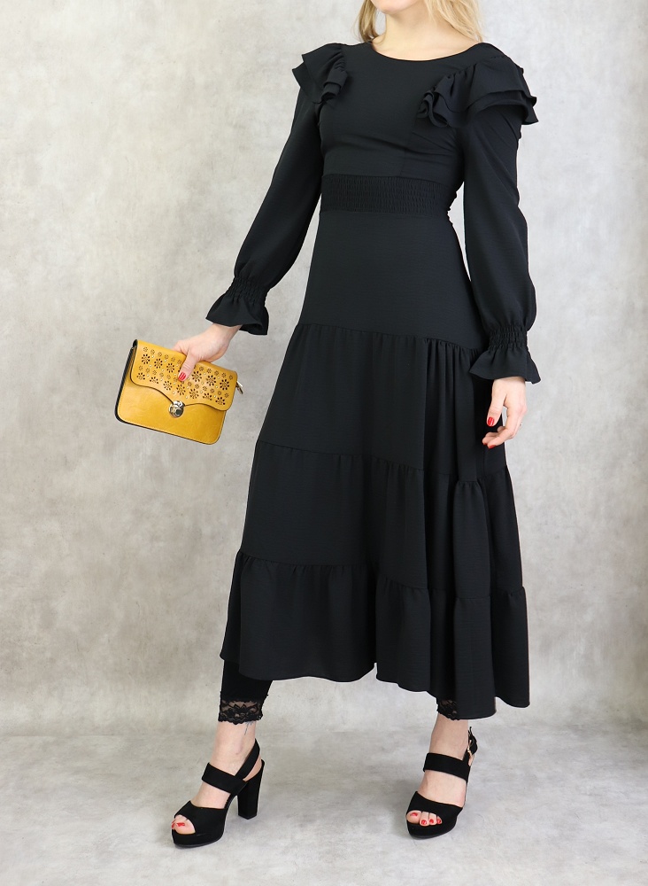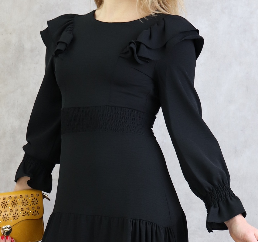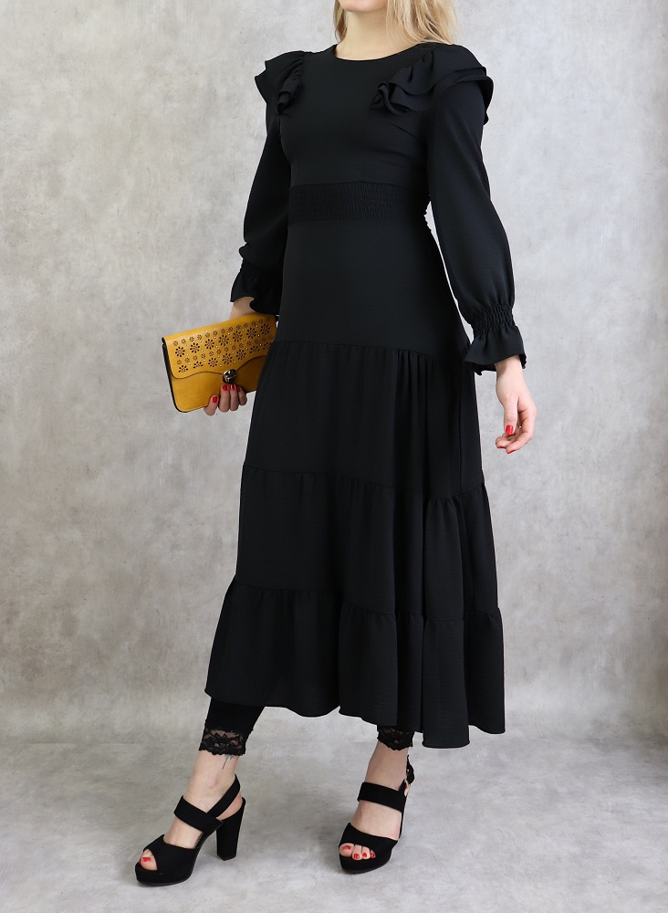 Robe à collerettes au niveau des épaules, col rond, manches finition élastique aux poignets, fermeture à glissière au dos, taille cintrée élastique, tissu fluide, coupe évasée vers le bas.