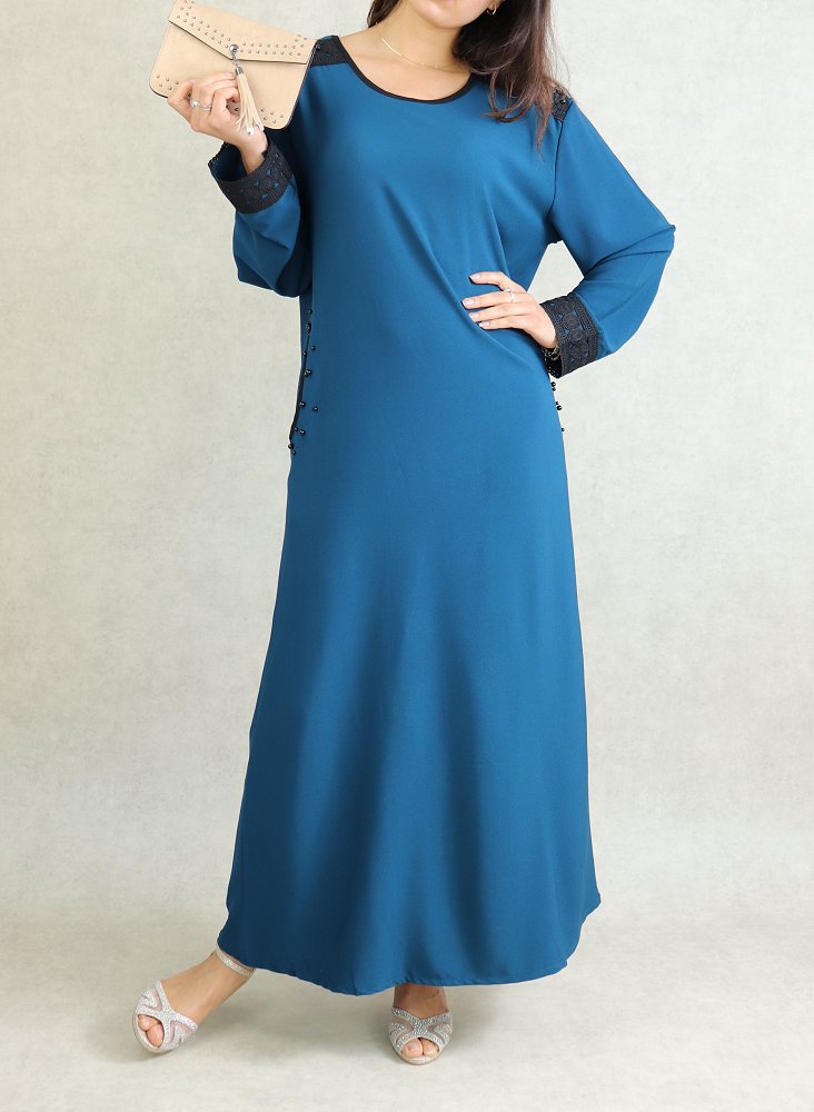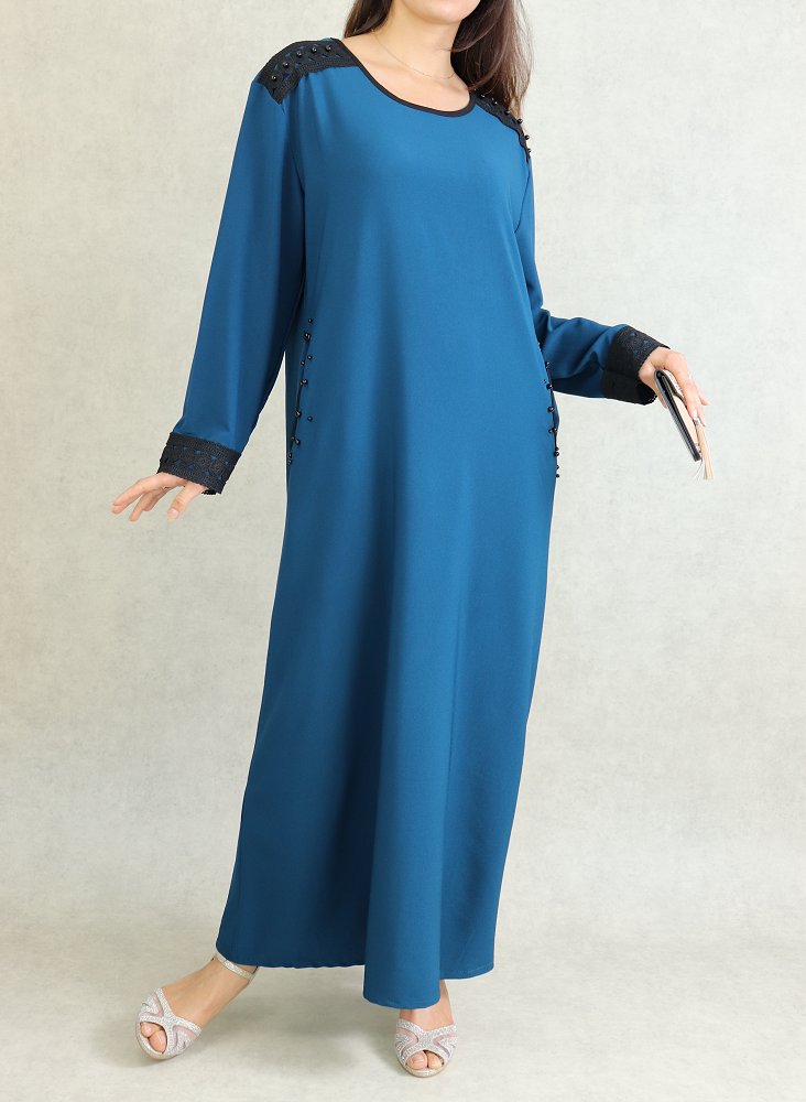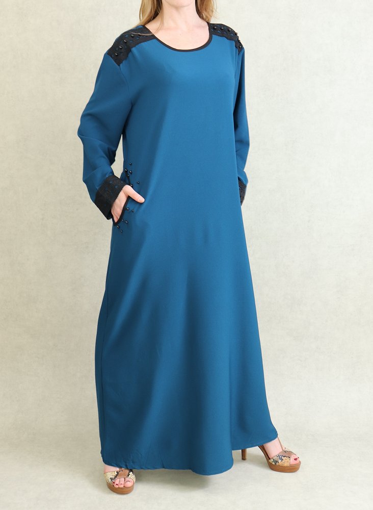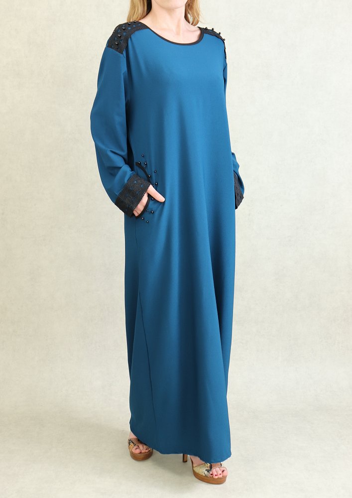 On est fan de cette robe, avec broderies et perles noires sur les épaules et aux poignets. Manches longues. Ses deux poches disposées sur les côtés vous seront d'une grande utilité.