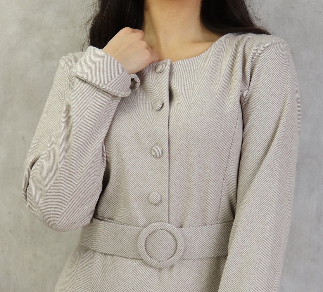 Robe longue, col rond, fermeture boutons sur le devant, manches finition revers, taille cintrée, ceinture réglable, assortie à passants, tissu doux et épais, effet lainage, coupe évasée vers le bas.