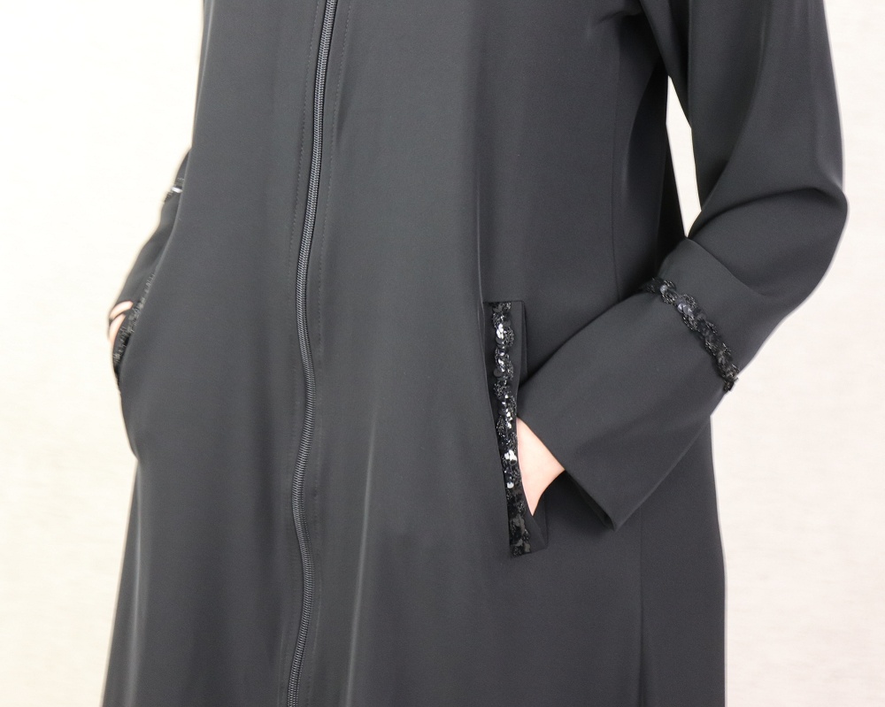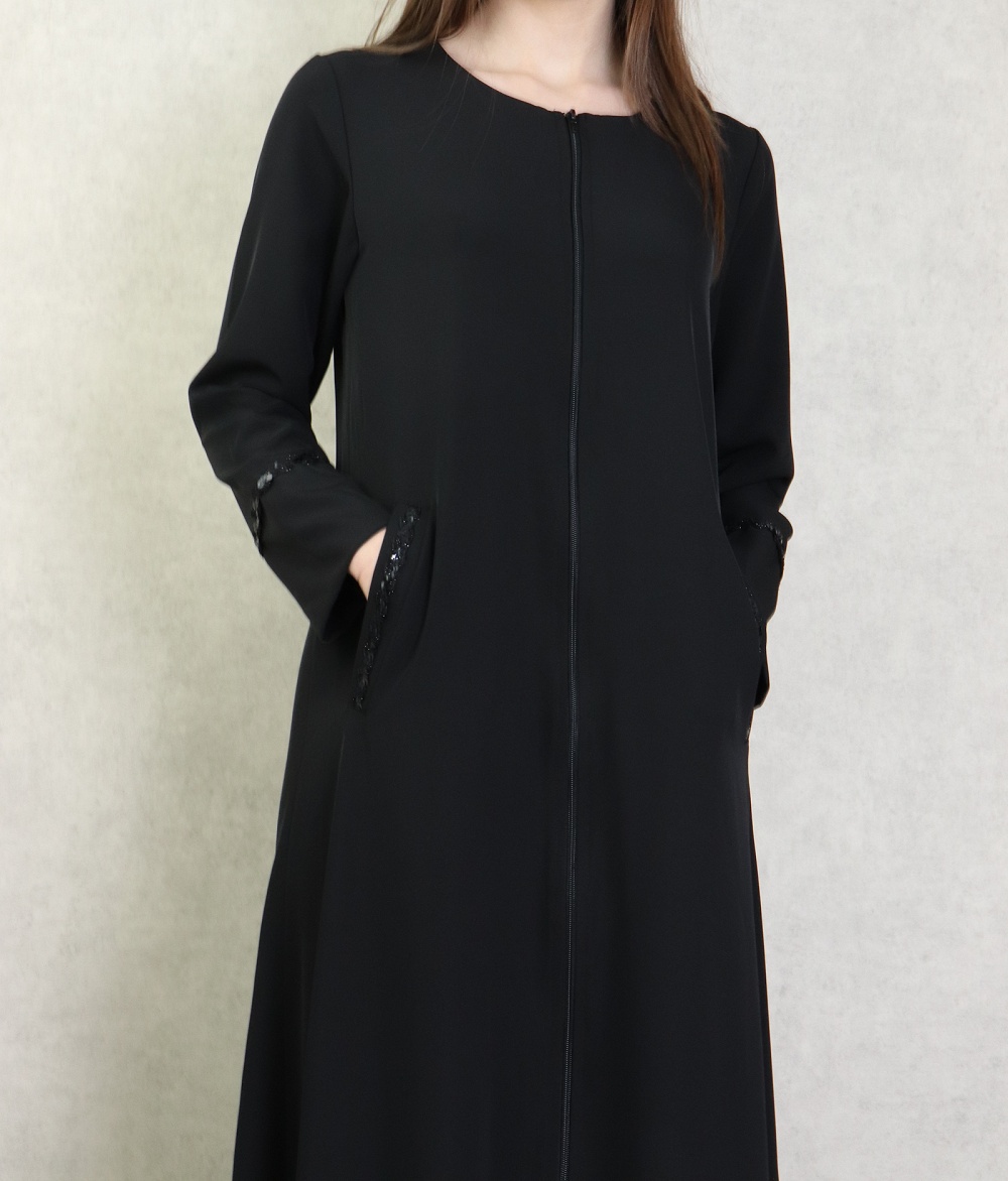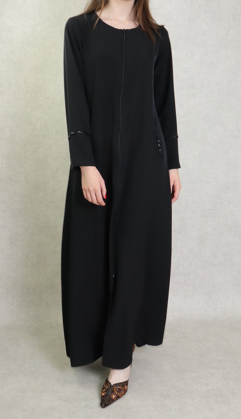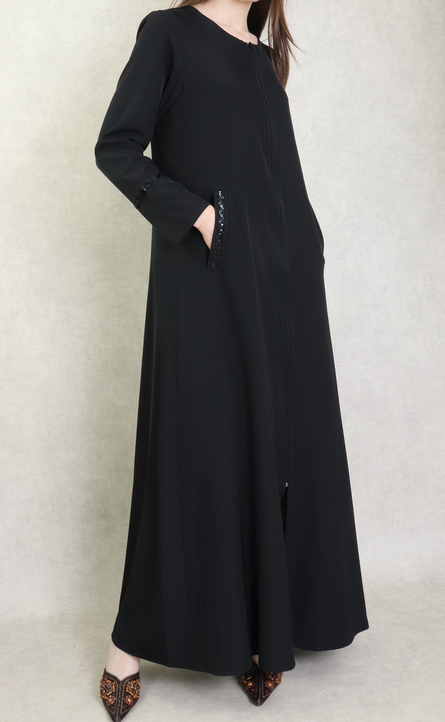 Robe abaya manches longues avec brodée noire et fermeture zip devant - Couleur Noir Vetement & Accessoire