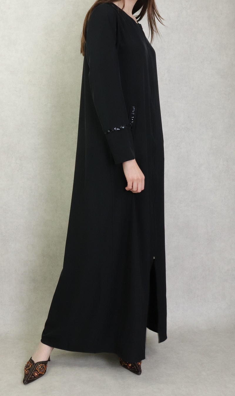 Robe abaya manches longues avec brodee noire et fermeture zip devant - Couleur Noir