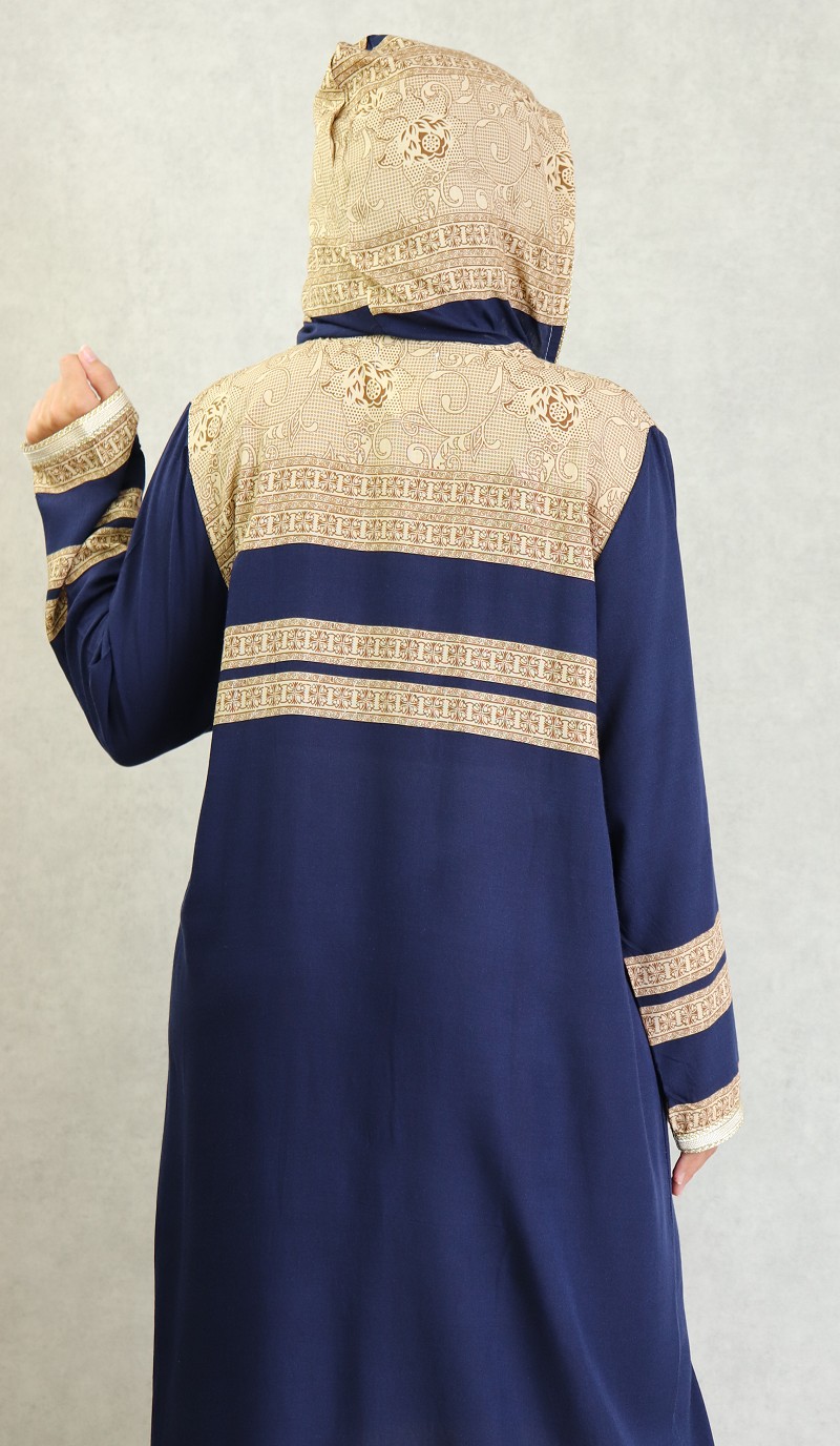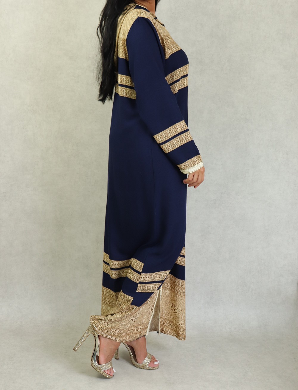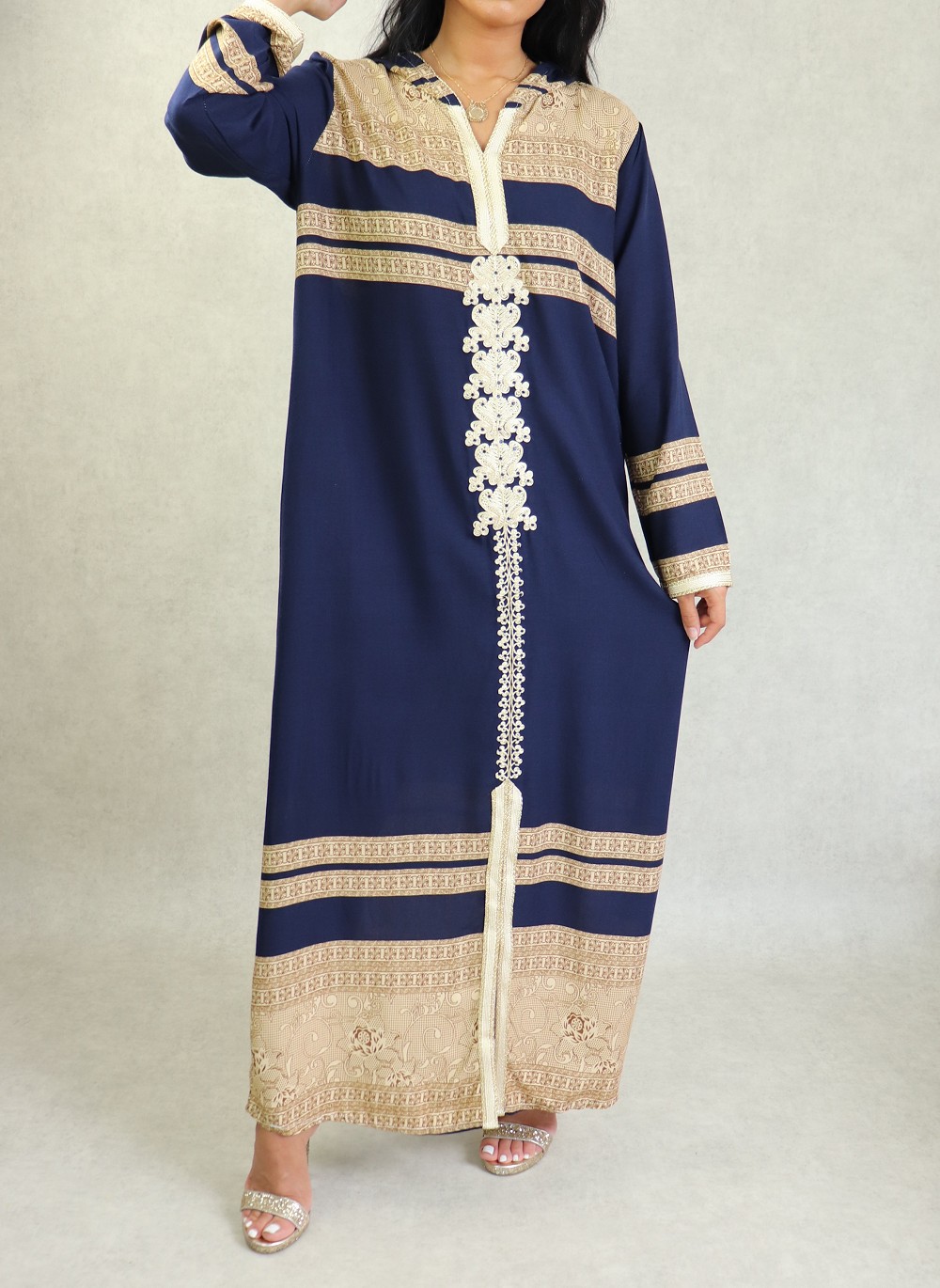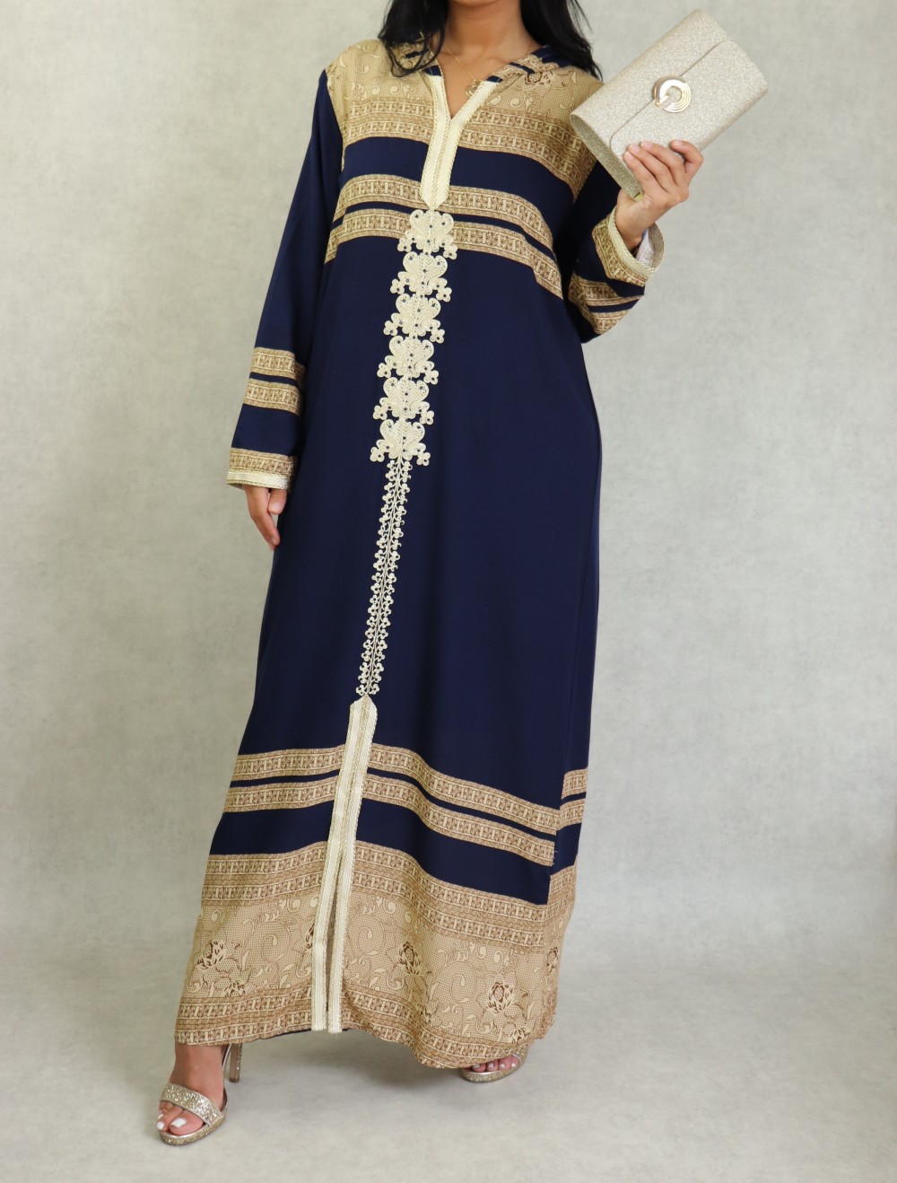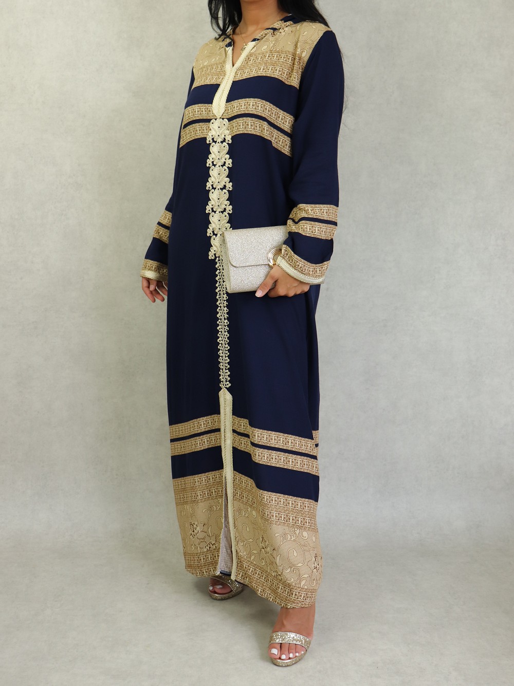 Robe arabe longue a capuche avec broderie et strass pour femme - Couleur Bleu marine