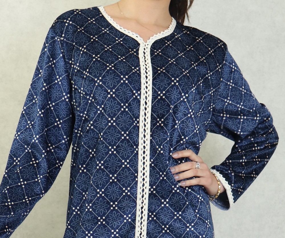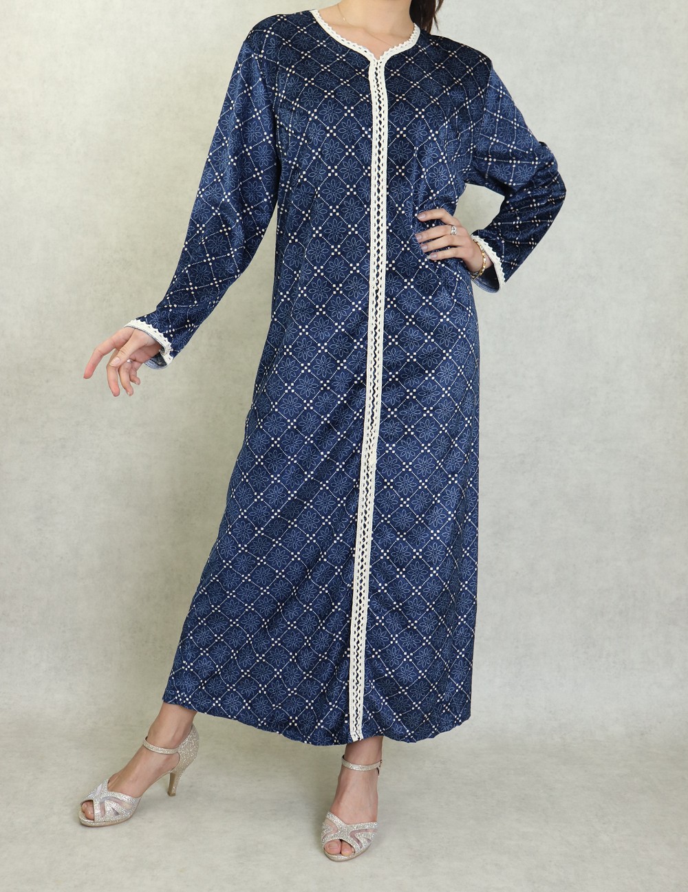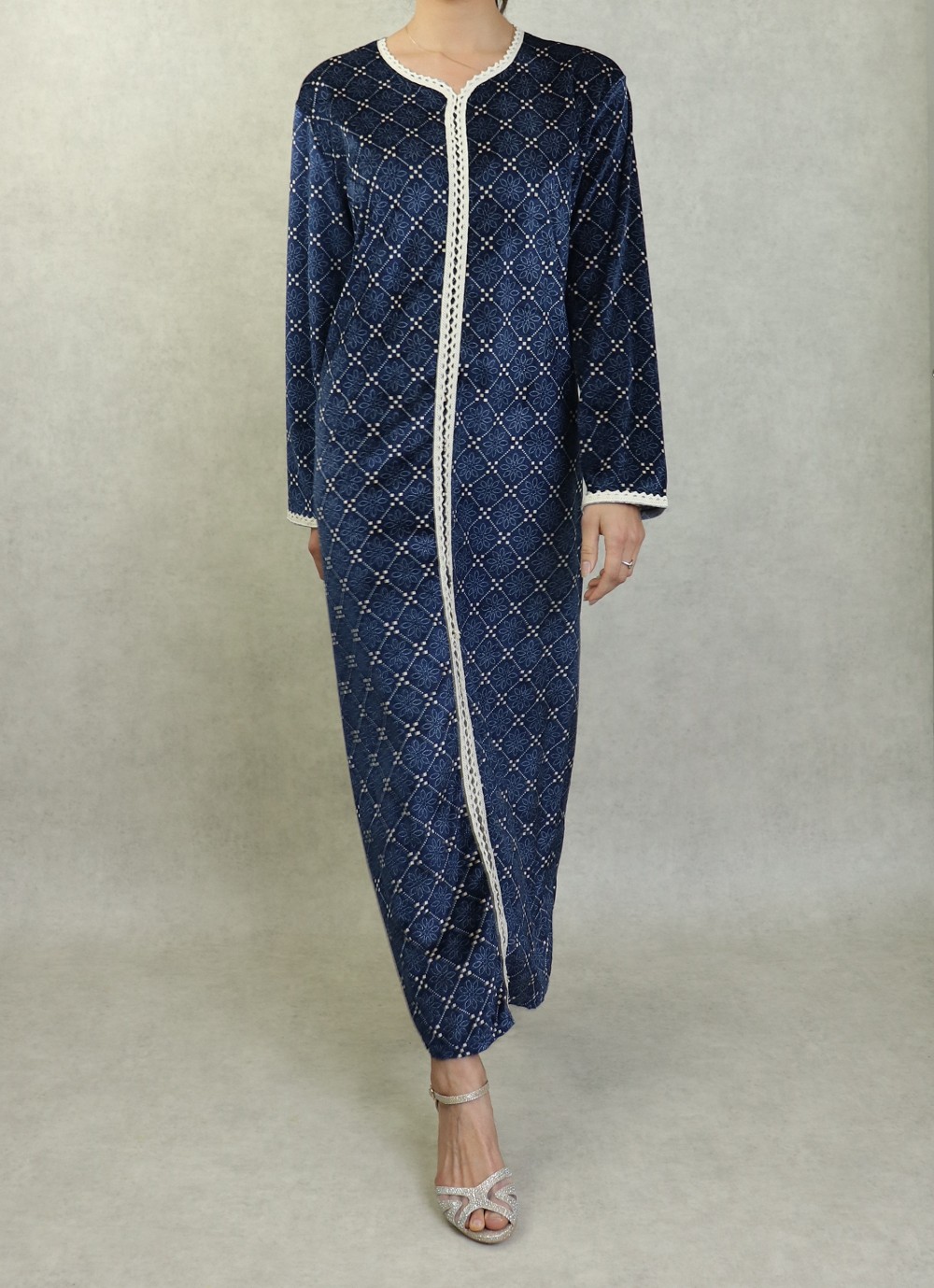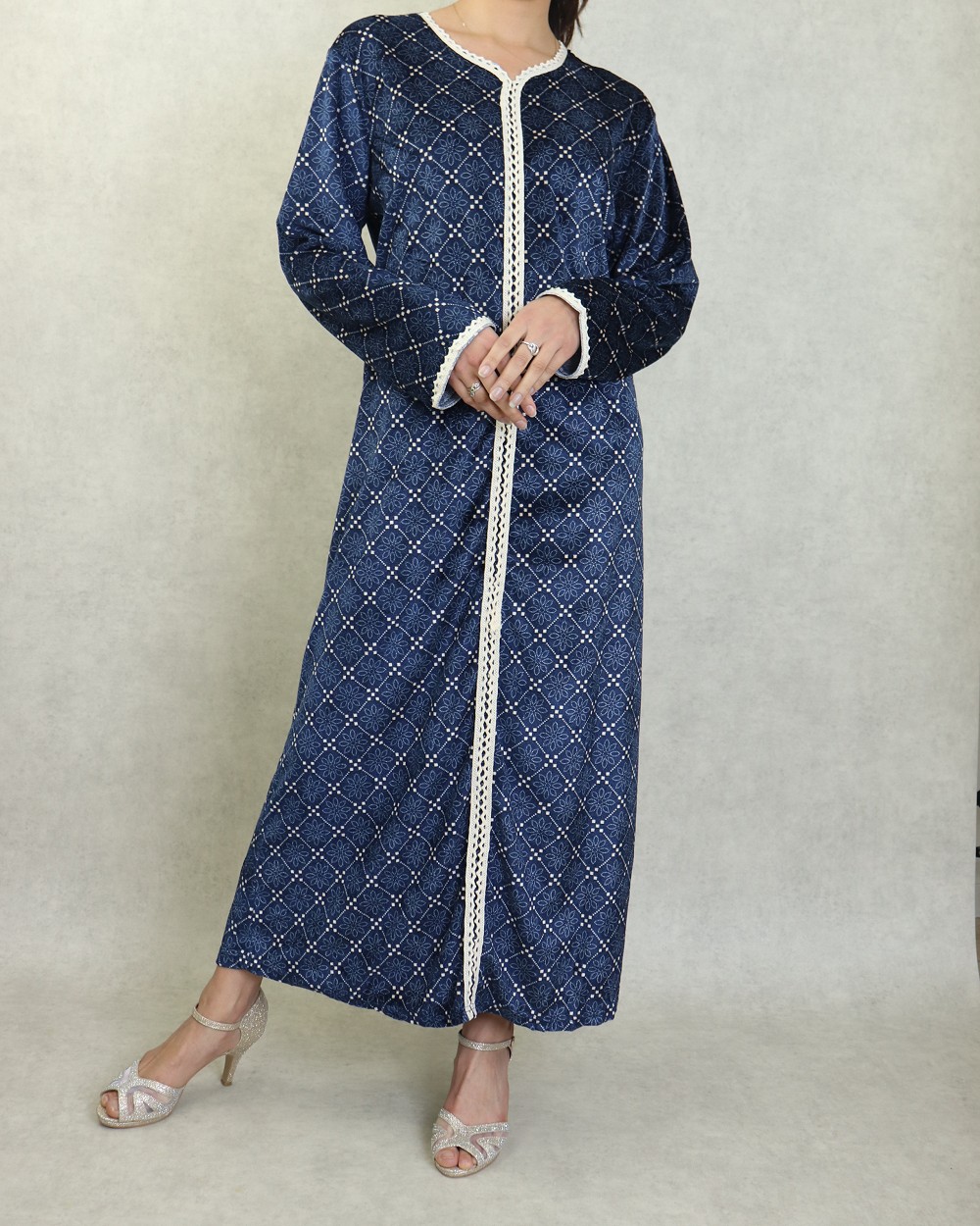 Robe arabe longue en velours à motif avec broderie blanche pour femme (Saison Automne - Hiver) - Couleur Bleu Vetement & Accessoire
