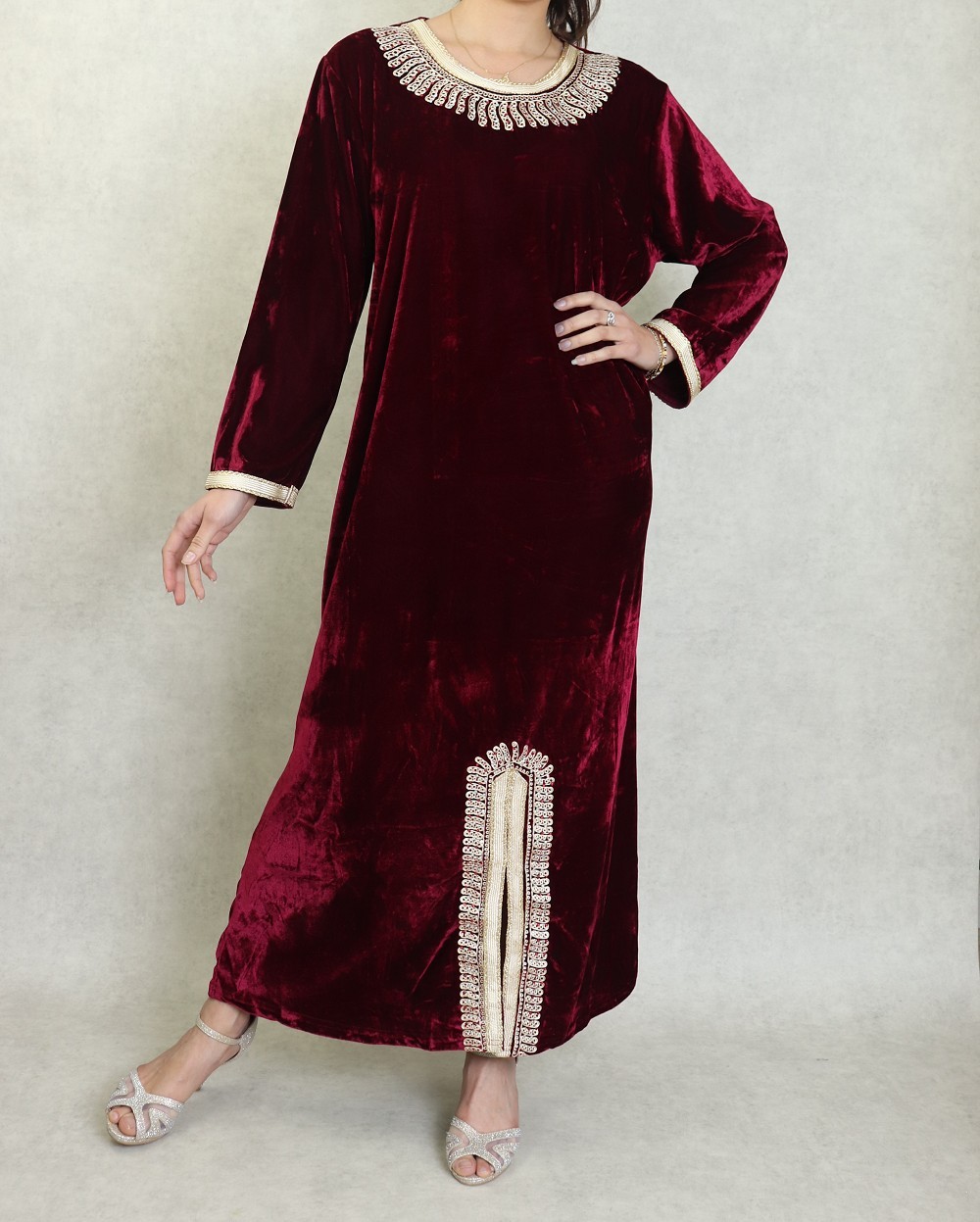 Robe arabe traditionnelle en velours brodee pour femme (Saison Automne-Hiver - Grande Taille disponible) - Couleur Bordeaux