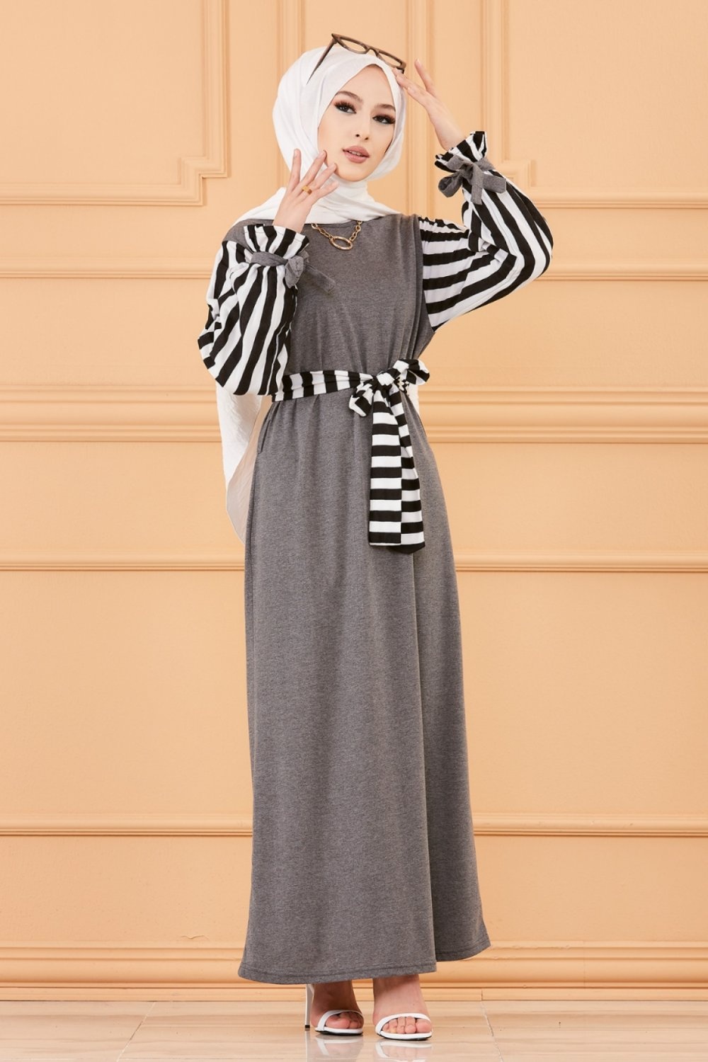 Robe longue à rayures avec ceinture pour femme voilée - Couleur moutarde - REF. 33208 (29.90 €)
