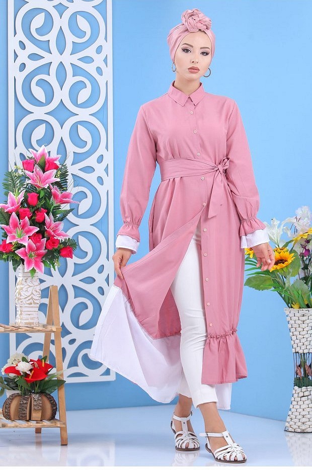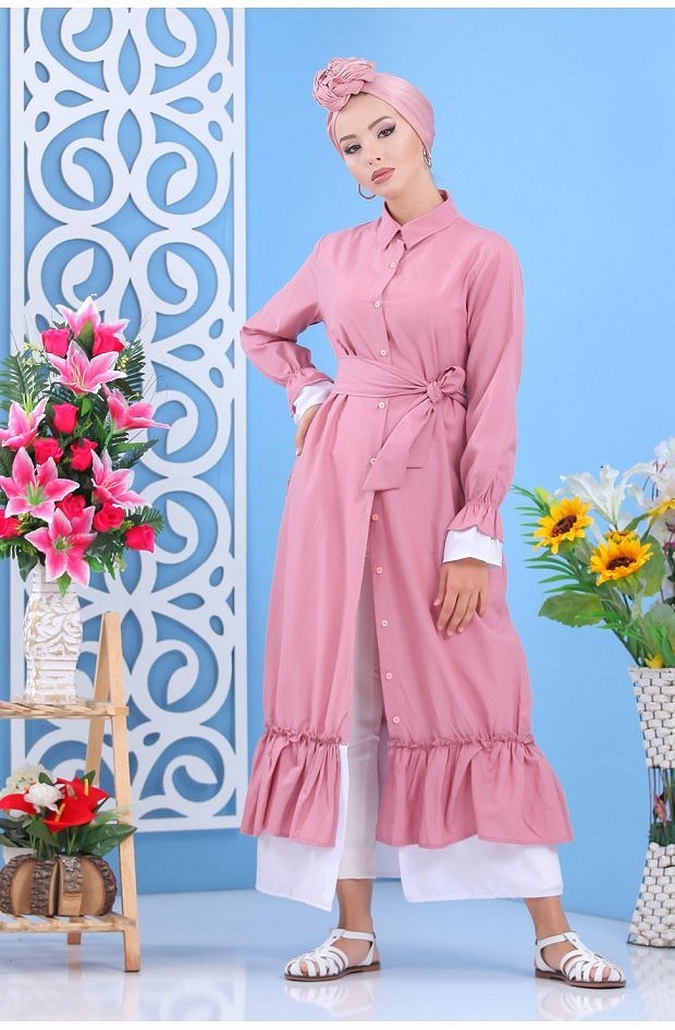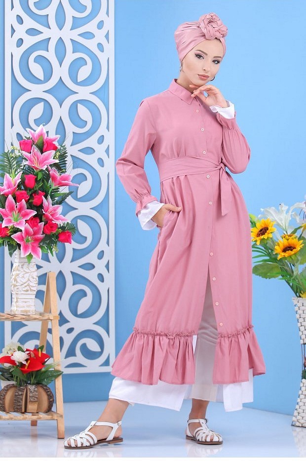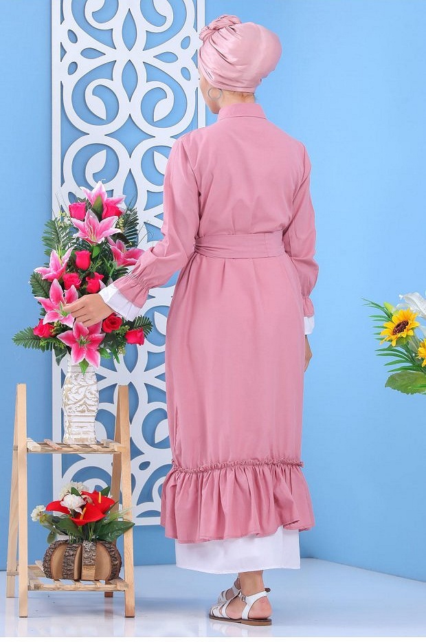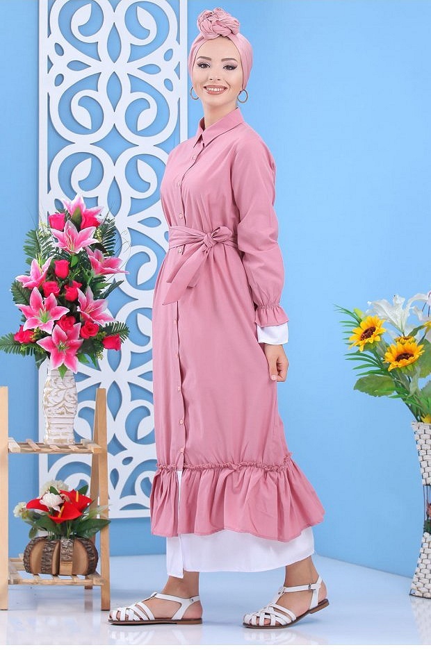 Robe avec ceinture de couleur rose clair (Vetement turque femme moderne)