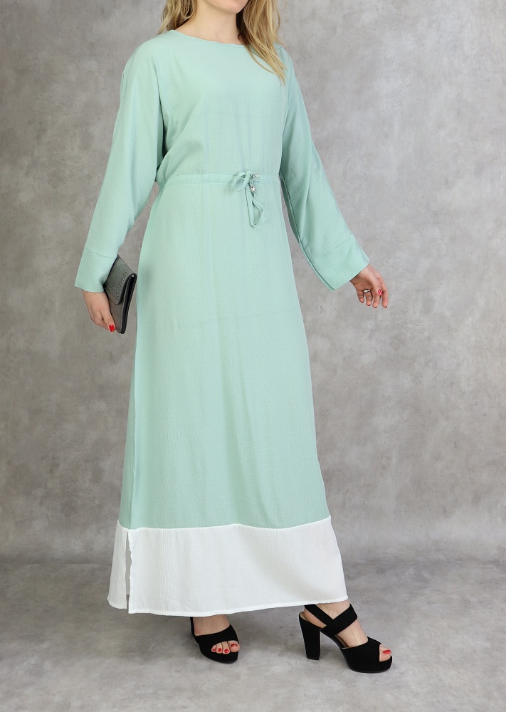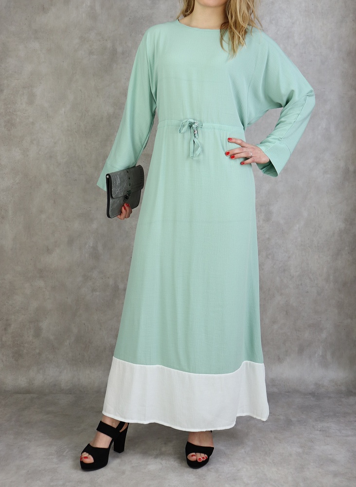 Robe longue, col rond, manches amples, lien de serrage à la taille. Coupe légèrement évasée, tissu léger, effet crêpe.