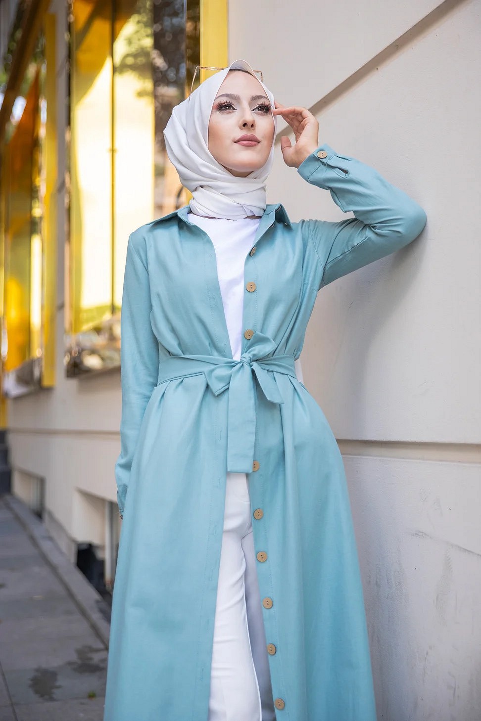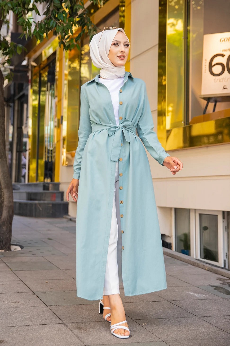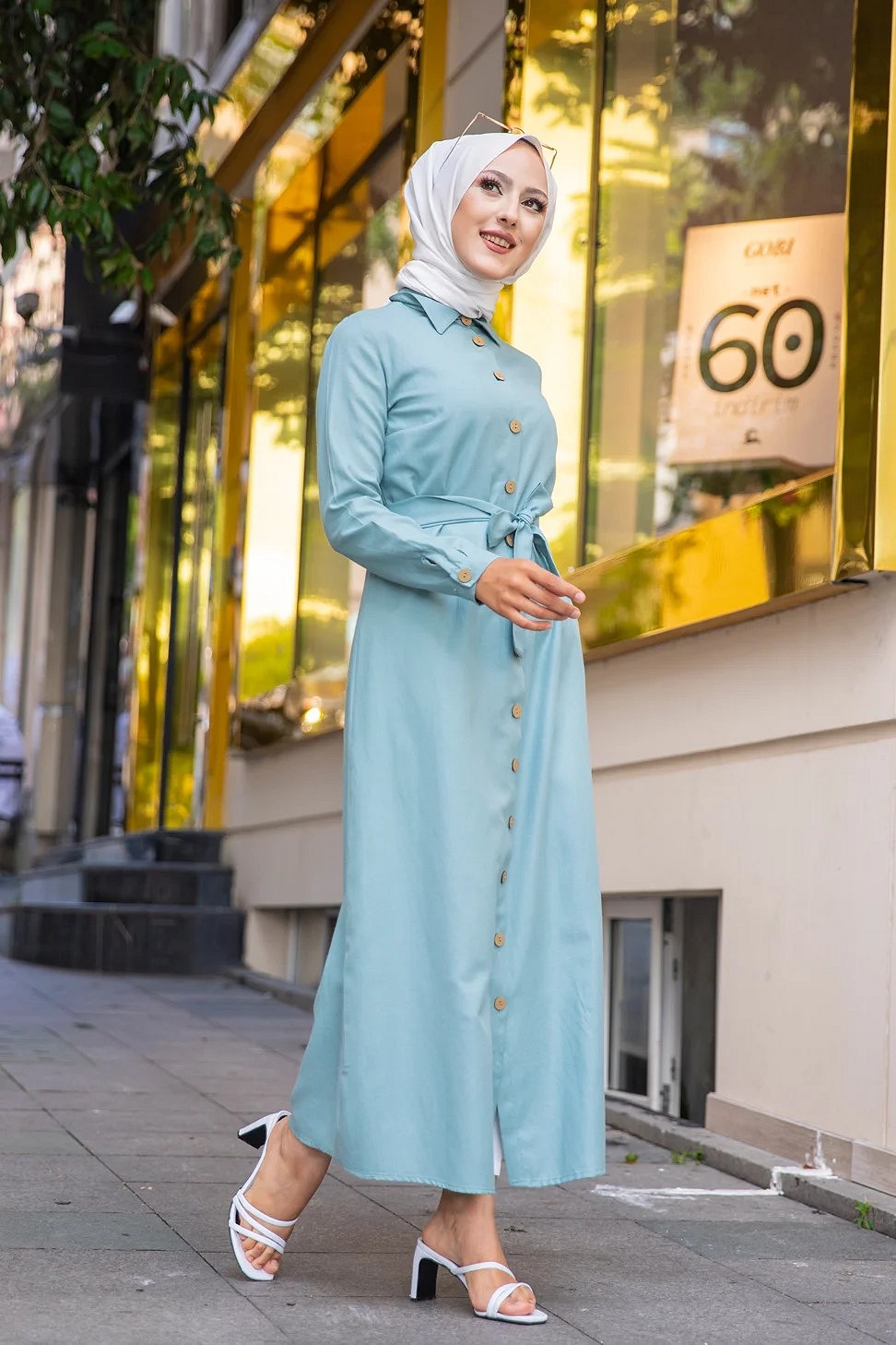 Robe boutonnée avec ceinture pour femme (Vêtement de ville chic pour hijab - Modest Fashion) - Couleur menthe Vetement & Accessoire