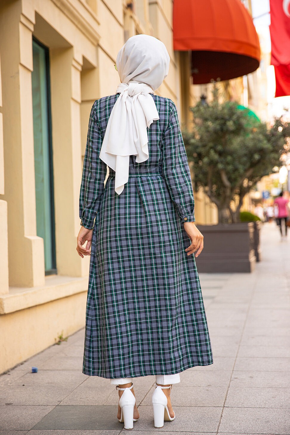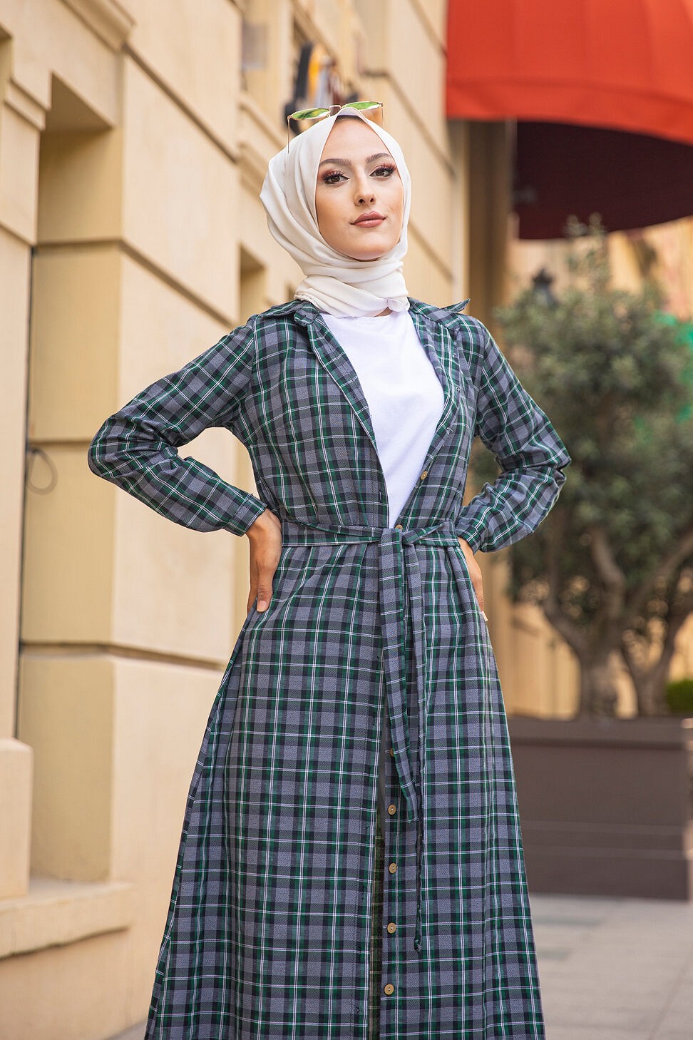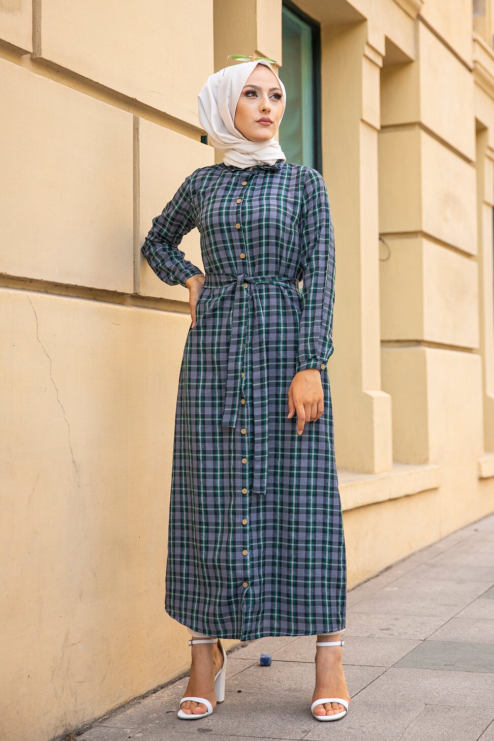 Robe boutonnee ecossaise longue avec ceinture assortie pour femme (Vetement Modest Fashion) - Carreaux verts