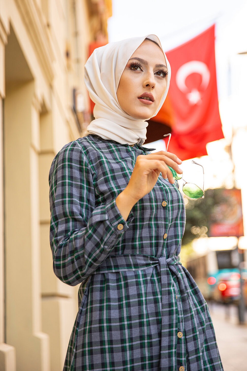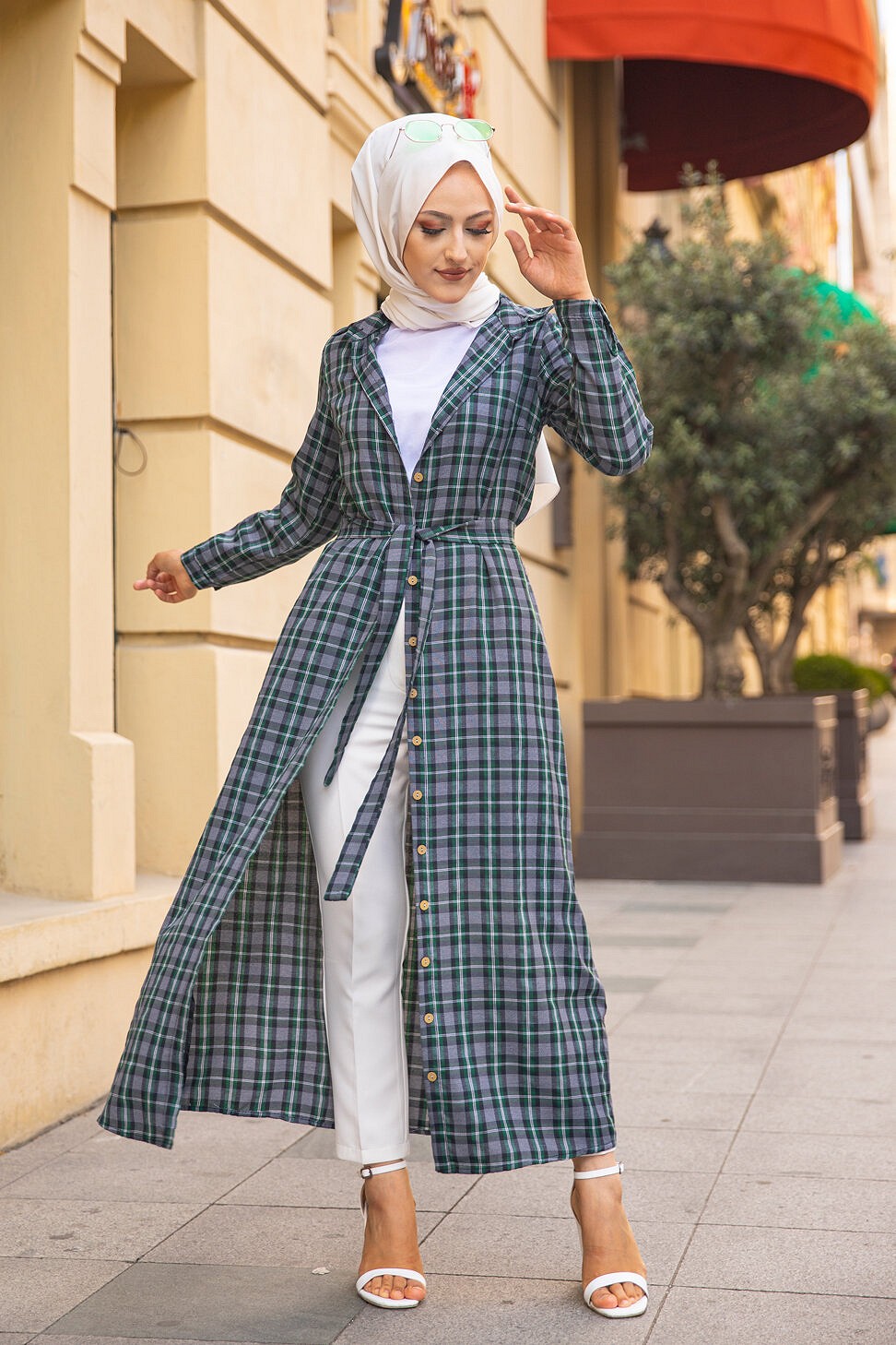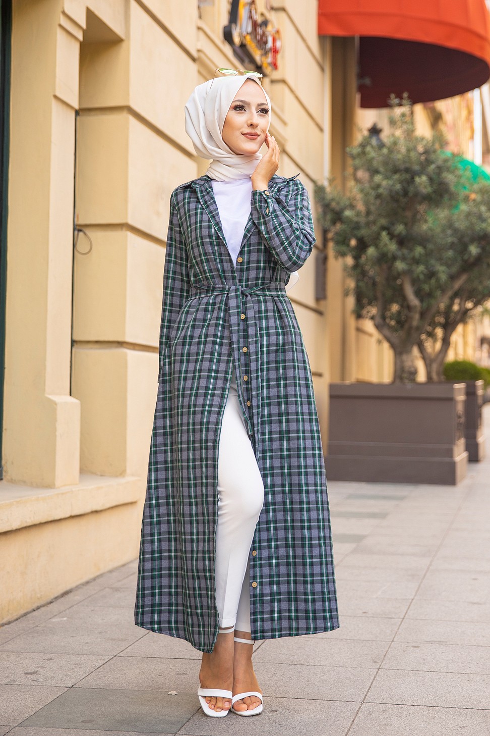 Robe boutonnee ecossaise longue avec ceinture assortie pour femme (Vetement Modest Fashion) - Carreaux verts