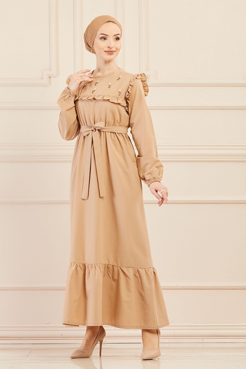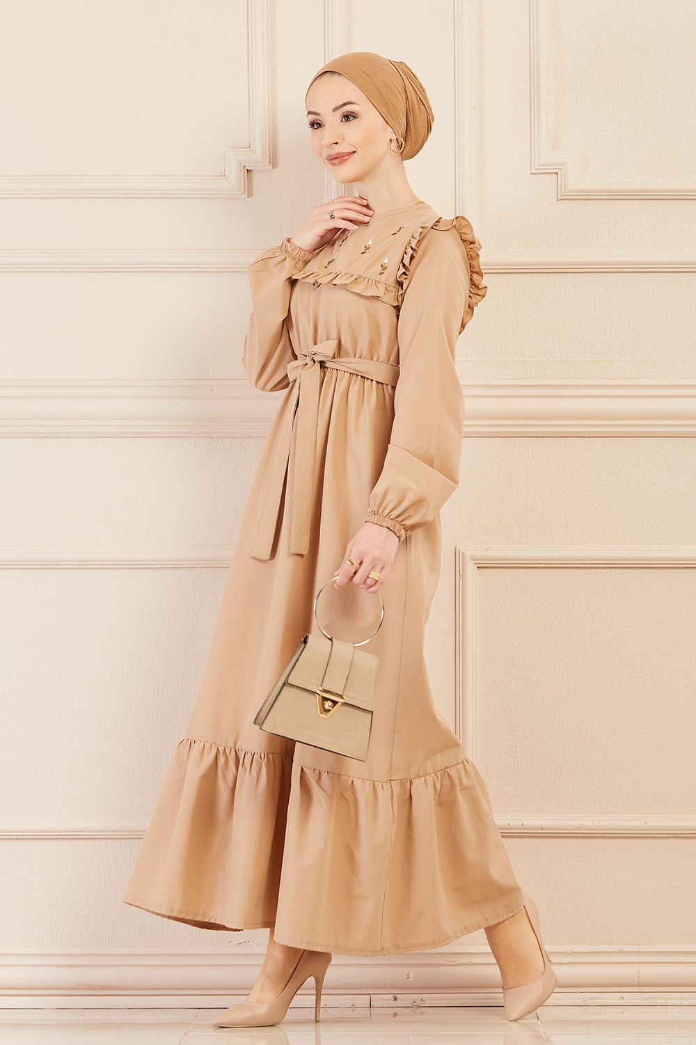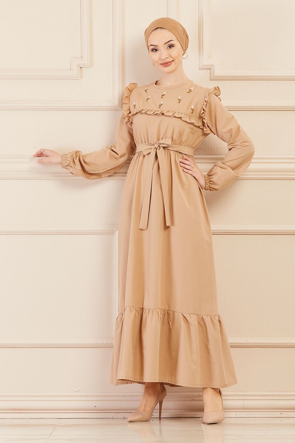 Robe brodee pour femme (Tenue elegante pour hijab) - Couleur beige