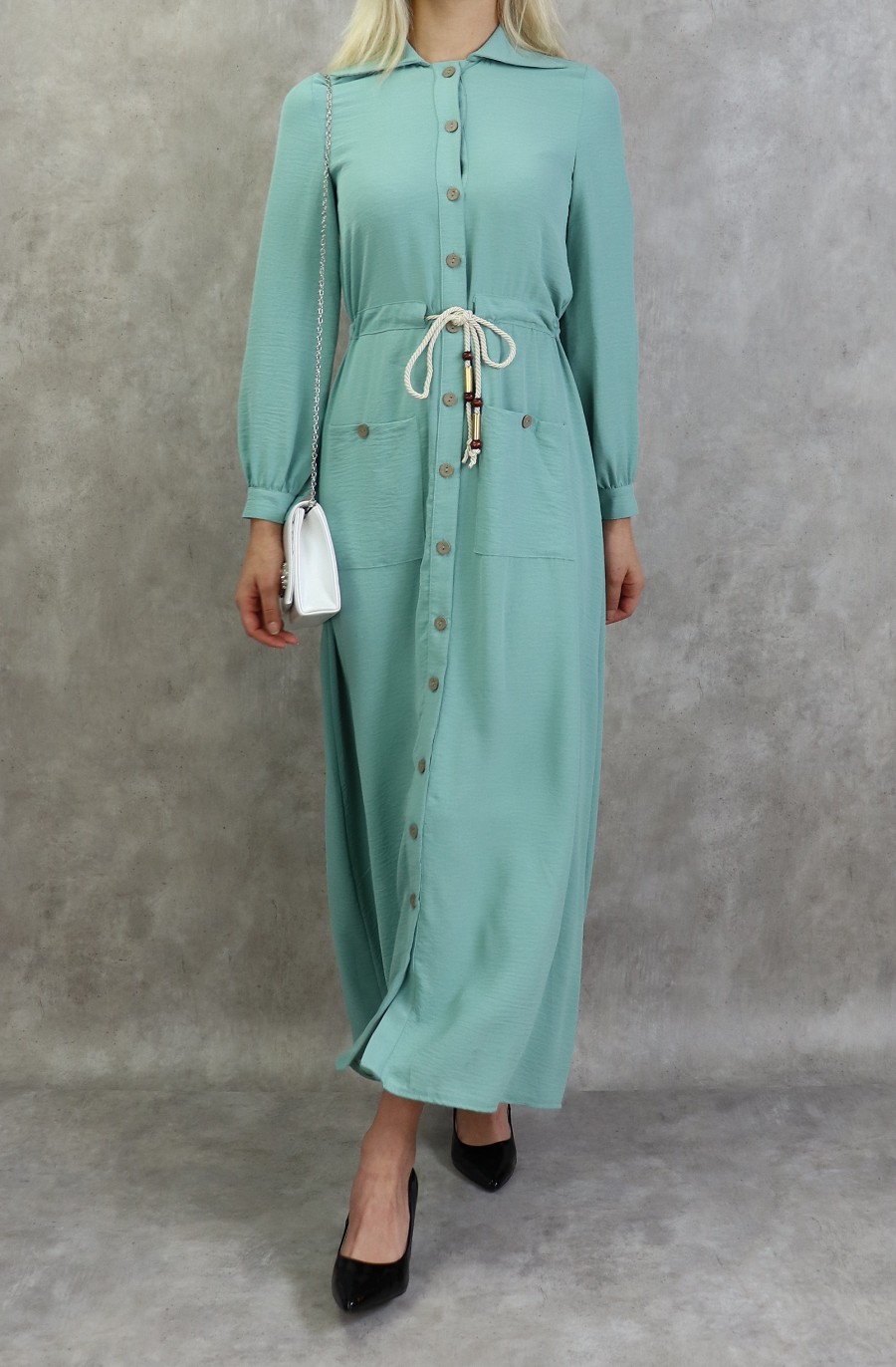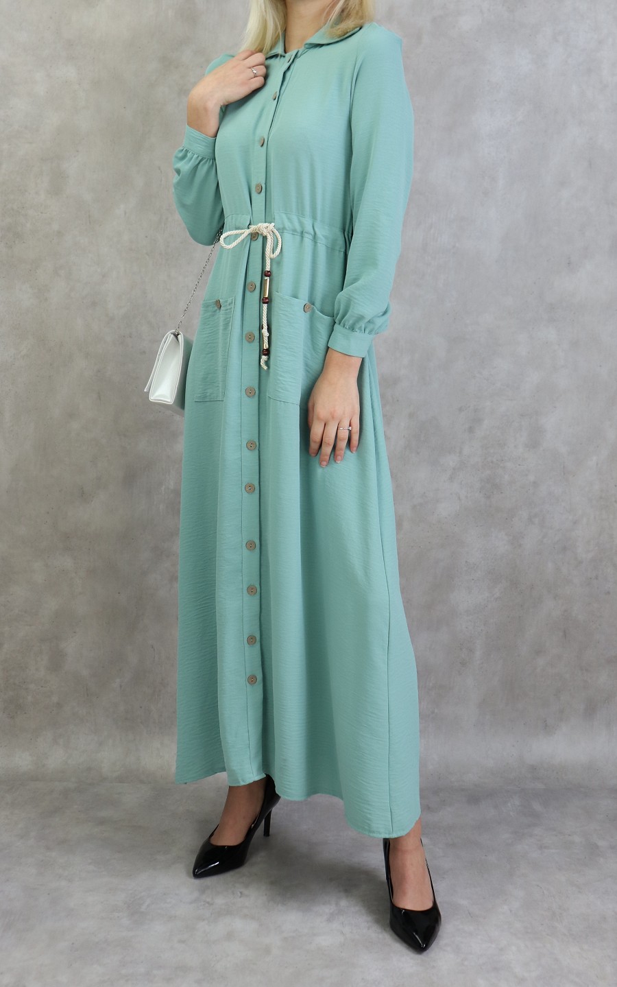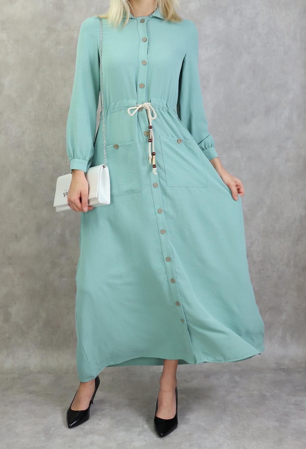 Robe casual chic pour femme - Robe longue boutonnee de couleur vert amande