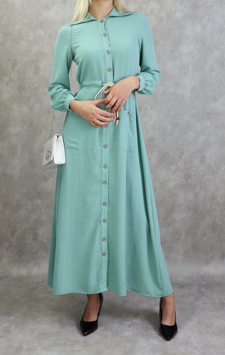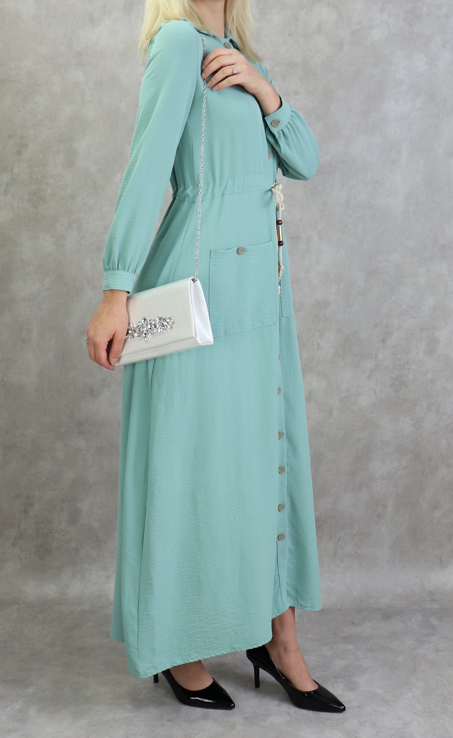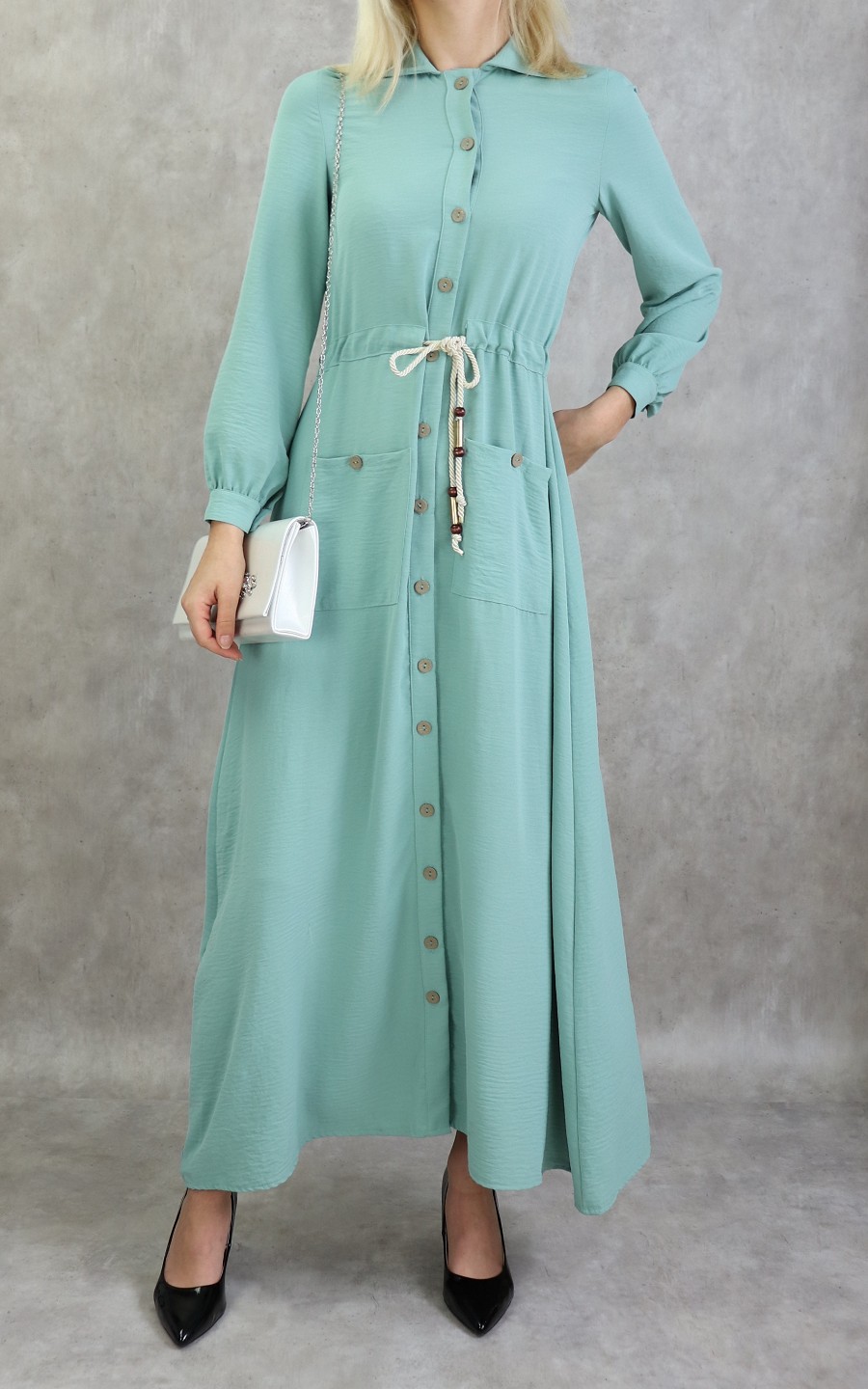 Robe casual chic pour femme - Robe longue boutonnee de couleur vert amande