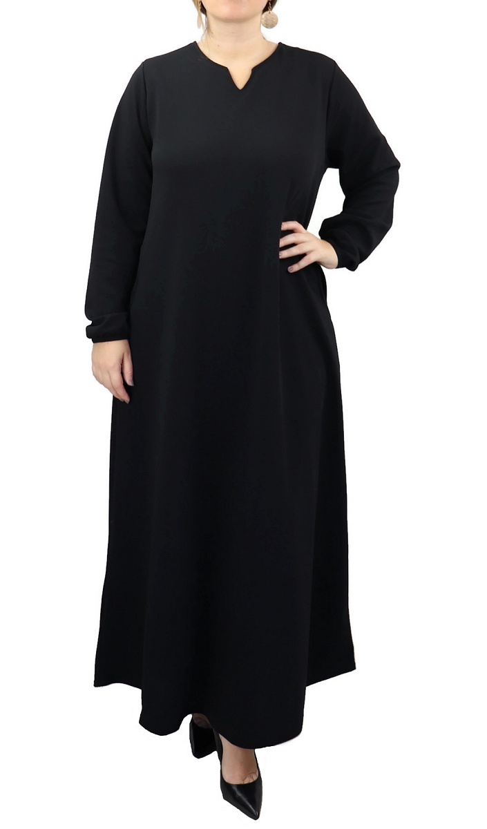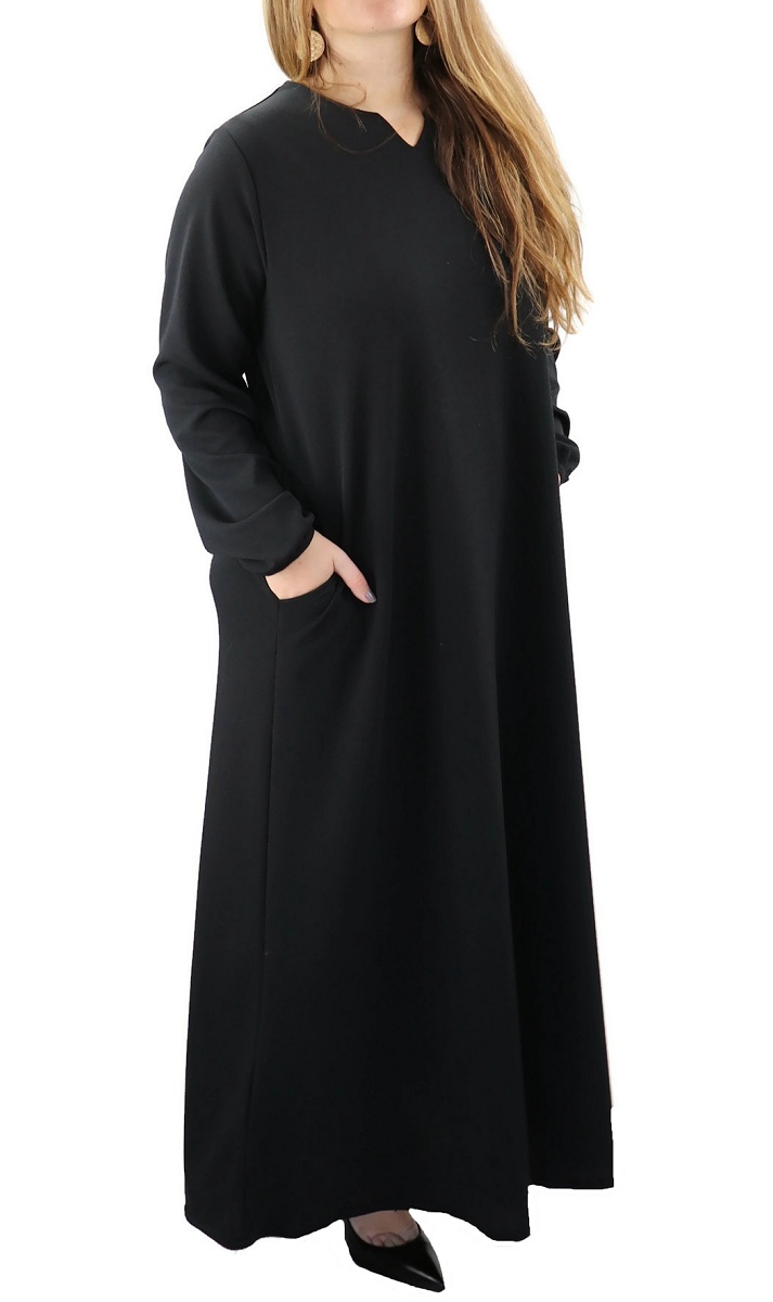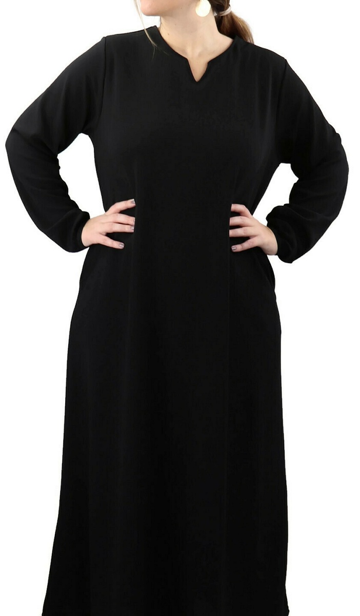 Robe évasée col tunisien, tissu épais non transparent légèrement extensible, poignets élastiques. Deux poches latérales.