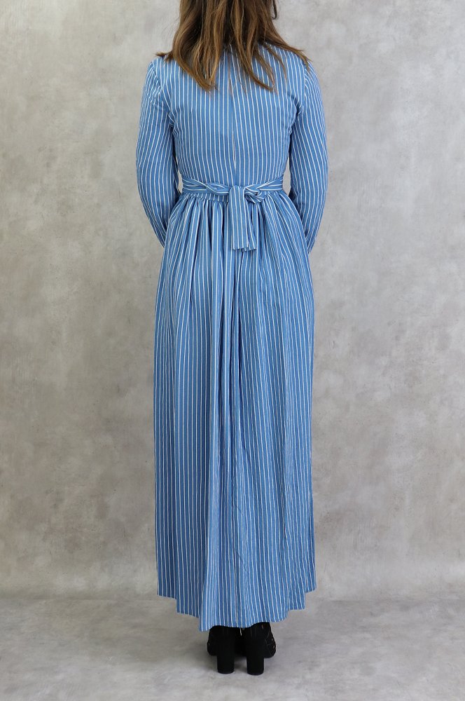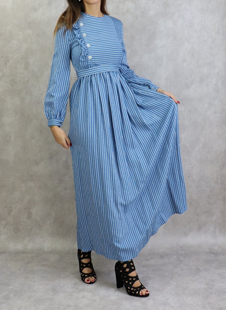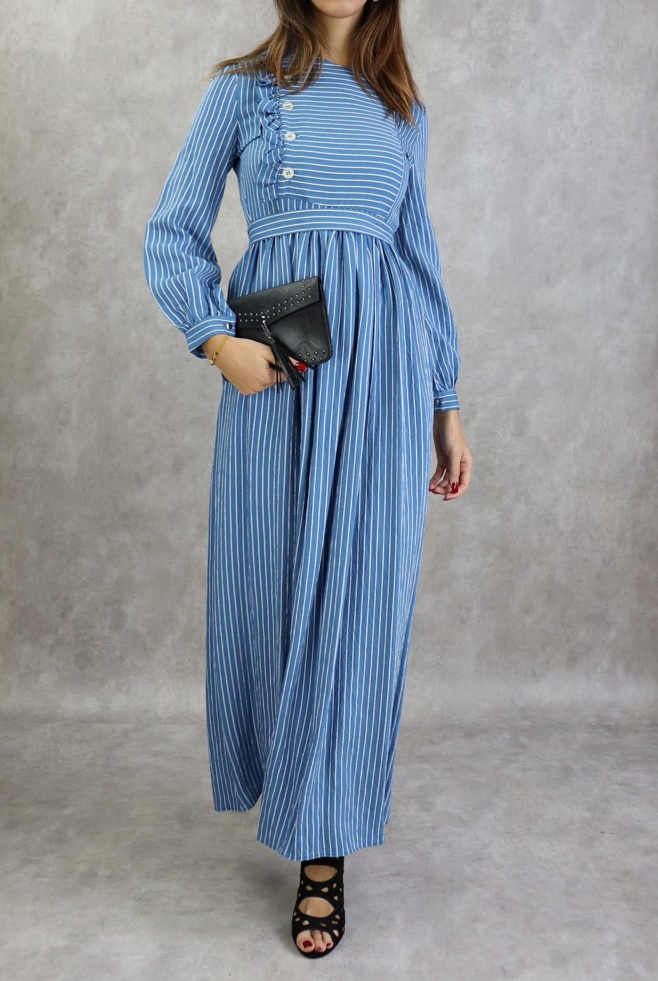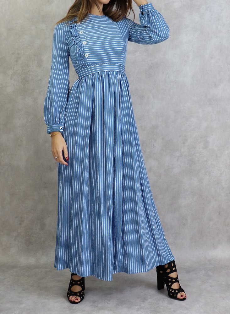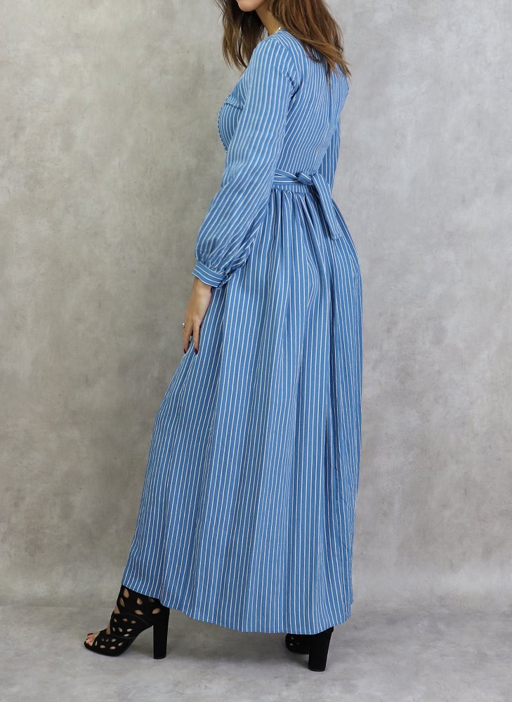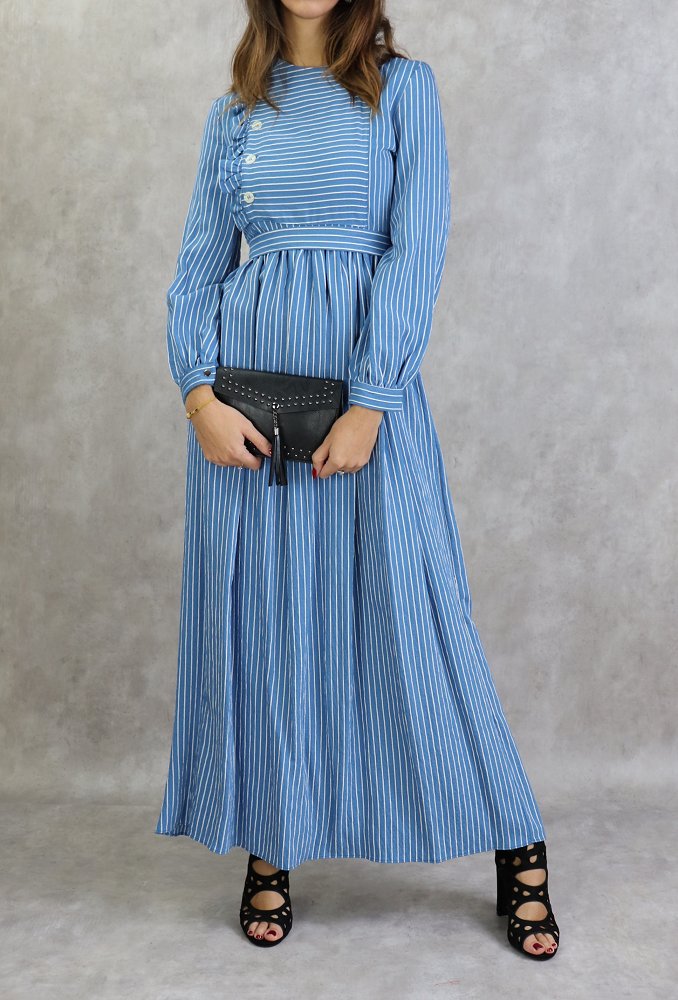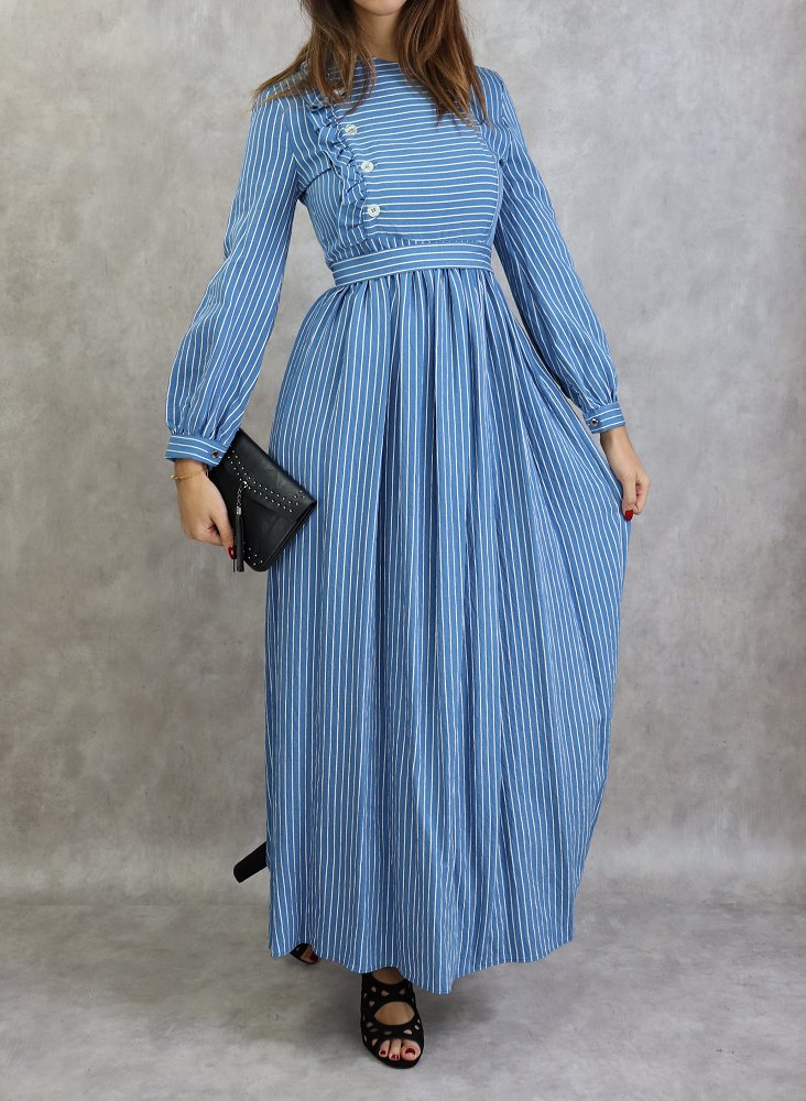 Robe longue décontractée et chic, col rond, fermeture boutons coté droit, manches longues finition bouton sur poignets, taille cintrée et froncée, ceinture à passants assortie, fermeture glissière sur le flanc. Coupe évasée vers le bas, tissu opaque, effet tissé.