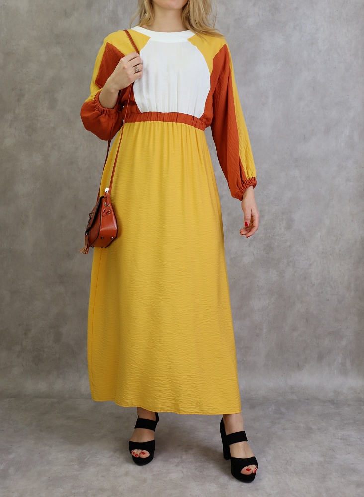 Robe longue, col rond, fermeture bouton au dos, manches finition élastiques aux poignets, taille élastique. Coupe légèrement évasée, tissu doux et léger.