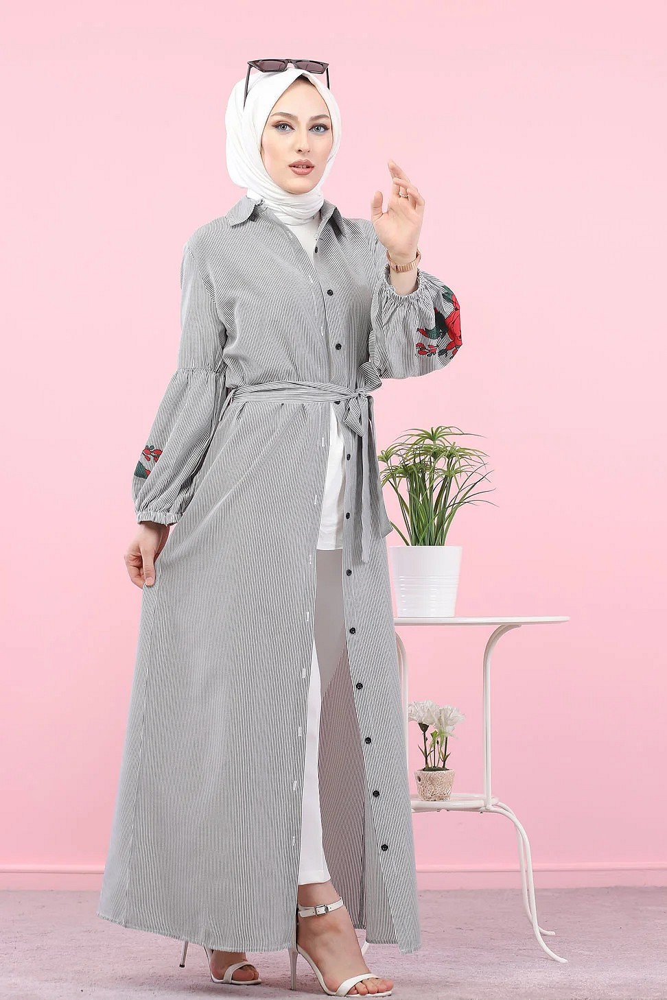 Robe chemise imprimée à rayures (Vetement hijab femme voilée) - Couleur gris et blanc Vetement & Accessoire