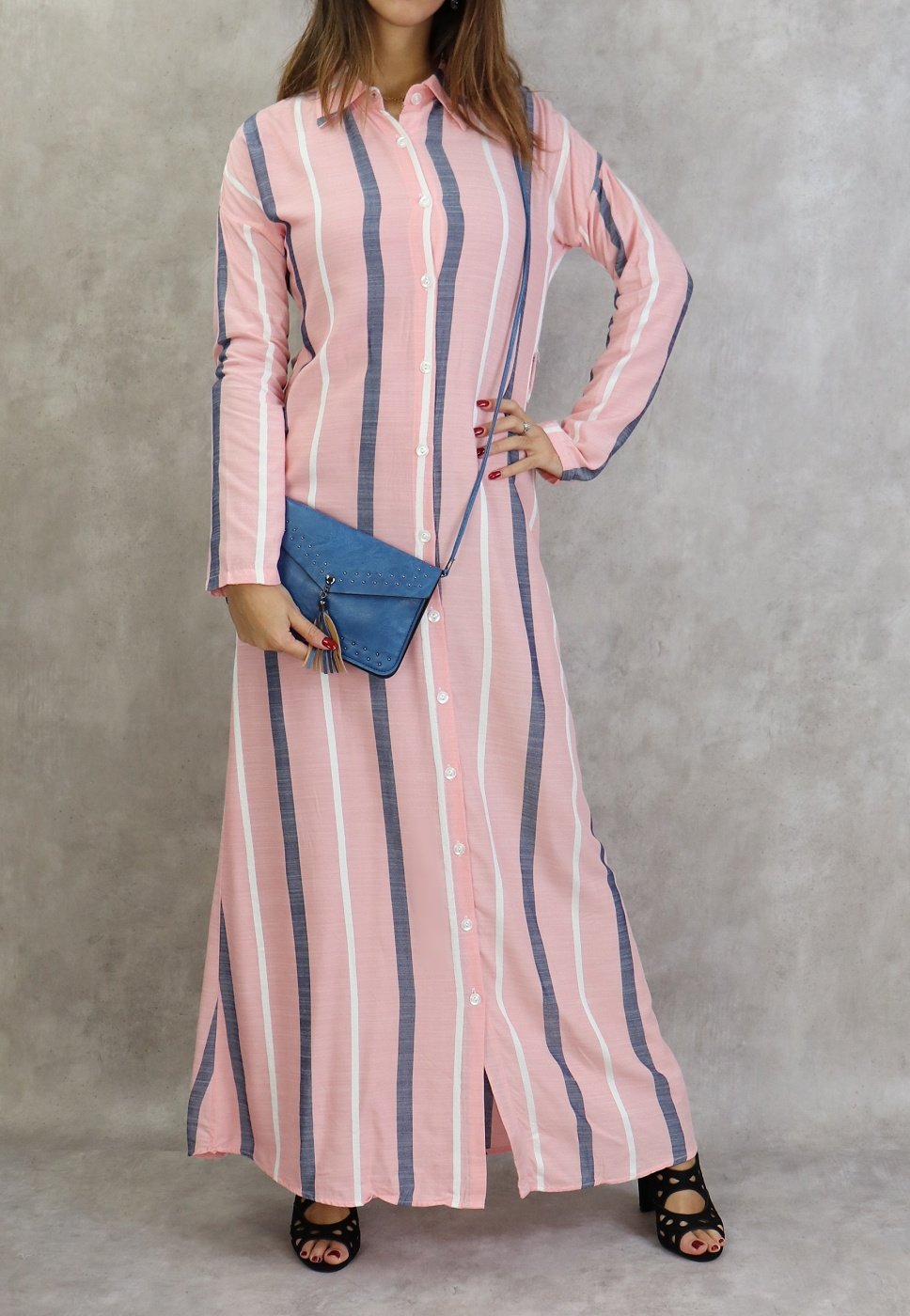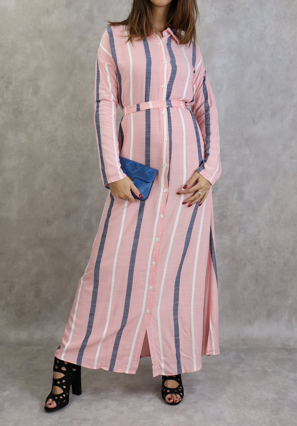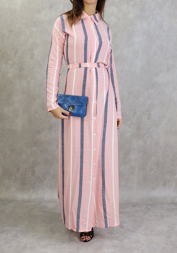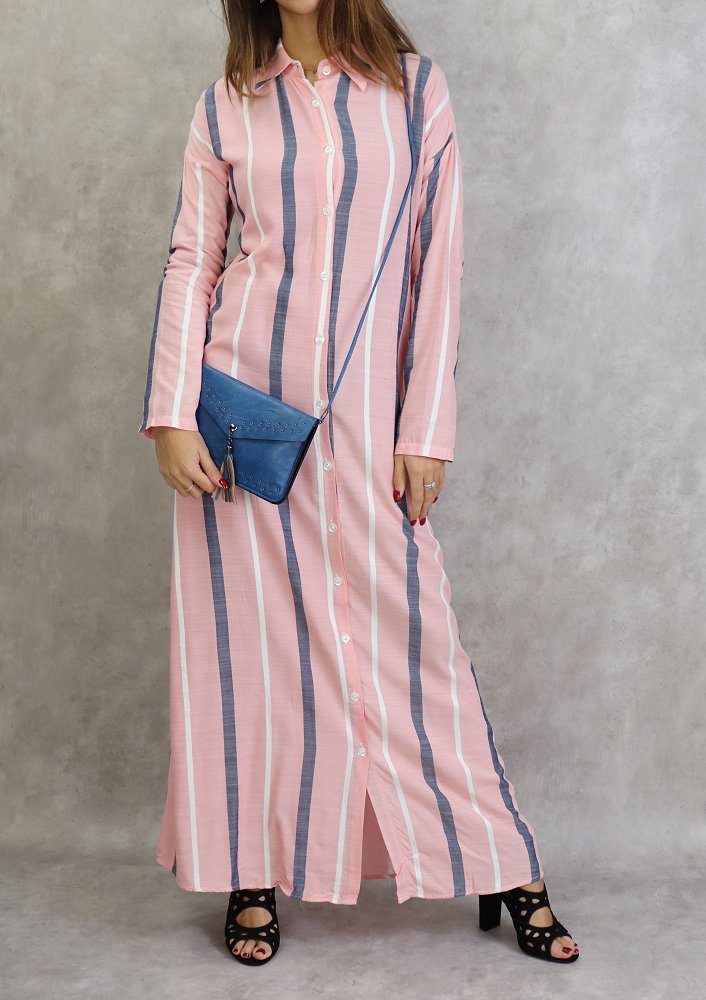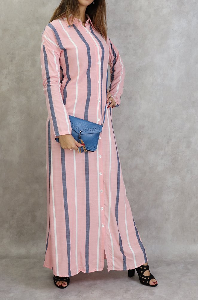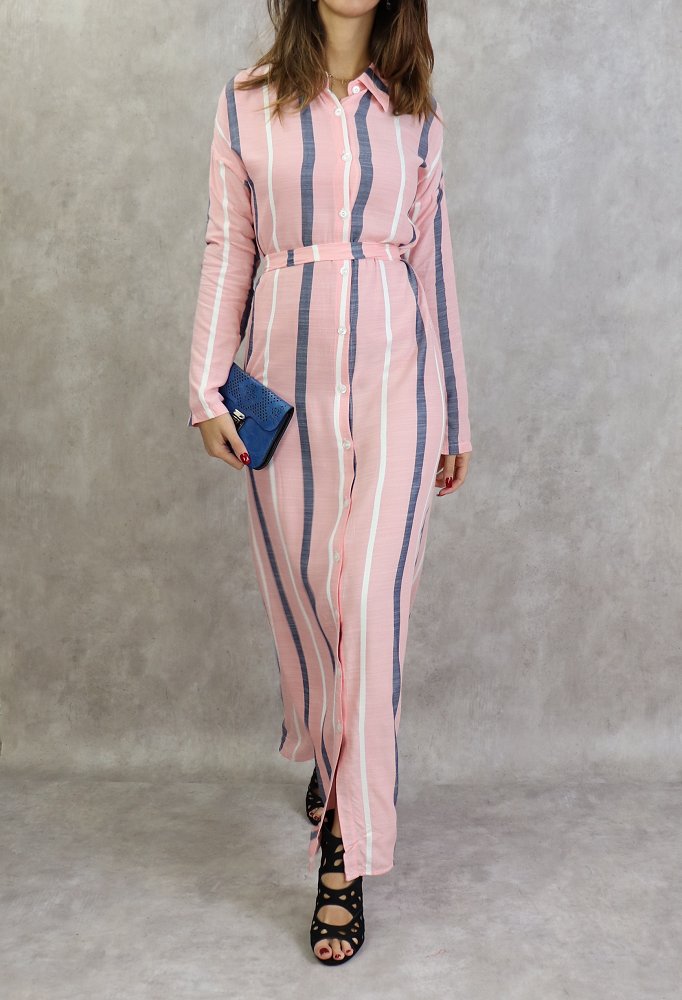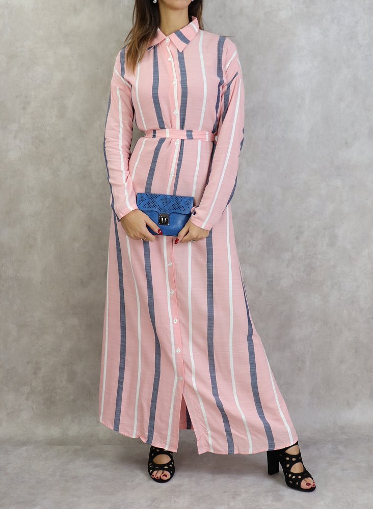 Robe-chemise longue boutonnée tissu en coton à rayures - Couleur rose Vetement & Accessoire