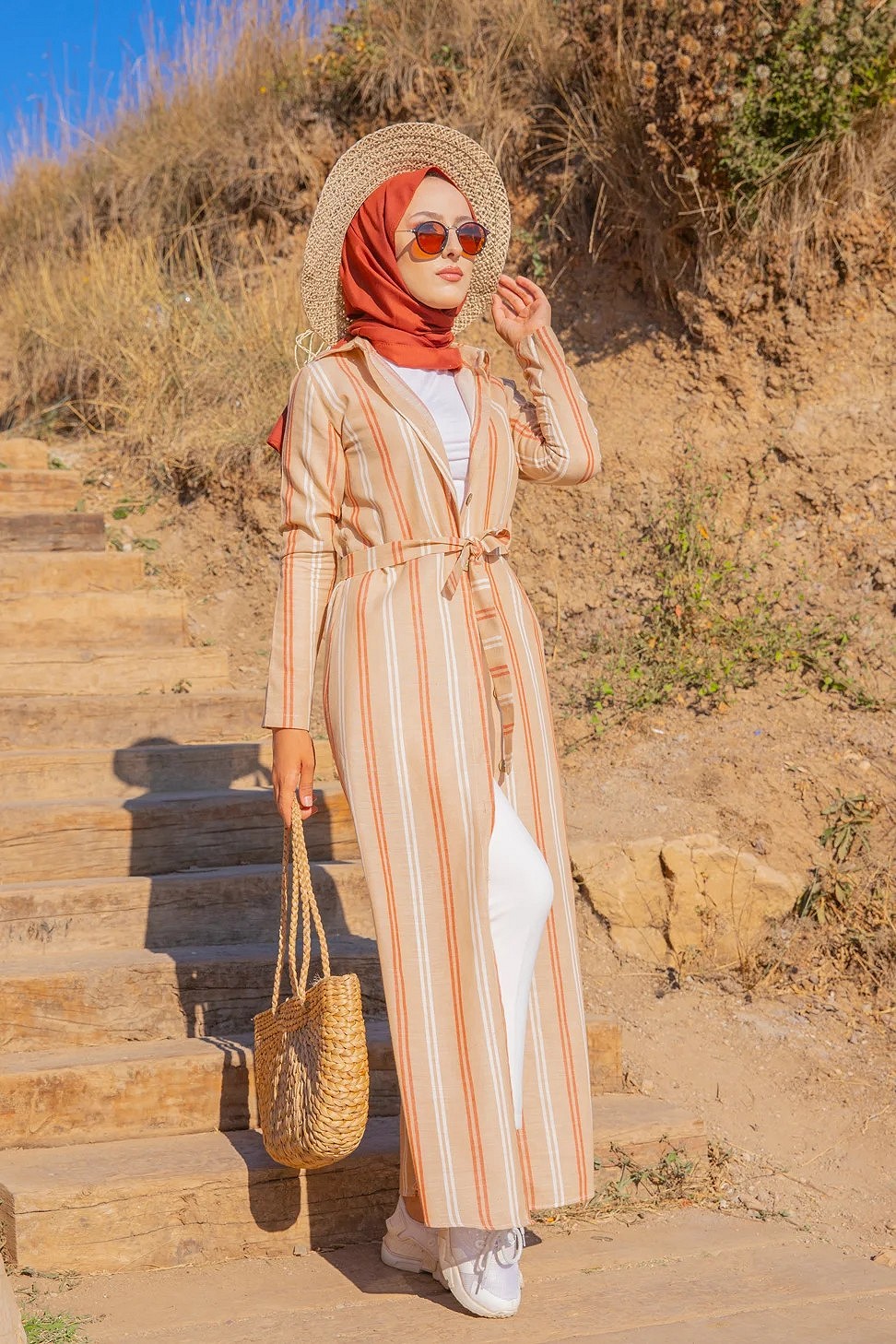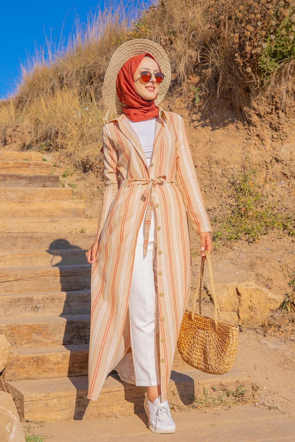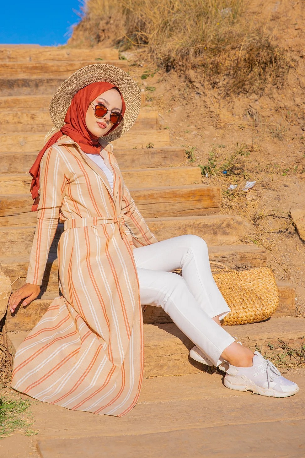 Robe chemise longue d'ete a rayures (Vetement d'ete pour femme voilee) - Couleur beige, rouille et blanc