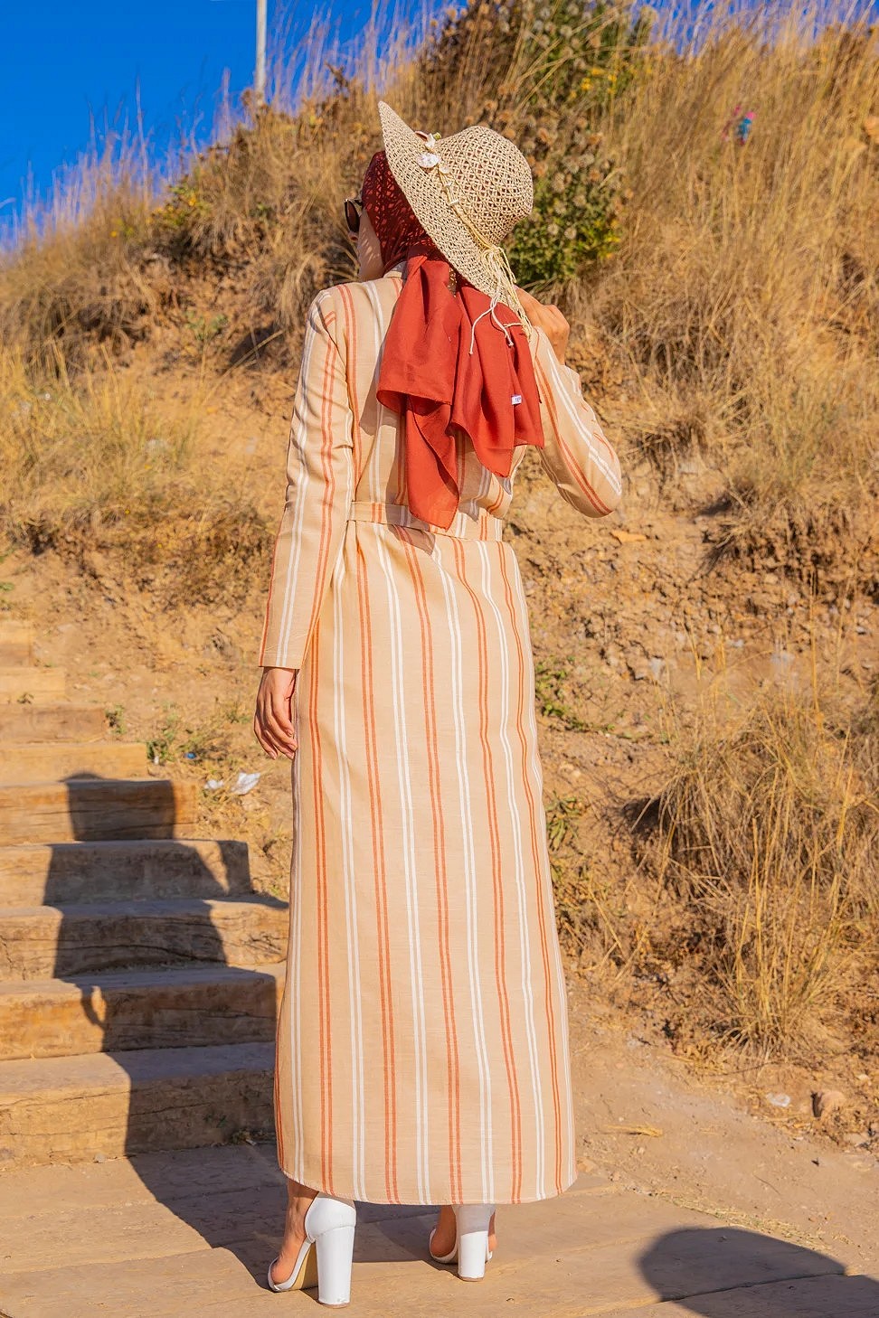 Robe chemise longue d'été à rayures (Vetement d'été pour femme voilée) - Couleur beige, rouille et blanc Vetement & Accessoire