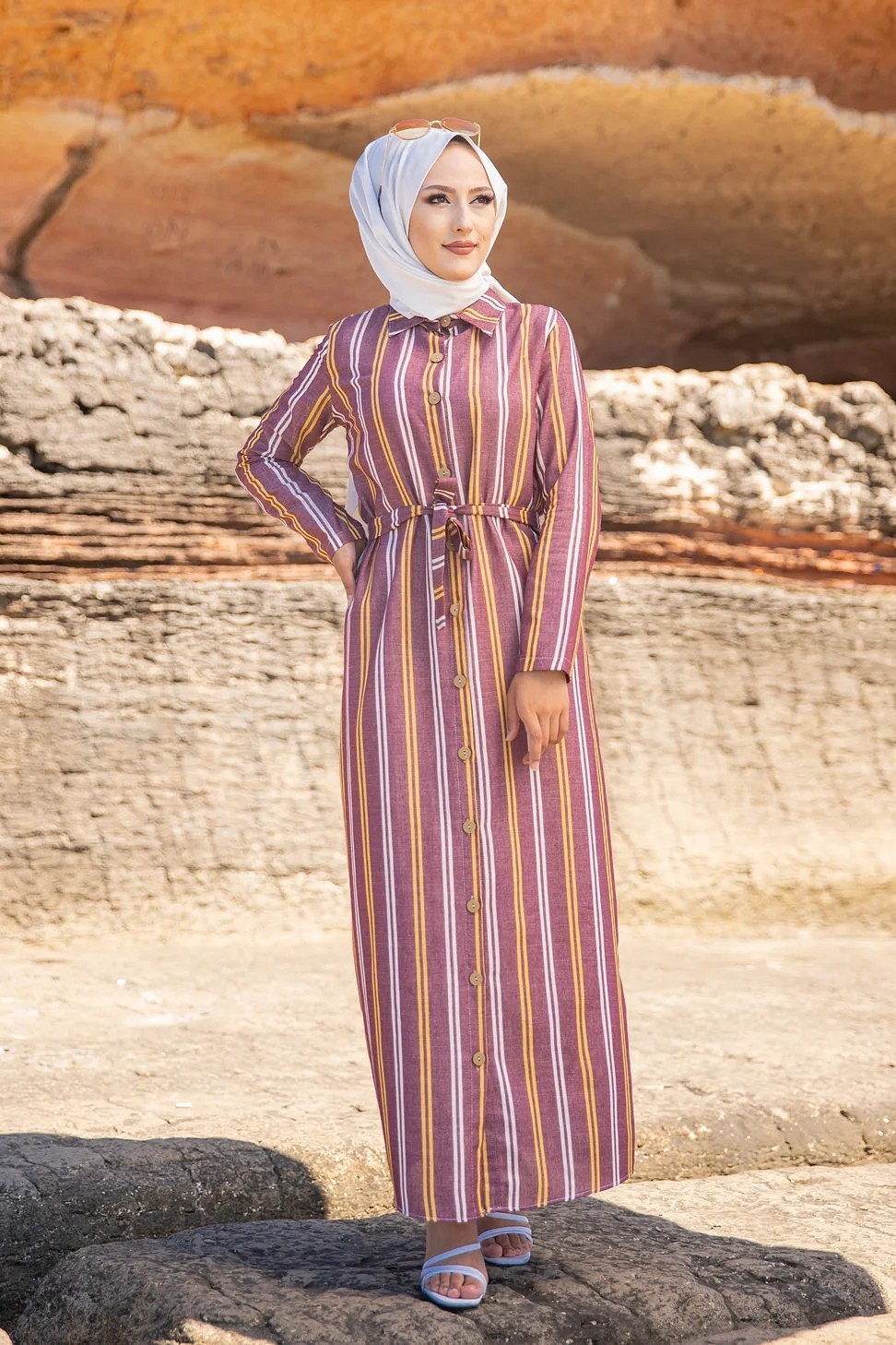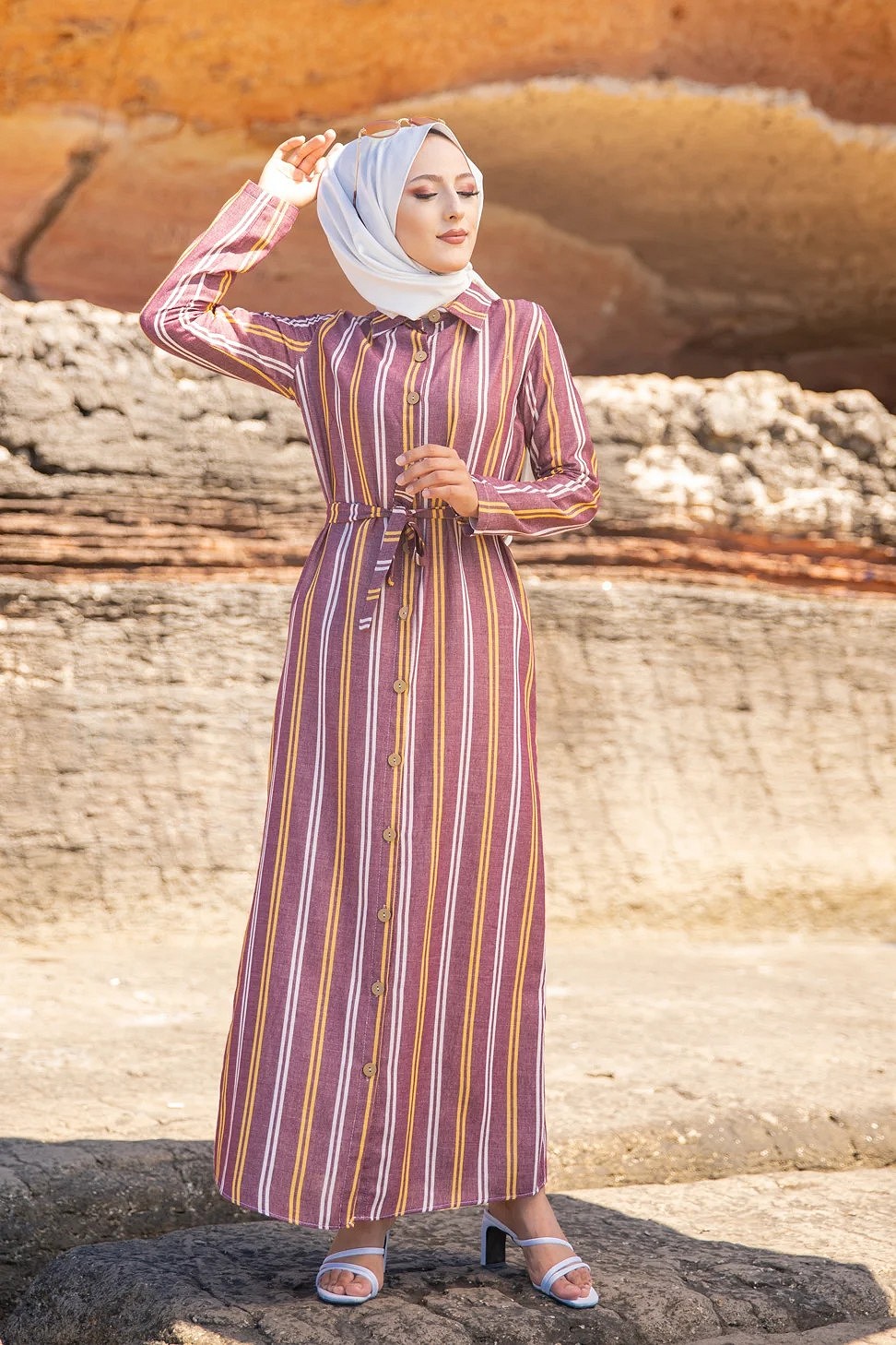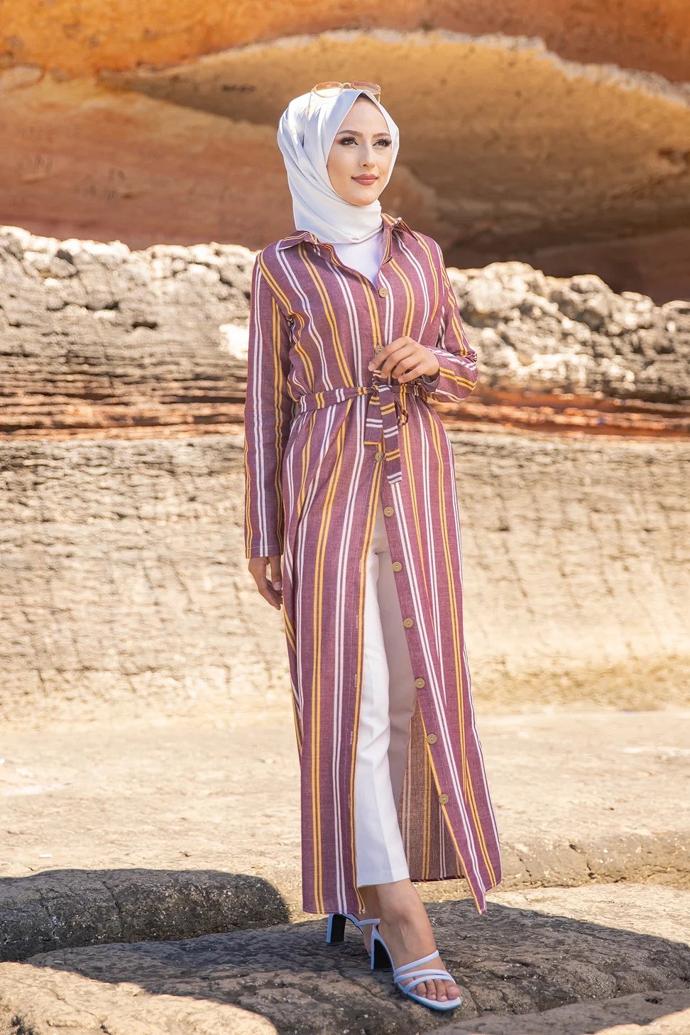 Robe chemise tres longue a rayures (Vetement femme voilee chic) - Couleur bordeaux, rouille et blanc